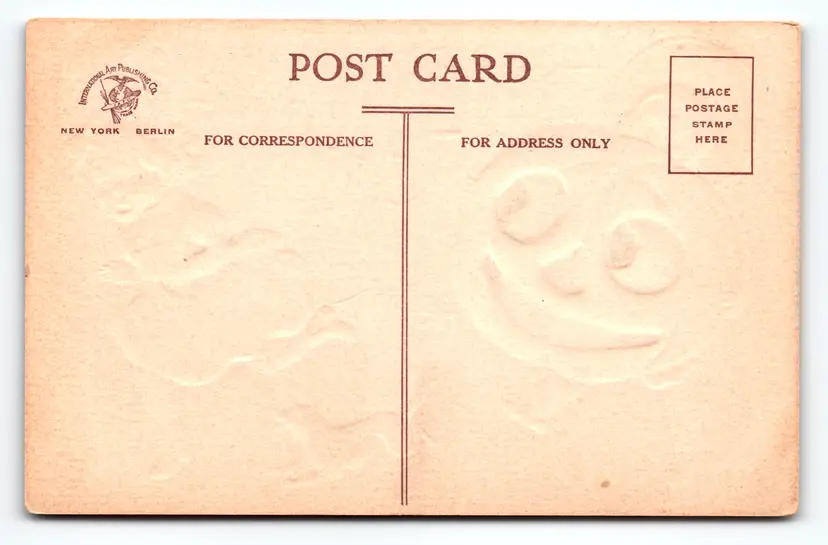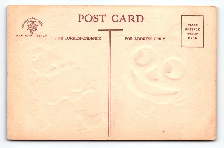 Produced by the International Art Publishing Co. of New York and Berlin, this postcard is an original printed lithograph from the Divided Back era (1907-1915), measuring the standard 5.5 x 3.5 inches. The back is divided for correspondence and address with the publisher's logo. The embossed details add texture and depth to the card, enhancing its collectible appeal. This piece is a wonderful example of early American holiday-themed postcards, perfect for collectors of vintage ephemera or Halloween memorabilia.