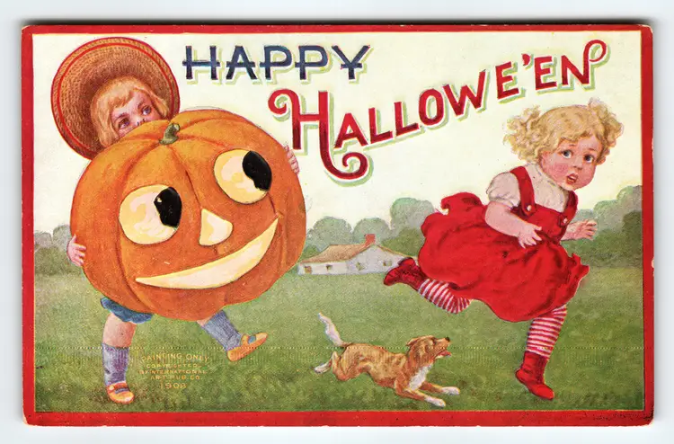 This charming vintage Halloween postcard from 1909 depicts two children in playful costume with one carrying a large jack-o'-lantern pumpkin and the other running alongside a small dog. The colorful lithograph features classic early 20th-century illustration style with vibrant reds, oranges, and greens. The phrase "Happy Hallowe'en" is prominently displayed in whimsical lettering across the top.