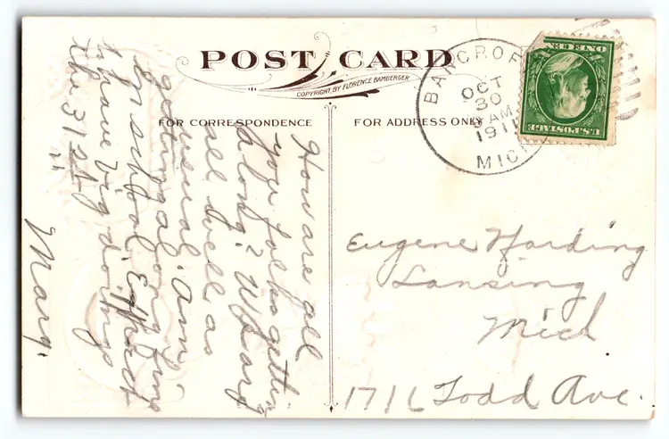 Measuring the standard 5.5 x 3.5 inches, this original paper postcard is a fine example of holiday-themed ephemera from the 1907-1915 period. The bright colors and detailed printing highlight the lithographic technique popular in that time frame. Collectors will appreciate the historic postmark dated October 30, 1911, from Bangor, Michigan, as well as the original one-cent green postage stamp. This postcard offers a delightful glimpse into early American Halloween traditions and is a wonderful addition for vintage postcard and holiday memorabilia enthusiasts.