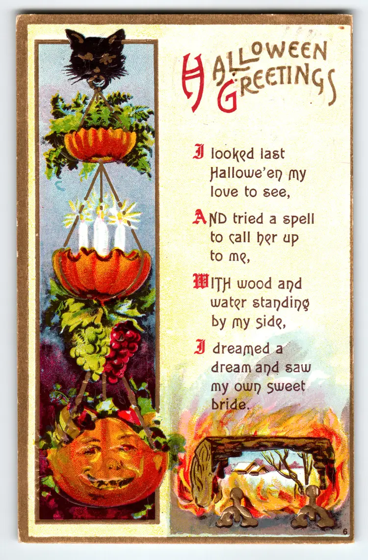 This charming vintage Halloween postcard, copyrighted by Florence Bamberger, features a classic 1911 lithograph design typical of early 20th century divided back postcards. The artwork depicts a whimsical Halloween scene with a grinning jack-o'-lantern, glowing candles, hanging black cat, lush grapevine details, and a cozy fire with a scenic winter view. The poem on the card adds a romantic and nostalgic touch, capturing the era's festive spirit.