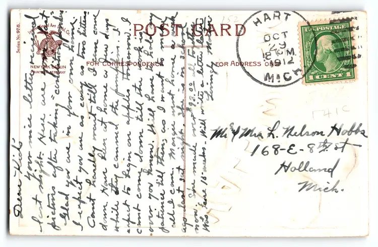 Printed by the International Art Publ. Co., New York & Berlin, this original Halloween holiday postcard measures the standard 5.5 x 3.5 inches and showcases beautiful early lithography techniques. Its divided back allows for correspondence and address, with a 1912 postmark from Hart, Michigan, adding historical charm. This postcard is a delightful collectible for vintage holiday enthusiasts and postcard collectors, embodying both thematic and nostalgic value from the 1900-1919 era.