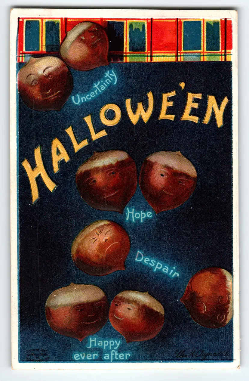 This charming vintage Halloween postcard from the early 20th century features lithograph printing depicting expressive chestnuts personified with faces showing emotions like uncertainty, hope, despair, and happiness. The colorful, plaid-themed top border contrasts with the dark blue background, highlighting the bold yellow "Hallowe'en" text. The playful, whimsical style is typical of divided back postcards produced between 1907 and 1915.
