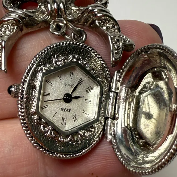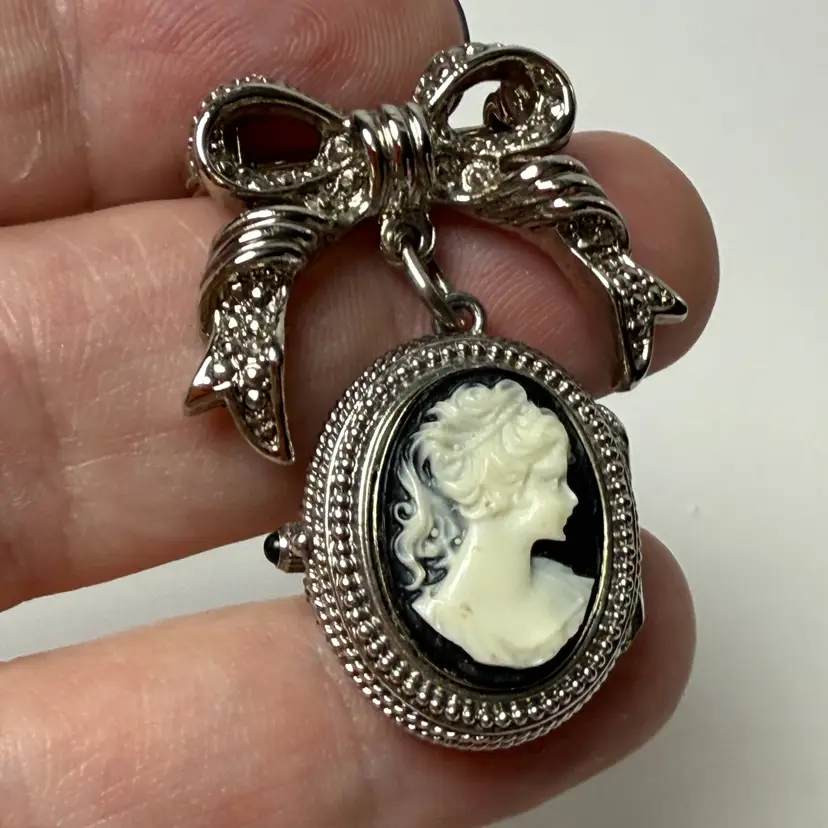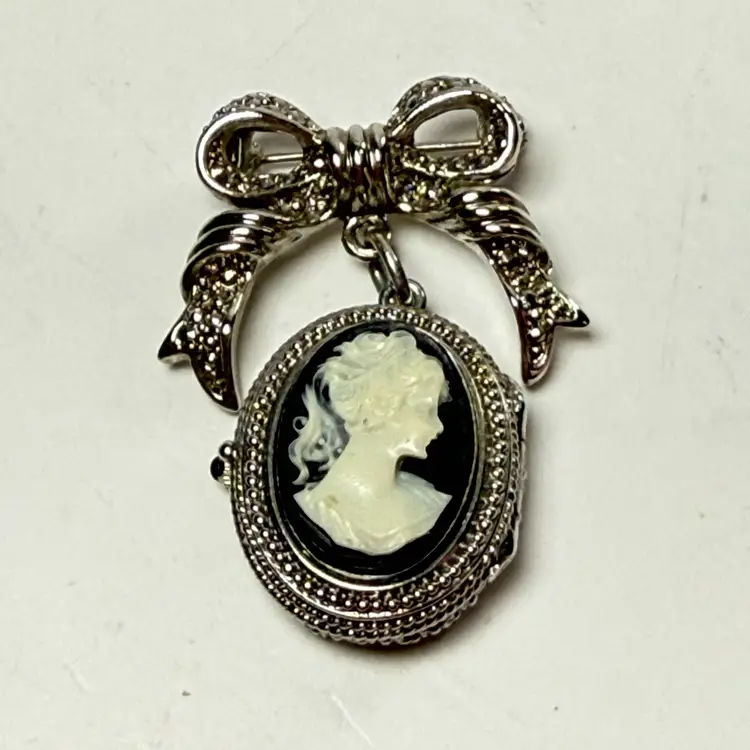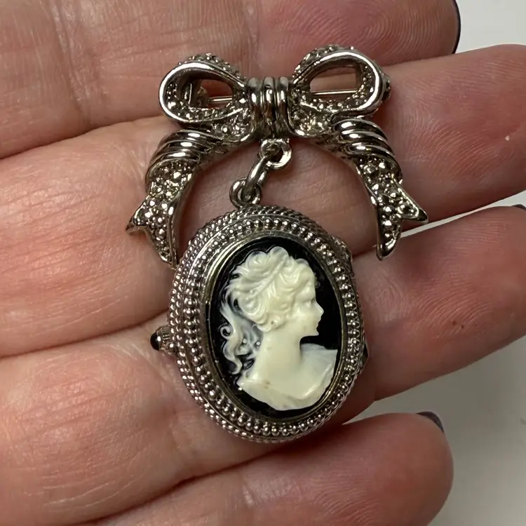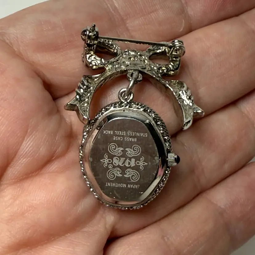 Vintage 1928 Brand Silver Tone Black White Cameo Brooch Pin Watch Ribbon Dangle. Japan movement. Brass case with stainless steel back. 1.5" long. Great condition. Little to no wear. Watch is currently NOT working but probably just needs a new battery.