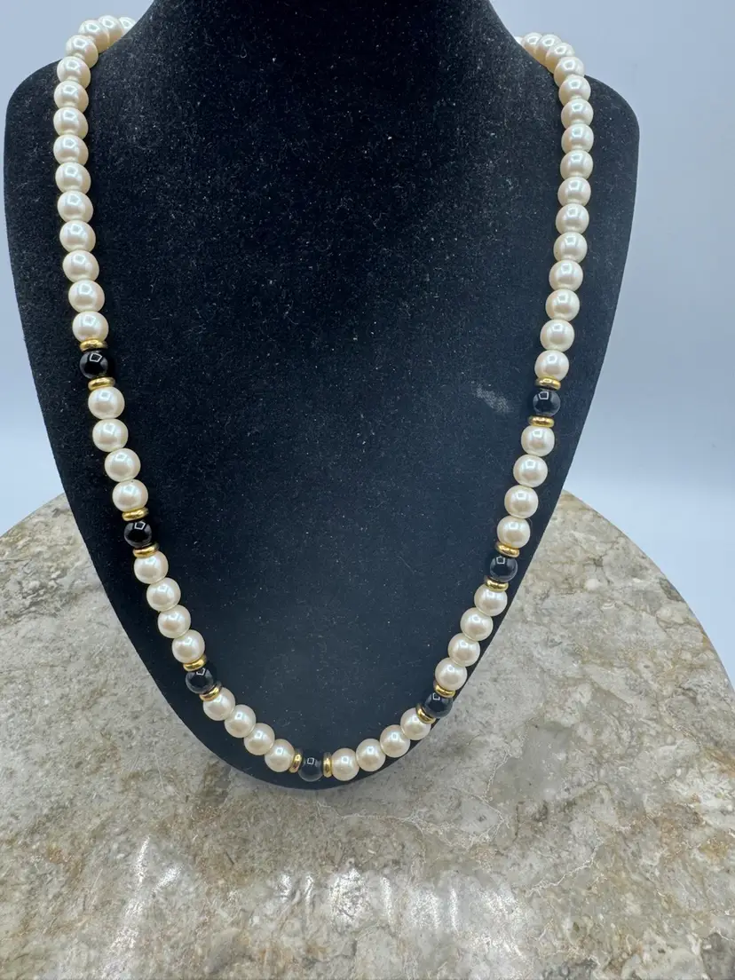 Vintage “1928” glass Bead Faux Pearl Black, And White With Gold Tone Accents. Beautiful. Excellent condition. Measures 24 inches.