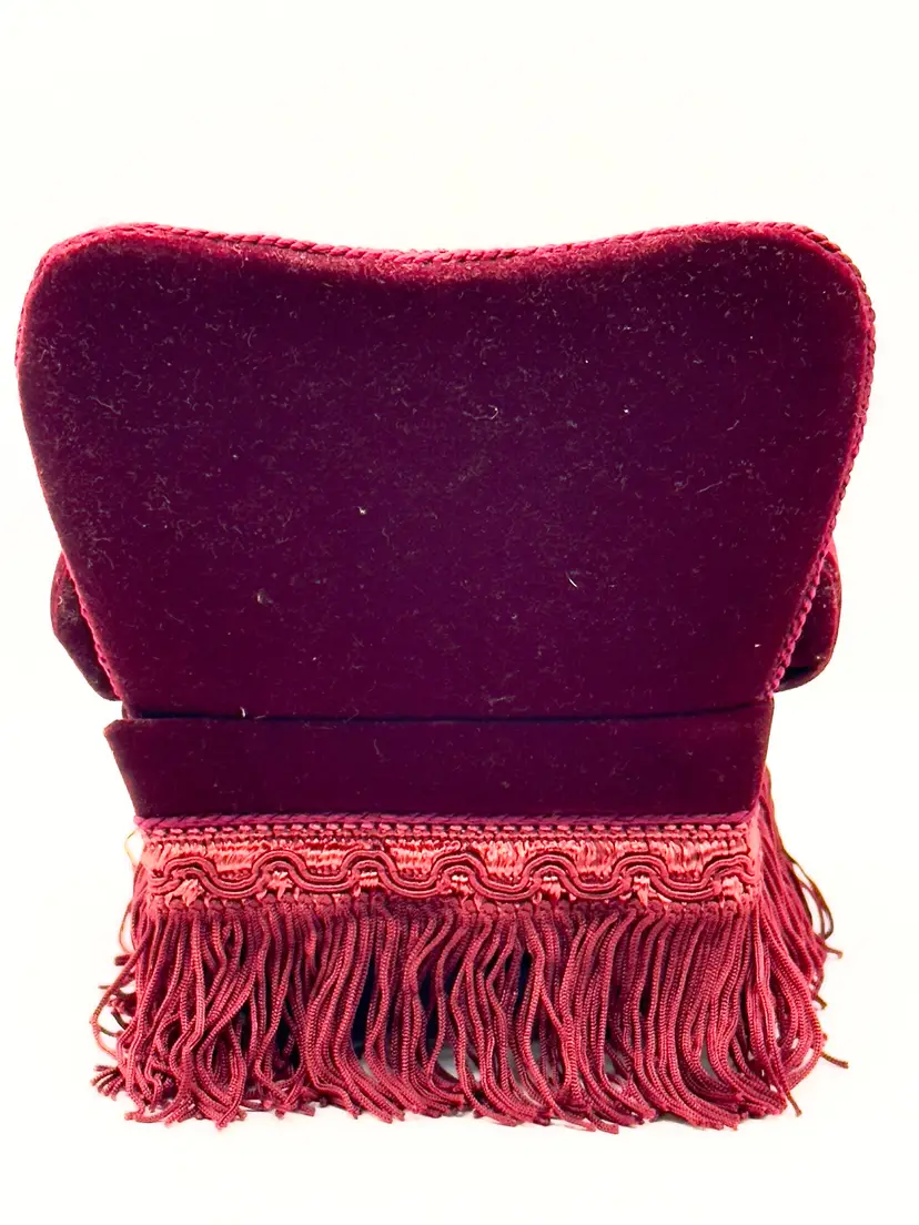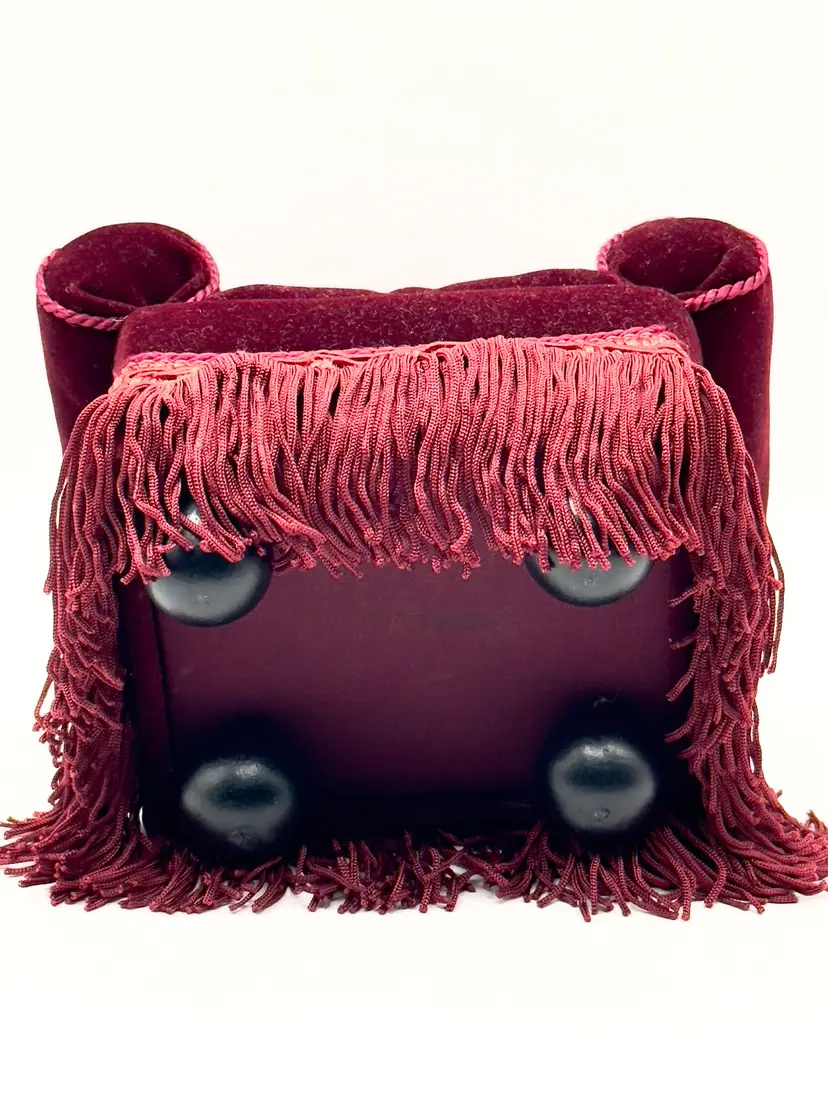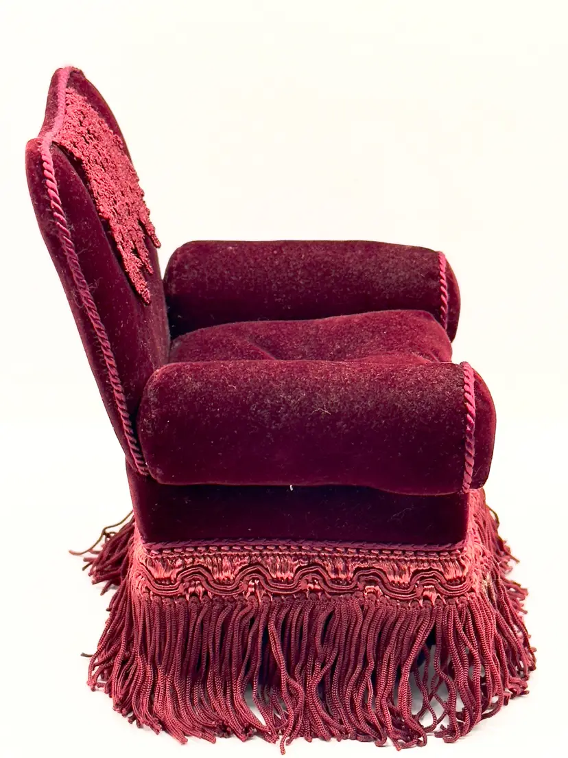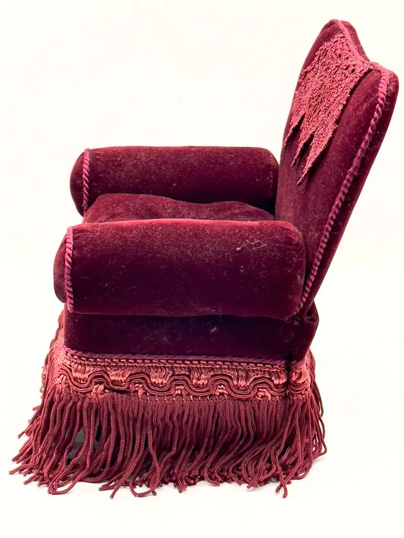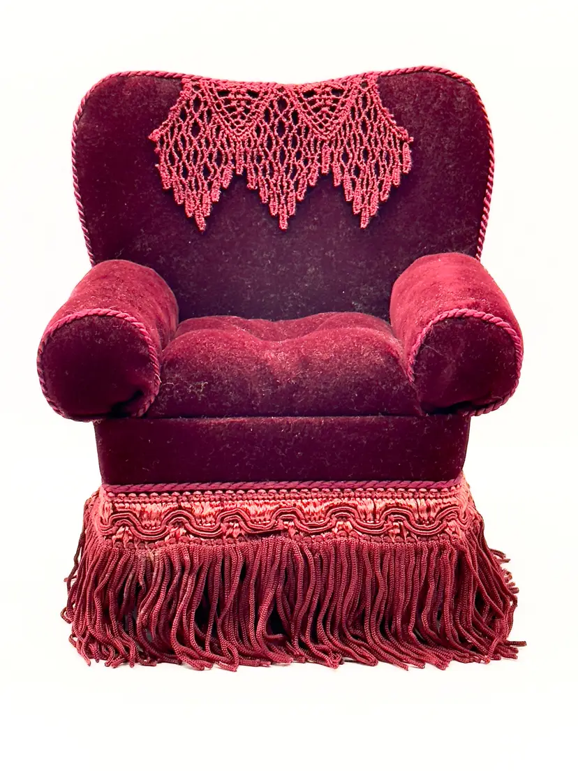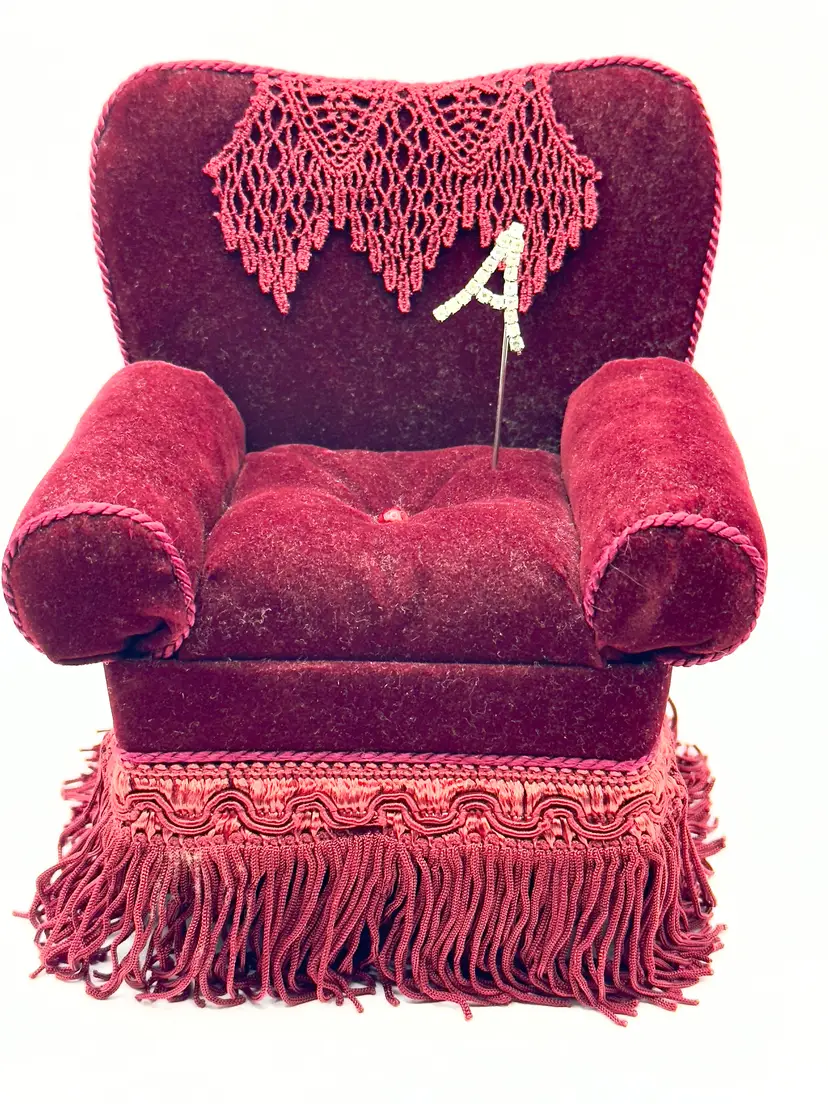 Add a touch of vintage charm to your sewing collection with this delightful velvet armchair pin cushion. Featuring rich crimson red velvet upholstery, intricate fringe detailing, and a lace doily accent, this piece is both functional and decorative. Perfect for keeping your pins and needles organized while adding a nostalgic flair to your space. Shows signs of age for authentic character. Excellent condition. Measures 5.25x6.5x4.5 inches. Weighs 8oz. Pin not included.