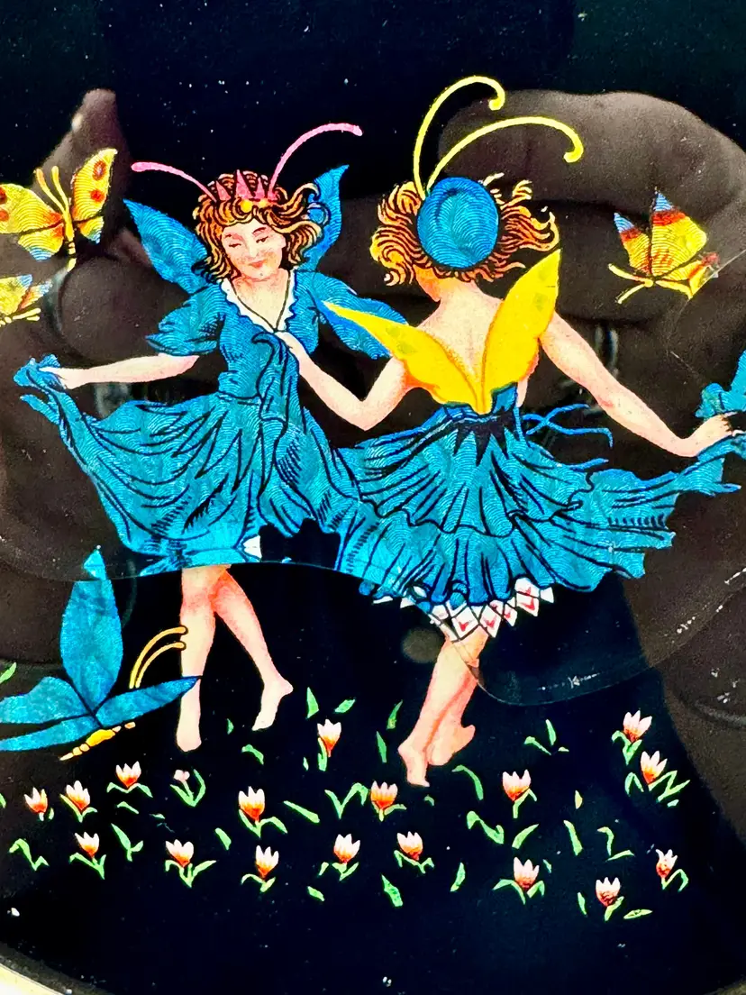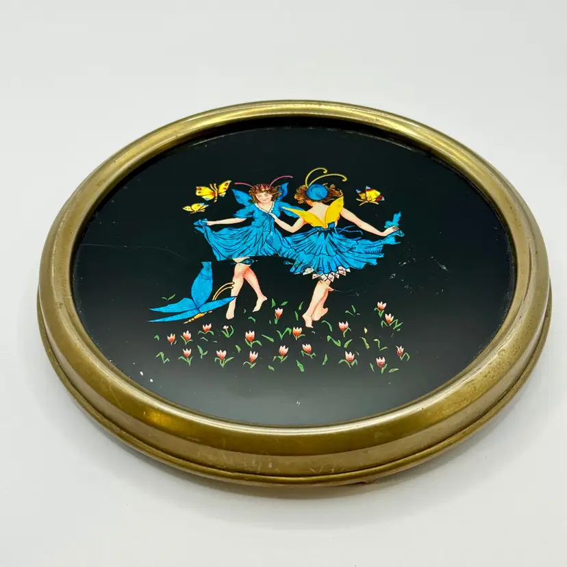 Step back in time with this charming vintage chrome tray, featuring whimsical dancing fairies against a stark black background, encircled by a classic gold-tone rim. A delightful collectible that adds a touch of nostalgia and enchantment to any space. Shows signs of age but still in good condition. No chips, glass is cracked (see pics.) Measures 6”. Weighs 1lb.