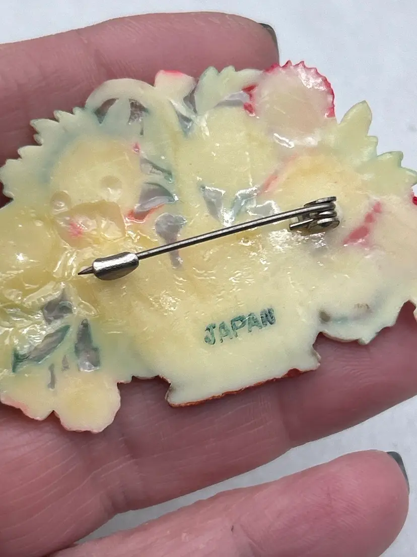 Notable Details • Marked JAPAN • Circa 1930s–early 1940s • Hand-painted celluloid • Dimensional floral basket motif • Pre-war Japanese export • Original period pin back