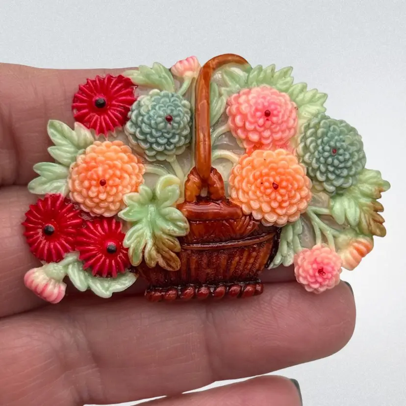 Beautiful vintage celluloid floral basket brooch dating to the late 1930s–early 1940s, marked “JAPAN.” This pre-war piece features a richly detailed basket overflowing with hand-painted flowers in soft greens, peach, coral, and vibrant red.