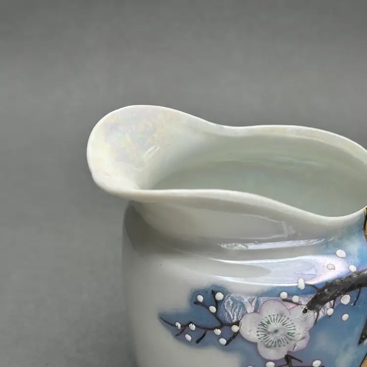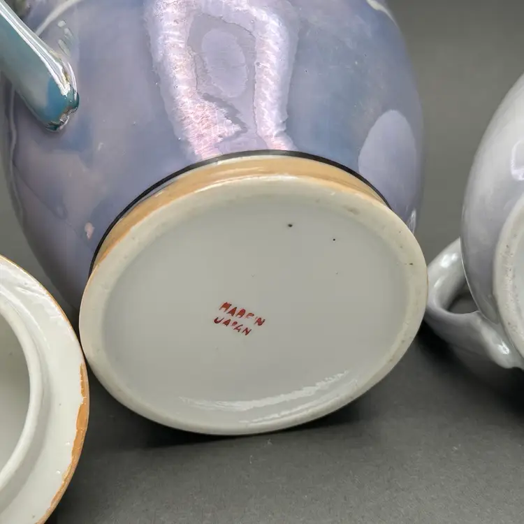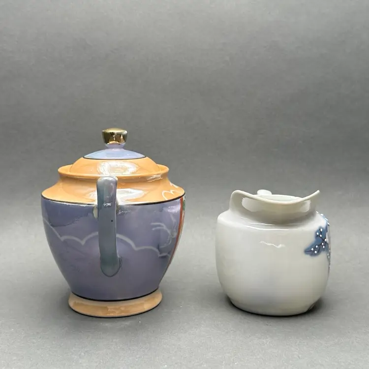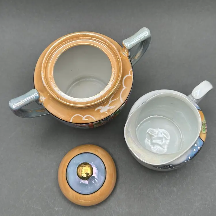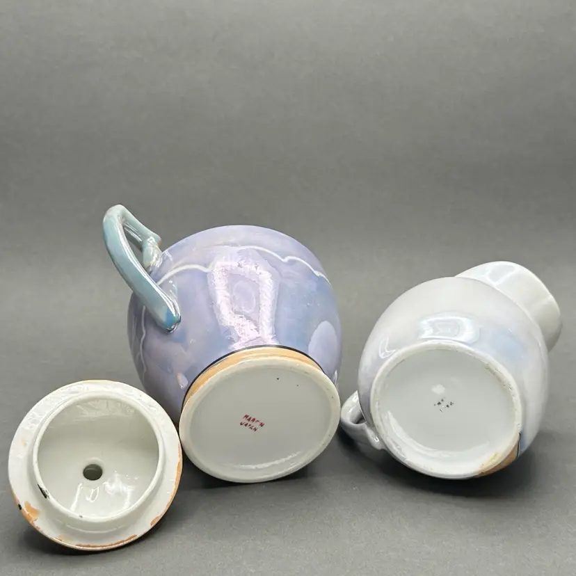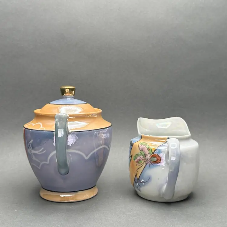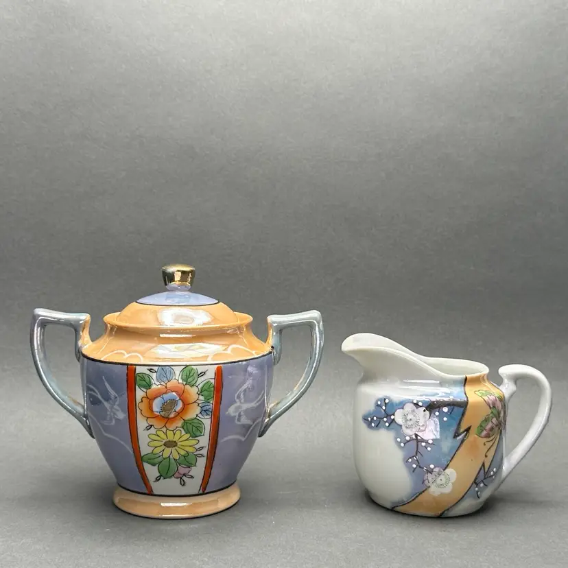 Vintage lusterware creamer and covered sugar set. The bodies are a pearl and lavender luster worth peach accents adorned with florals. Made in Japan c. 1930’s.