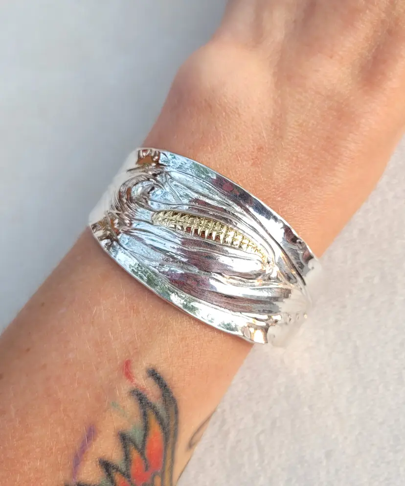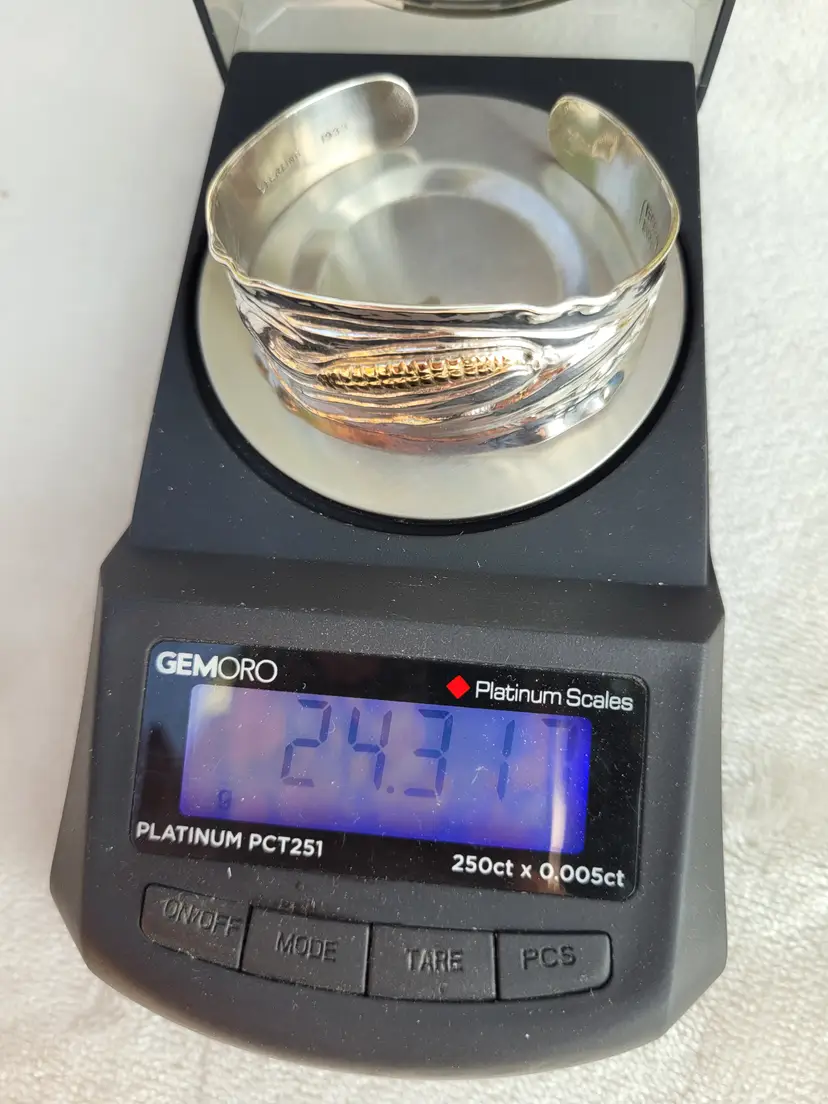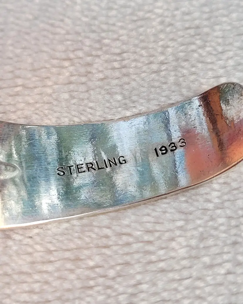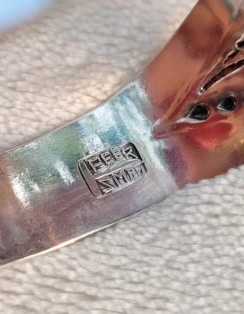 It is similar in design to his "squirrel" cuffs, however I cannot find any record of this particular corn design selling at any point so it is rather rare indeed. It has his signature along with the date of 1933, and is in good condition. The bracelet measures 6.5" in circumference including the opening, so is suitable for smaller adult wrists and weighs in at just over 24 grams. Please see pictures for details and measurements.