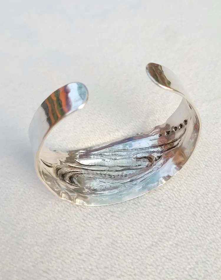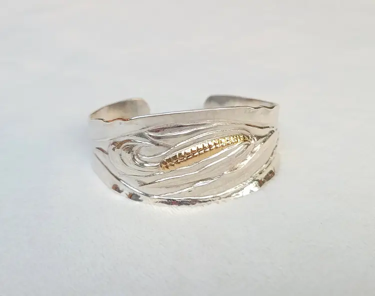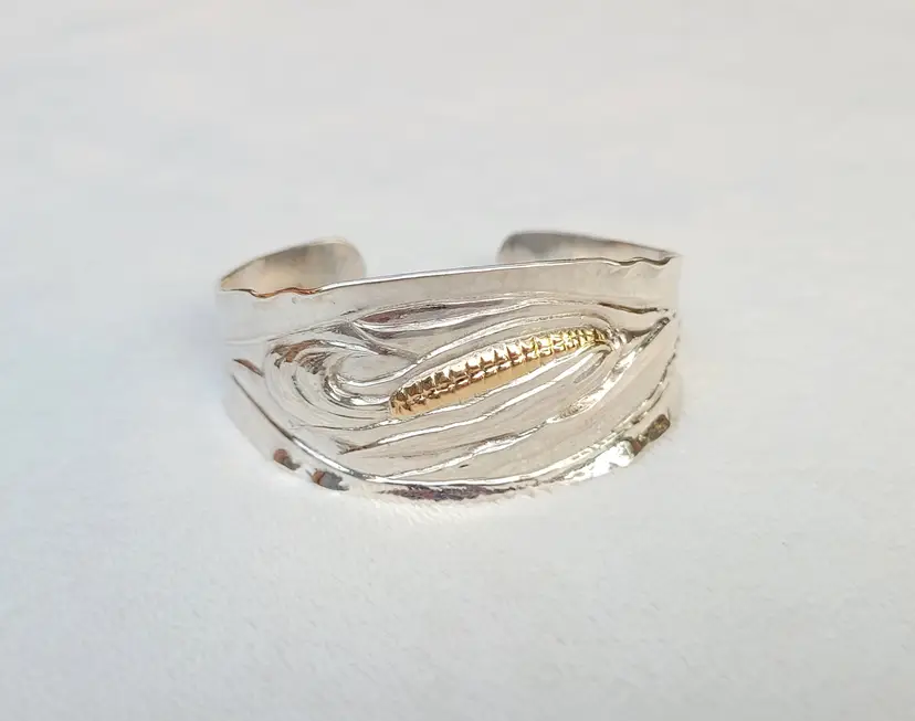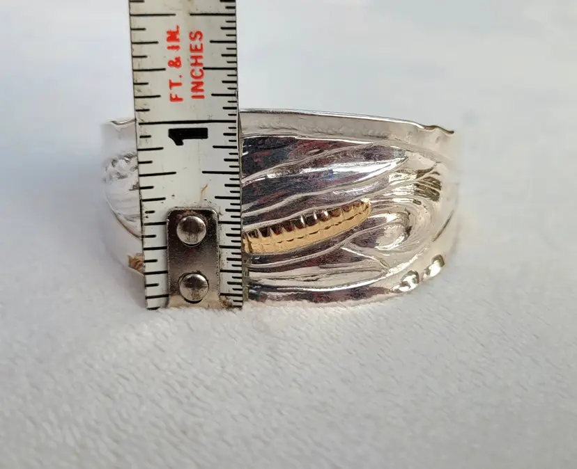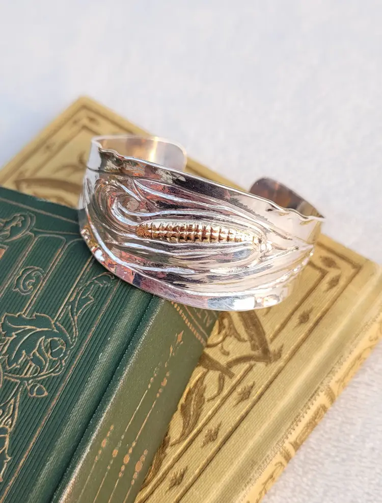 It is similar in design to his "squirrel" cuffs, however I cannot find any record of this particular corn design selling at any point so it is rather rare indeed. It has his signature along with the date of 1933, and is in good condition. The bracelet measures 6.5" in circumference including the opening, so is suitable for smaller adult wrists and weighs in at just over 24 grams. Please see pictures for details and measurements.