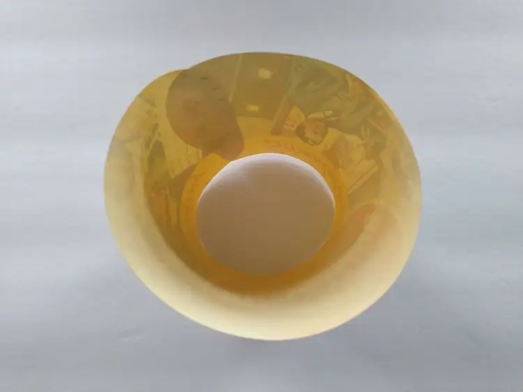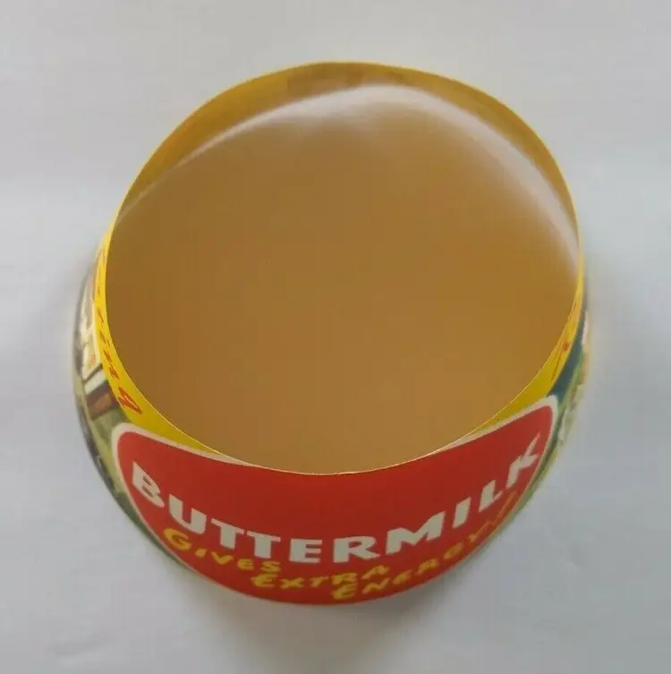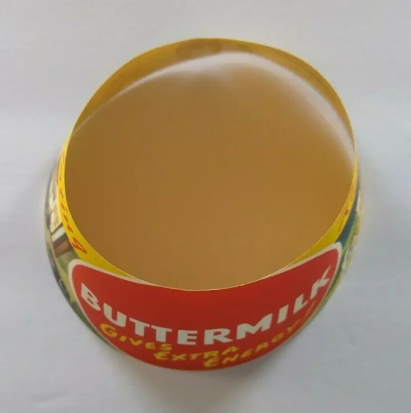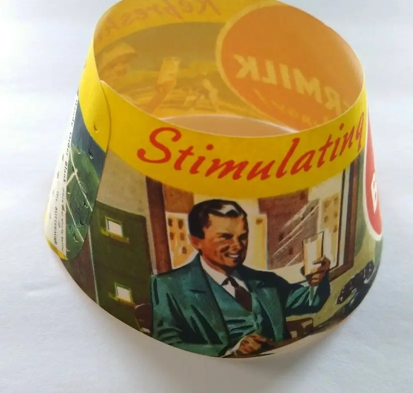 Super cool graphics on this 4" x 2.5" round unused new old stock condition buttermilk bottle paper collar. Has slight age wear only. Inside has formed tabs that have been attached to make item cone shaped.