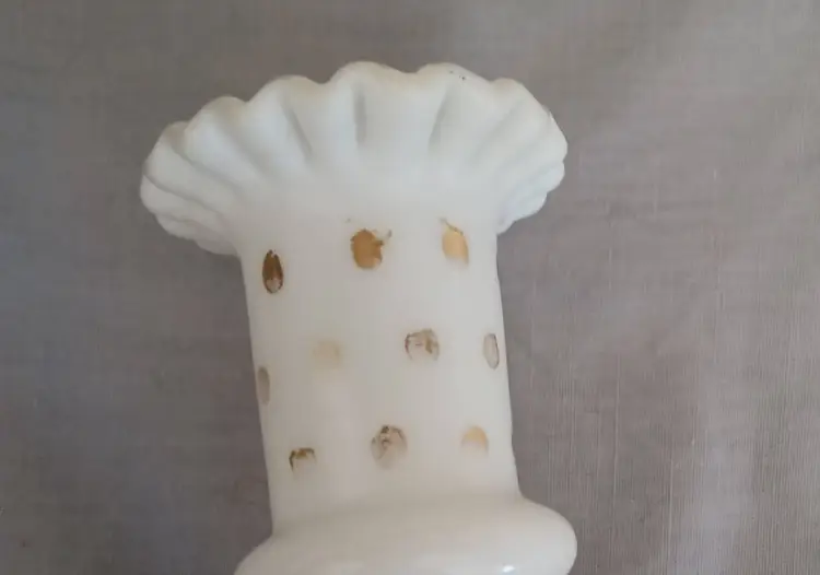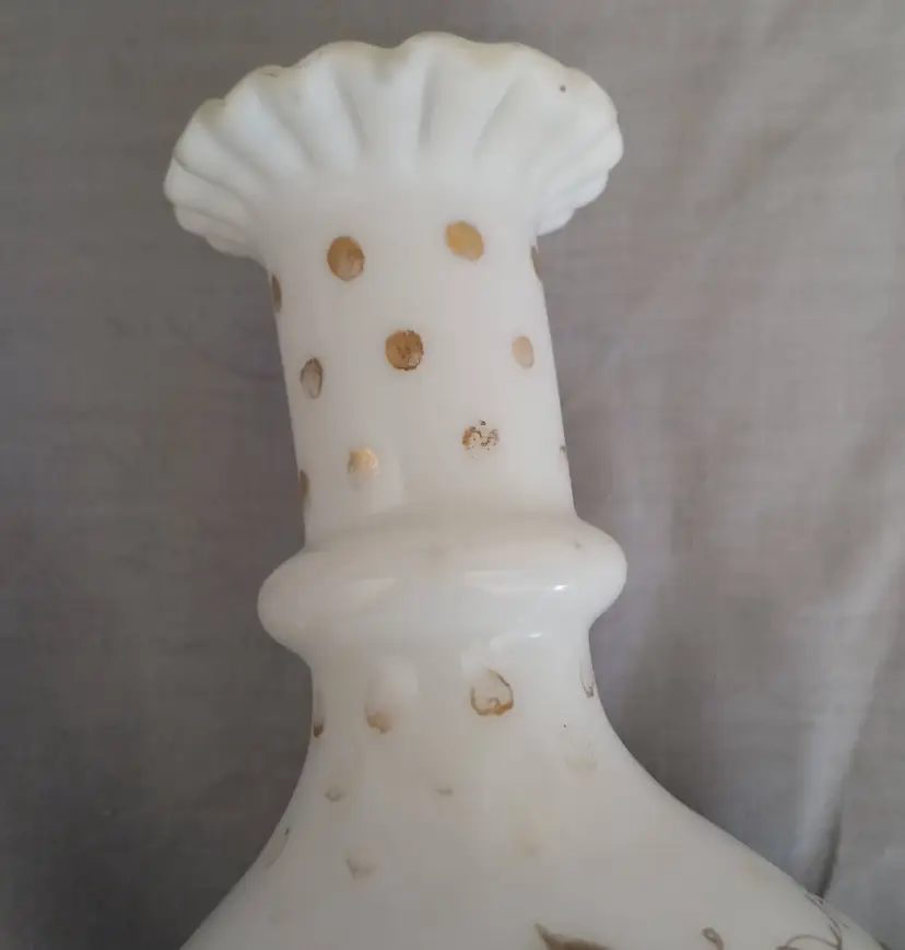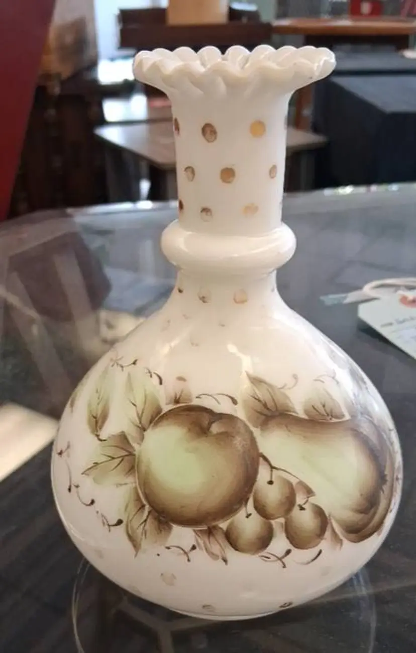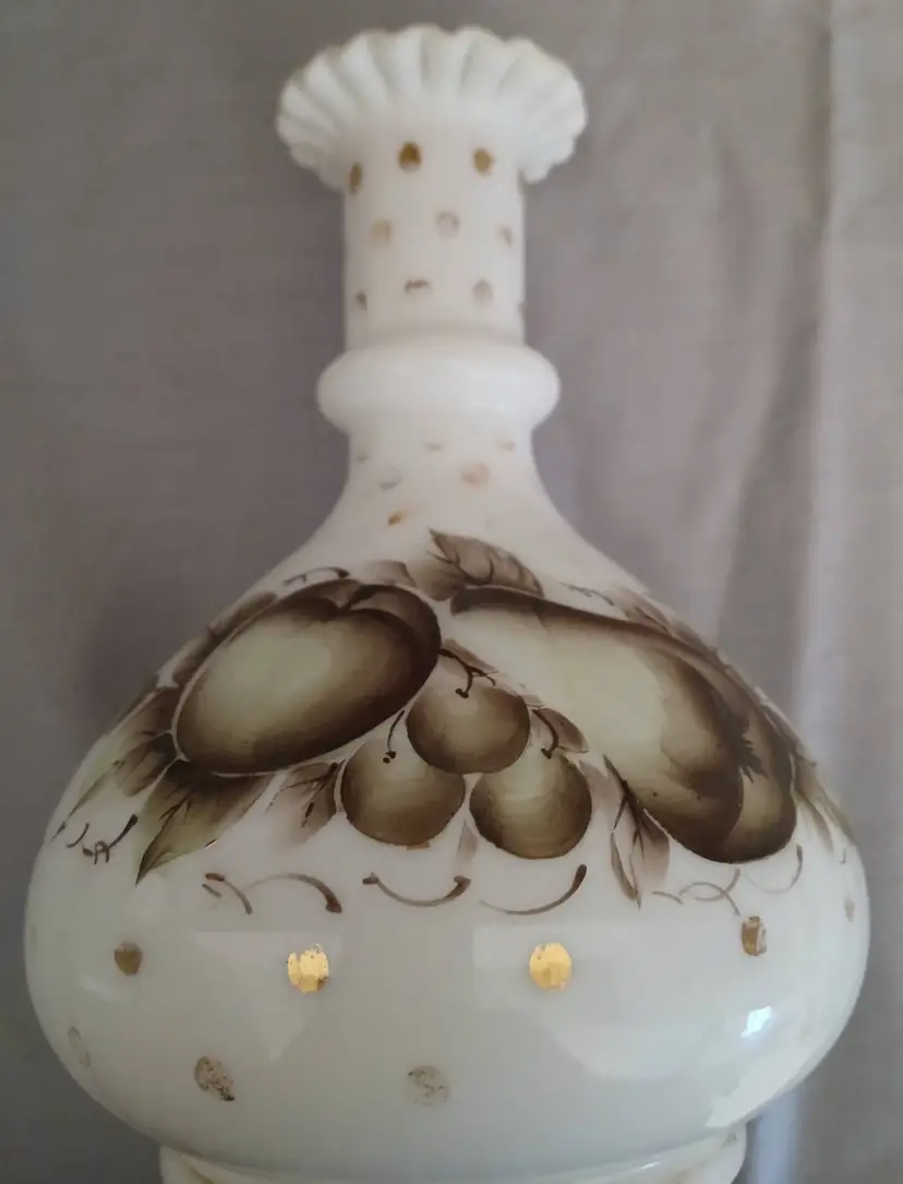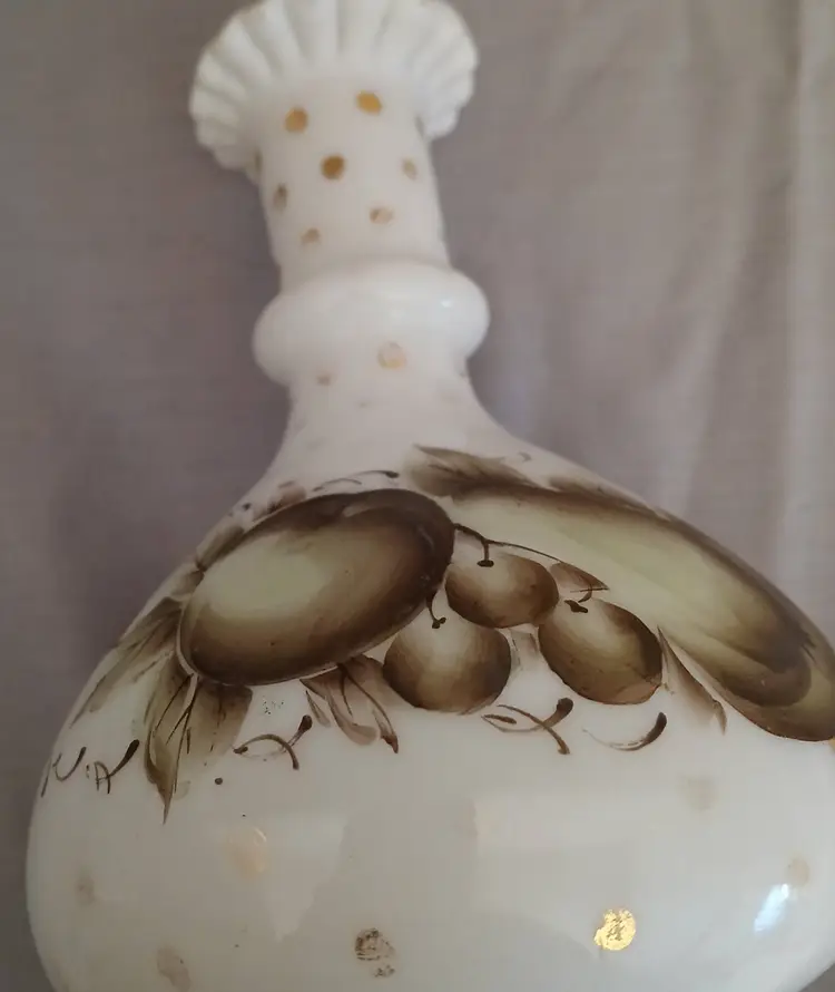 This is a vintage 1940s Fenton decanter featuring the Apple and Pear design. It is missing some of the gold polka dots just due to the age and wear of people using it over the decades.