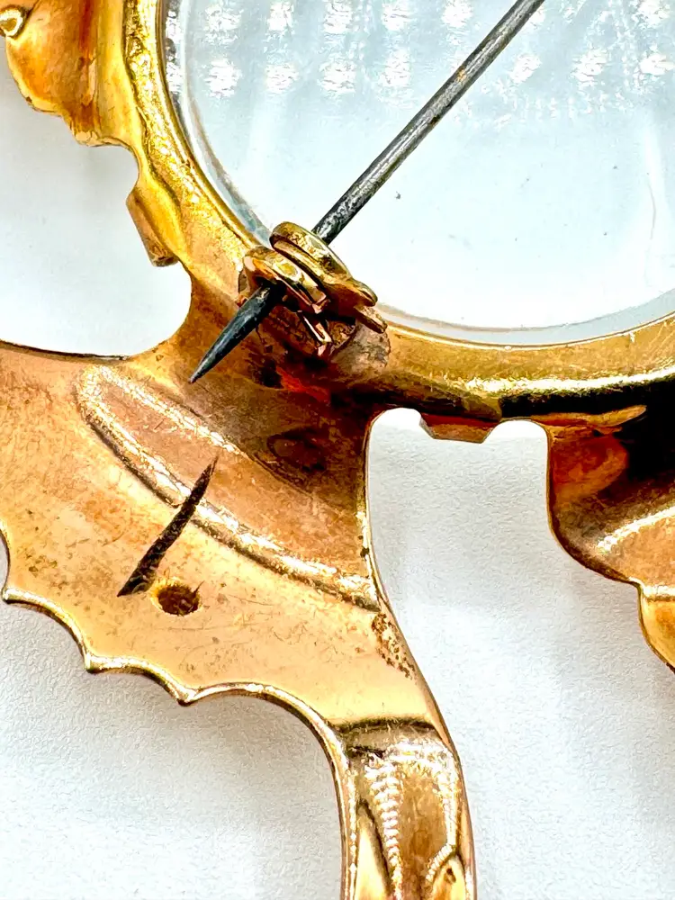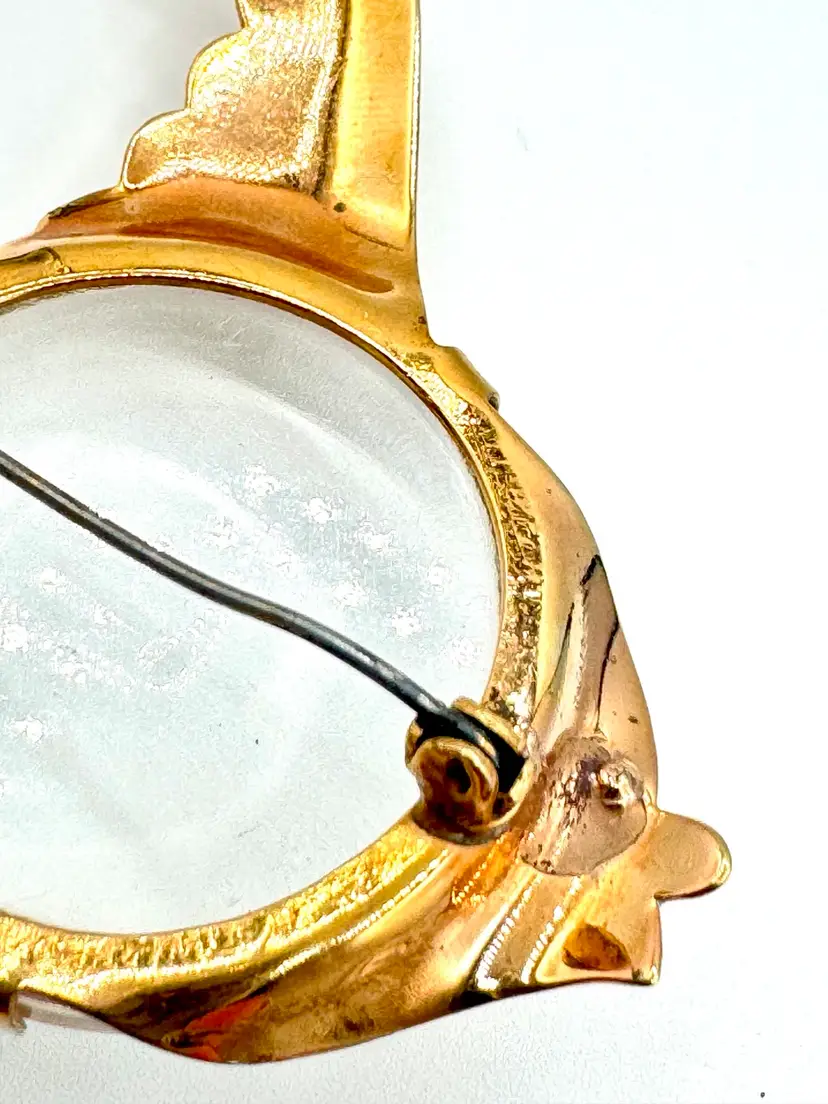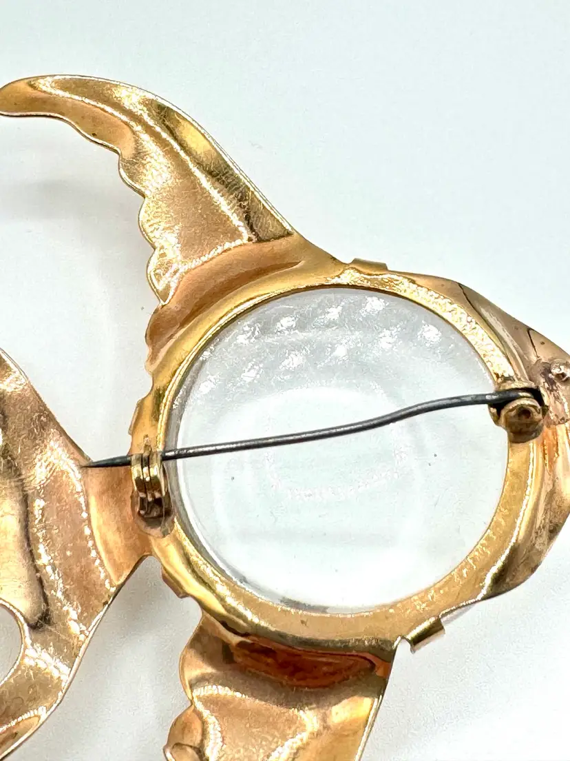 This vintage brooch pin features a stunning jelly belly angel fish design that will add a touch of retro charm to any outfit. With a multi-tone gold plated metal and clear rhinestone accents, this piece is ideal for those who love aquatic-themed jewelry. The lucite and glass materials used in this brooch give it a unique texture and appearance that is sure to catch the eye.