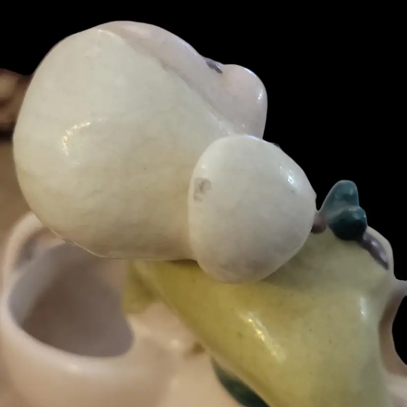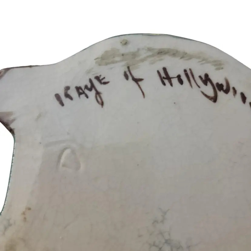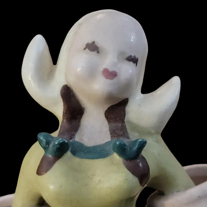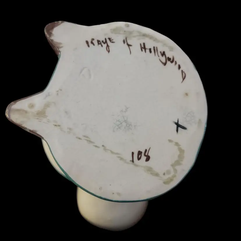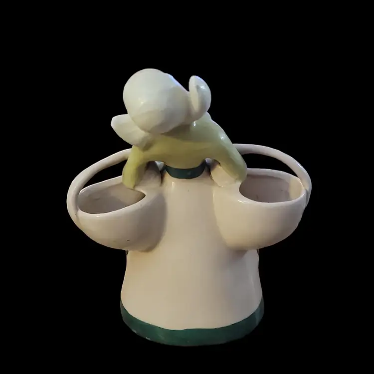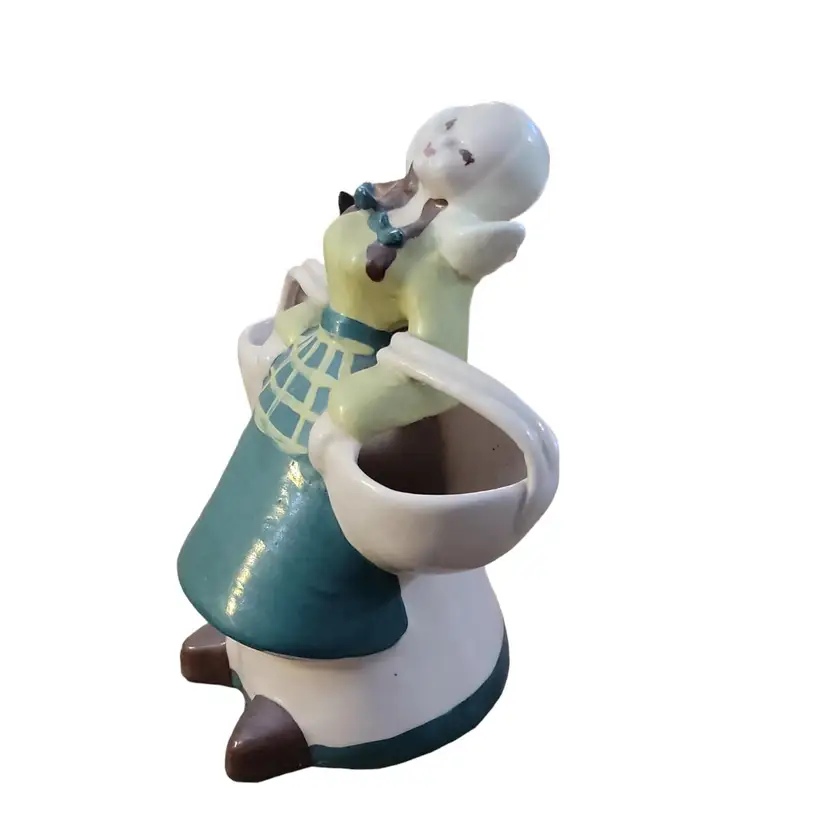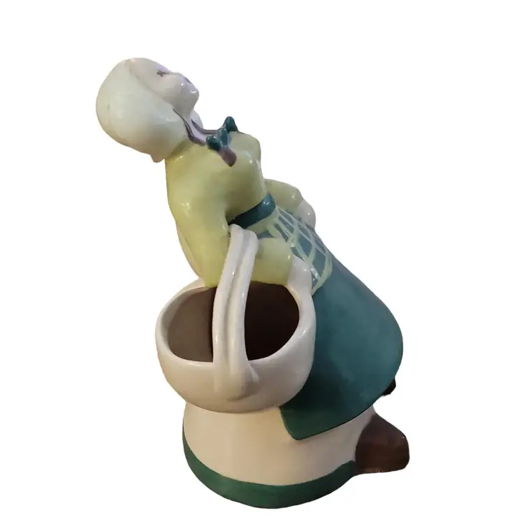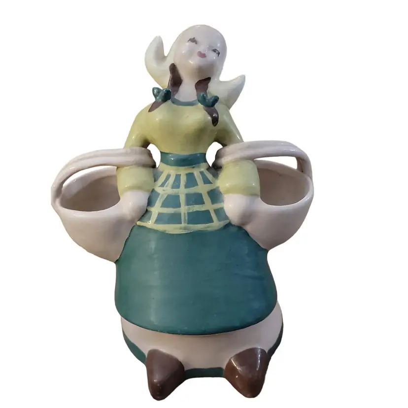 A favorite of the 1940s and 50s, Kaye of Hollywood was a favorite for collectors of figurines that became emblems of the area. Dutch Girl and boy, Chinese figurines, glamorous women in frilly party dresses and heads of fashionable women. This is a 10" tall 8" wide young woman in typical Dutch clothing, this time dark green with lighter green or yellow apron and top. She is carrying two baskets, which could be used for small real or artificial plants or flowers. She has one small space on the back of her cap where it appears the paint is lightly worn. See photo. She is a definite return to the past.