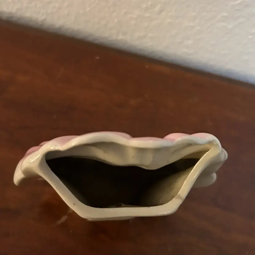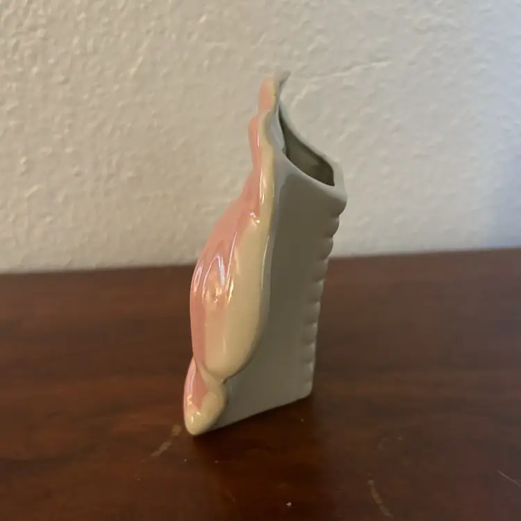Charming vintage ceramic wall pocket shaped like a stylized flower in soft pink with subtle blue and cream shading. The glossy glaze and flowing petal design give it that perfect 1940s Art Deco-to-early-mid-century look.