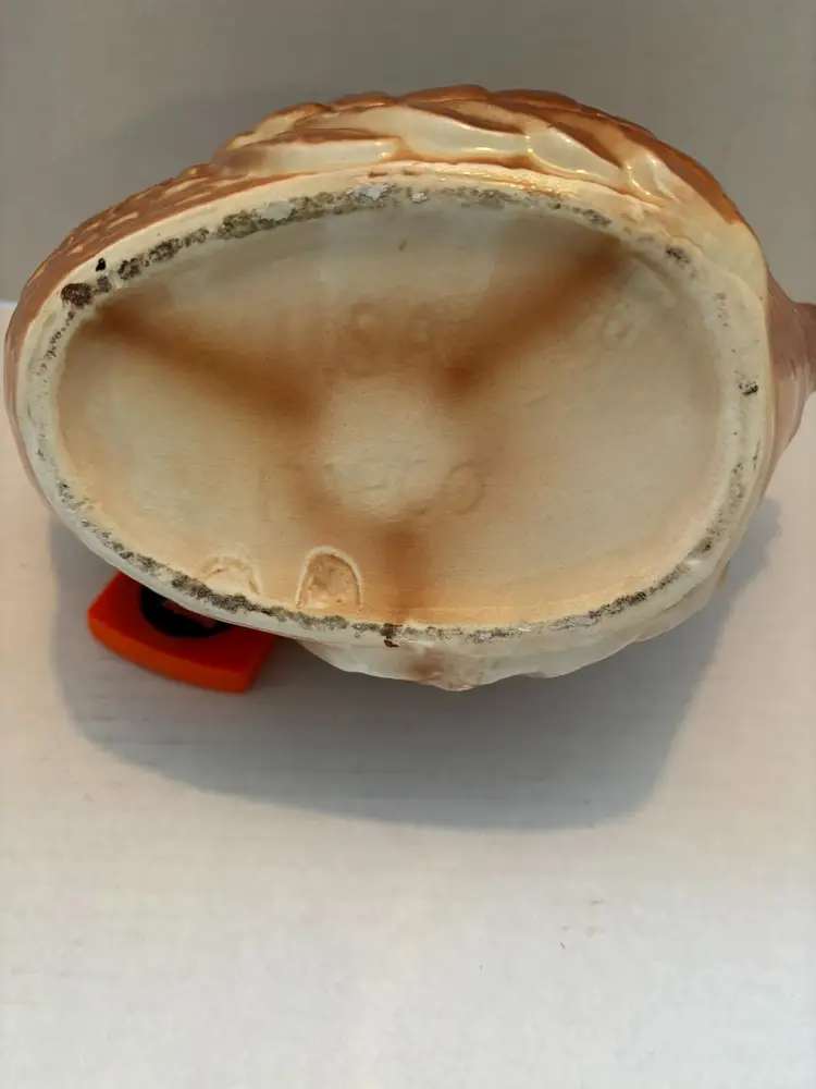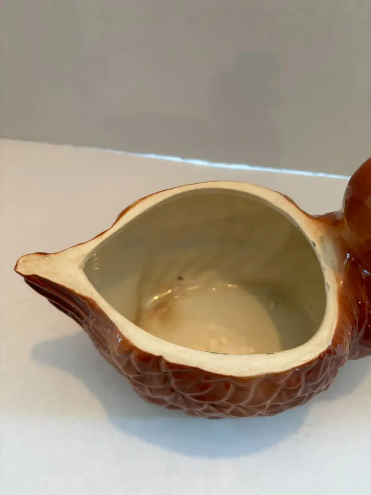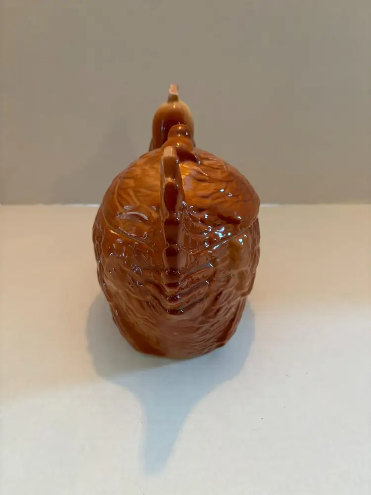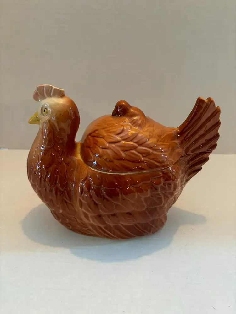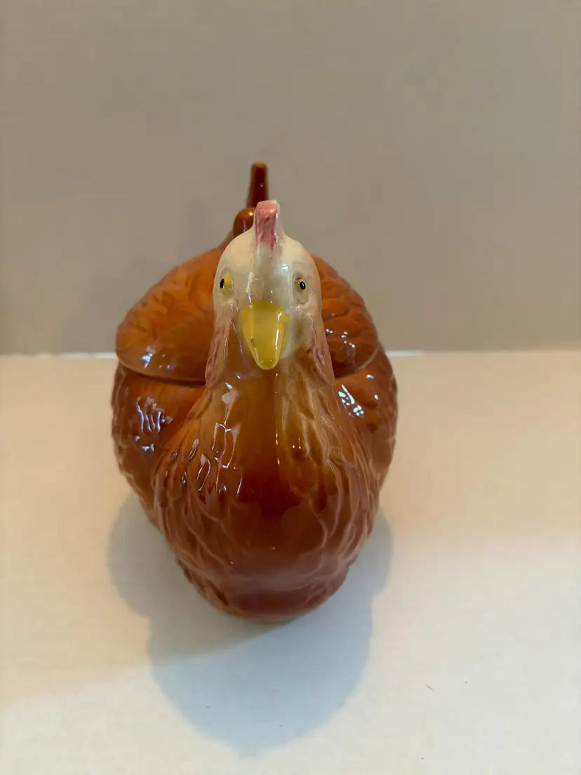 This must-have chicken cookie jar from the 40s will add charm to any country-styled kitchen. It measures 7 1/2in tall X 10in long X 5in wide. Made in the USA