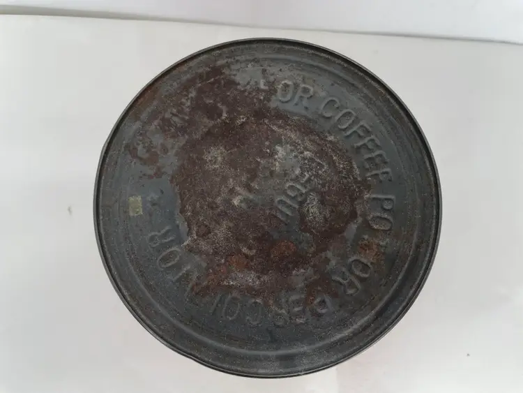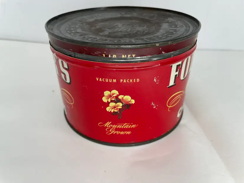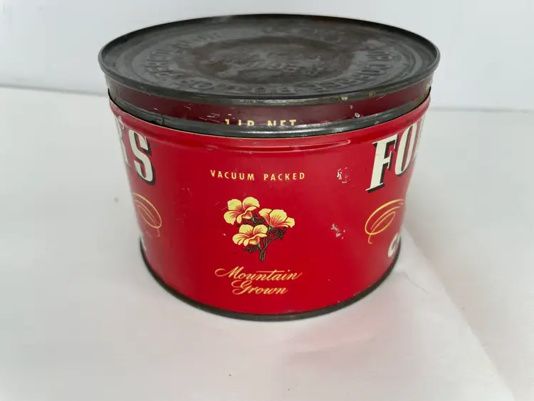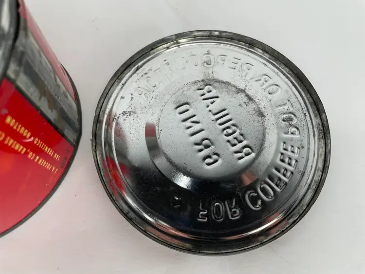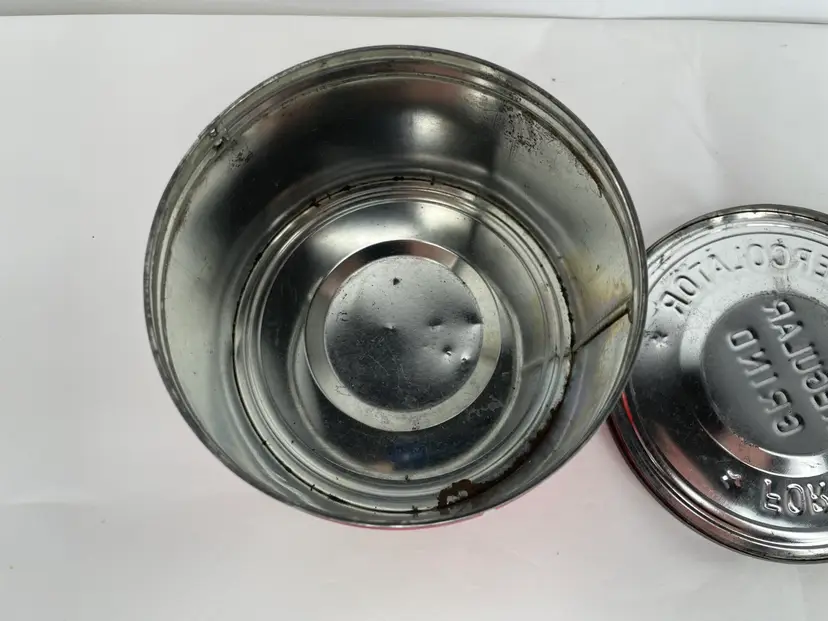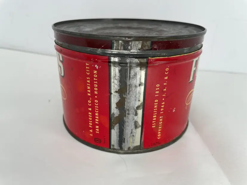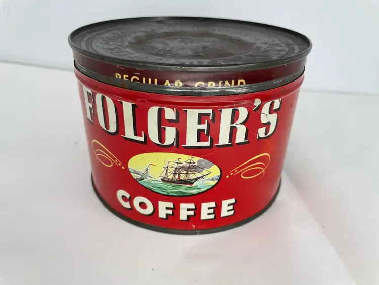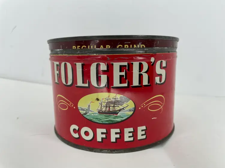 The product is a vintage 1946 Folgers Regular Grind 1 pound keywind coffee tin. This collectible advertising item features a multi-color design and is an original piece from the 1940s, made in the United States. The tin reflects a theme of coffee and tea, making it a nostalgic and sought-after piece for collectors interested in vintage coffee memorabilia.