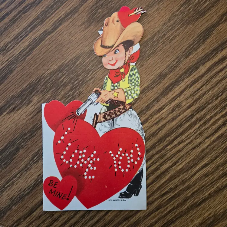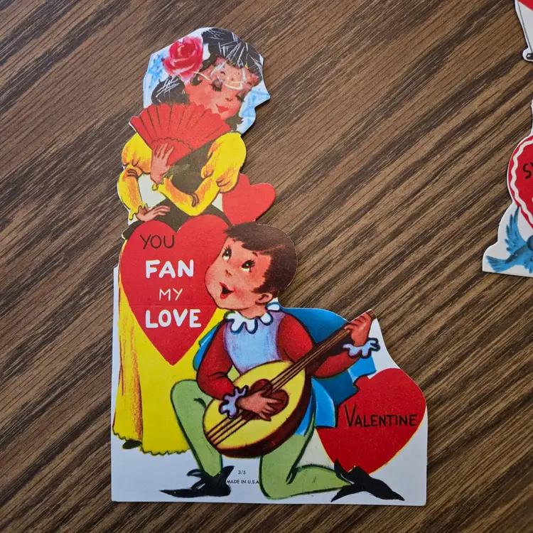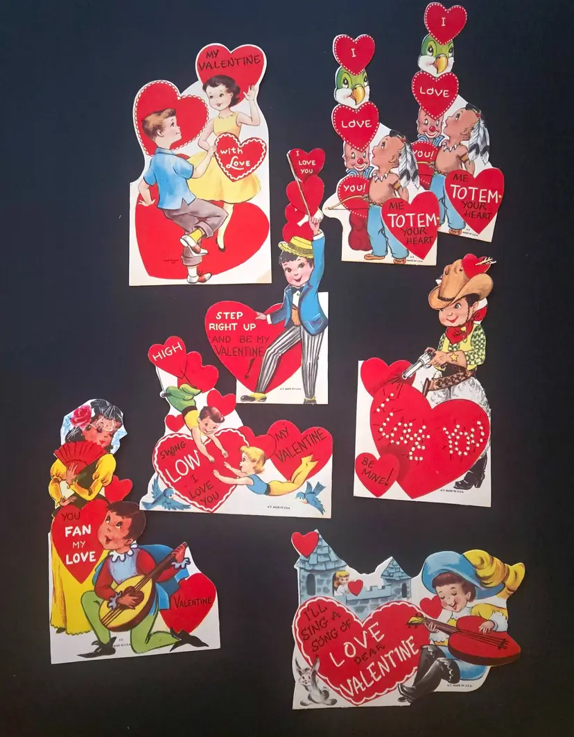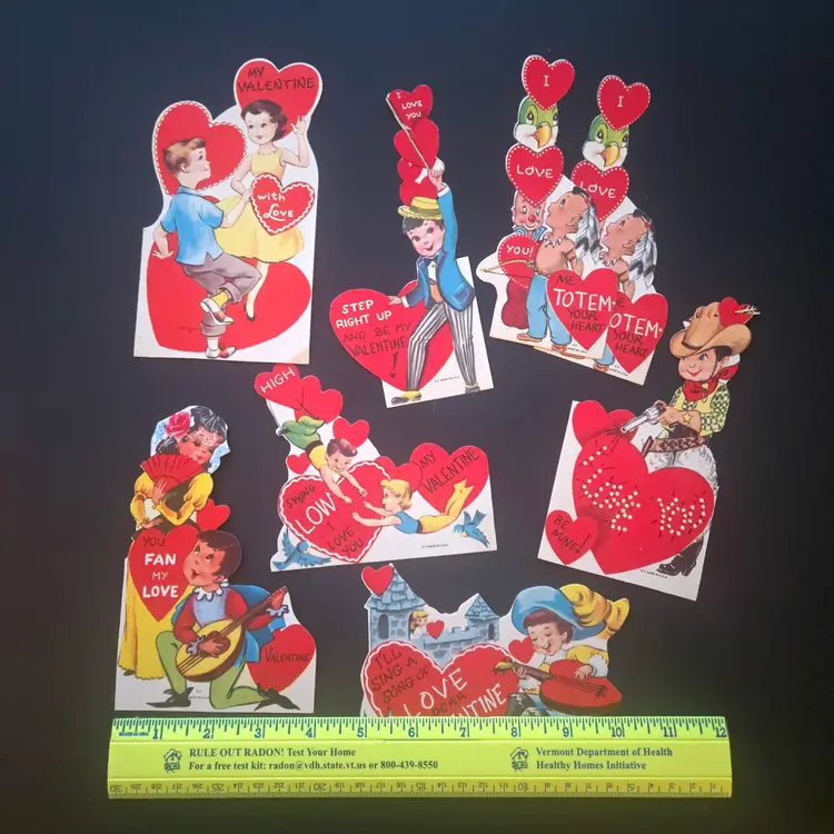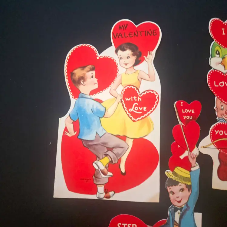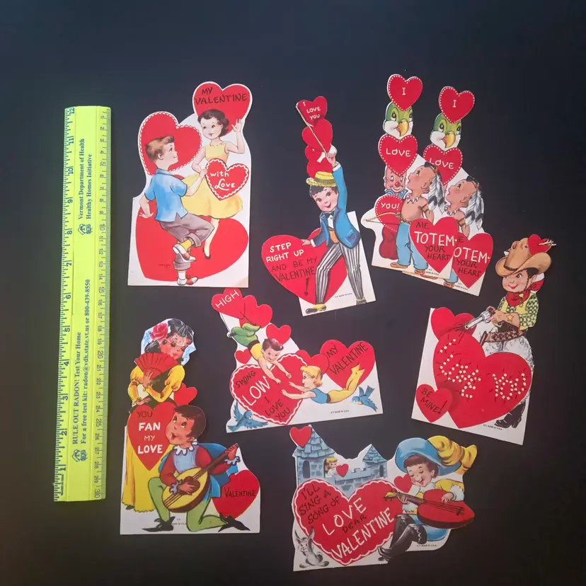 I found these stored away at my dad's house (pet and smoke free) after he died. I've sorted them into categories that may be of interest to collectors or scrapbookers. These 8 UNUSED cards all have the word "love" on them. Two of them are exactly the same. Those meant to be folded have never been folded. The backs are definitely mildly yellowed from age, but look nice on the front with just a bit of fading.