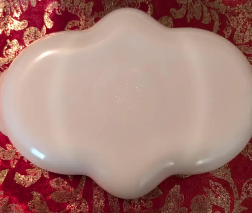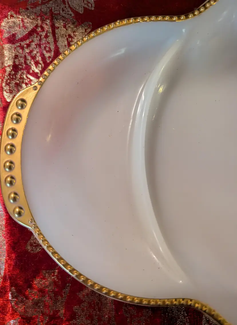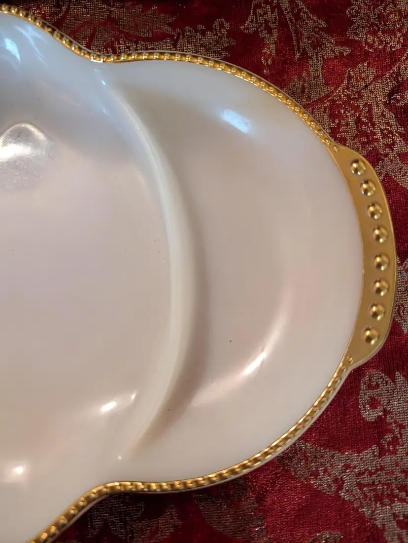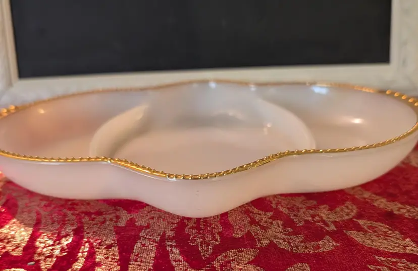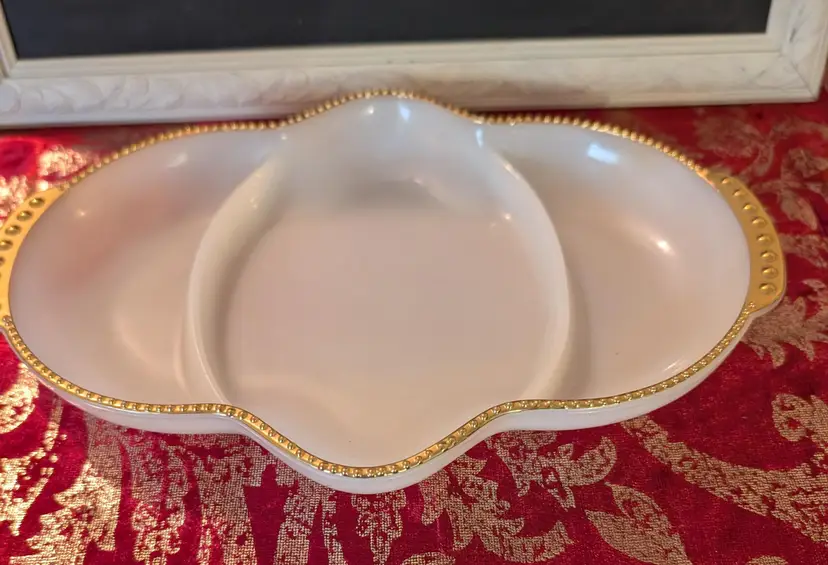 Elegant vintage 1950'sMilk Glass Anchor Hocking Fire King relish serving dish featuring a unique divided design and stunning gold accents along the edges. This piece is in excellent condition with no cracks or chips, perfect for adding a touch of sophistication to your dining table. Ideal for serving appetizers or snacks at your next gathering. Measures approximately 11 inches in length and 8 inches width.