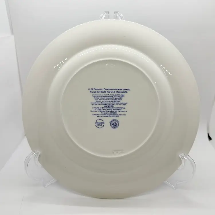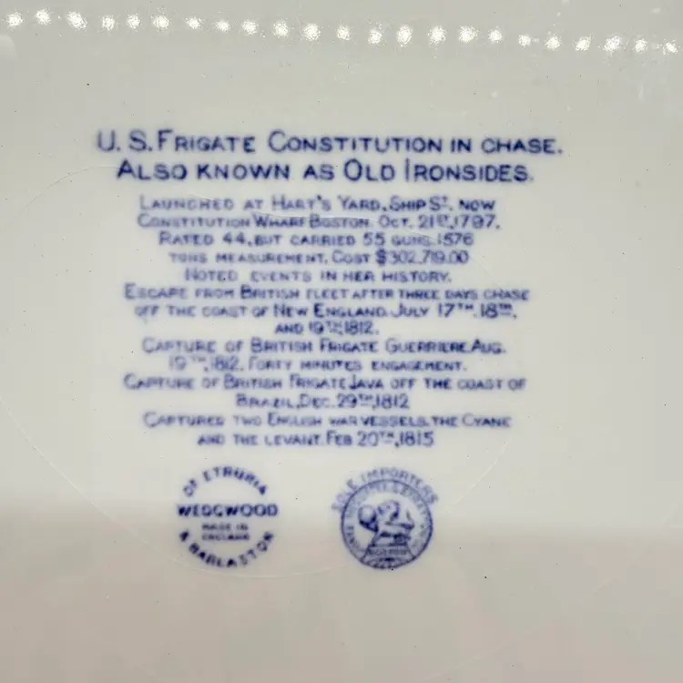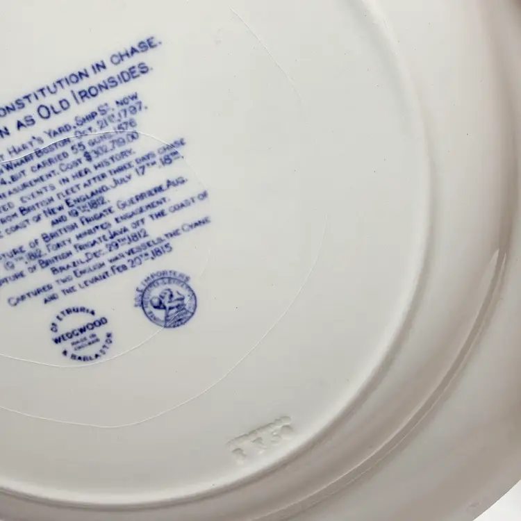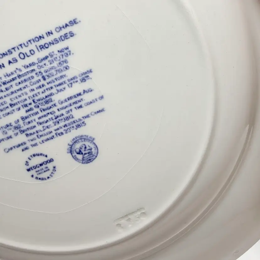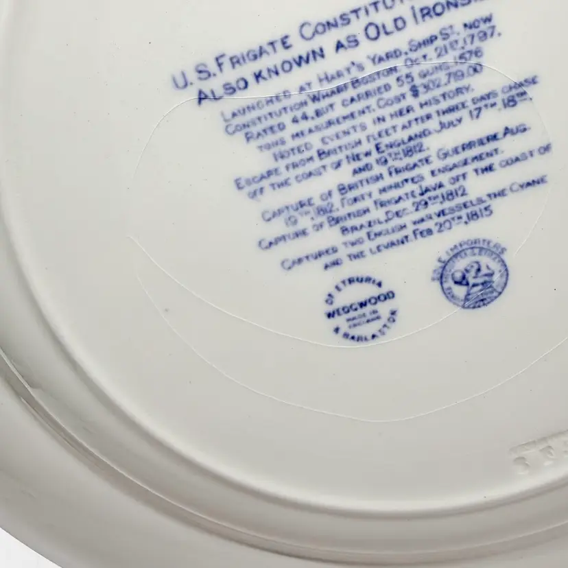 Vintage Wedgwood Blue Washington Bicentennial Plate Old Ironsides Navy Ship U.S. Frigate Constitution. Date mark on back refers to 1950. No chips or cracks. Signs of light wear and use. Crazing to the glaze on front and back. Please see pictures.