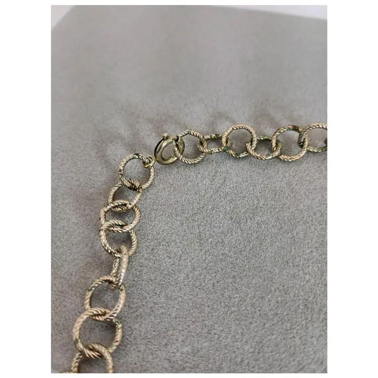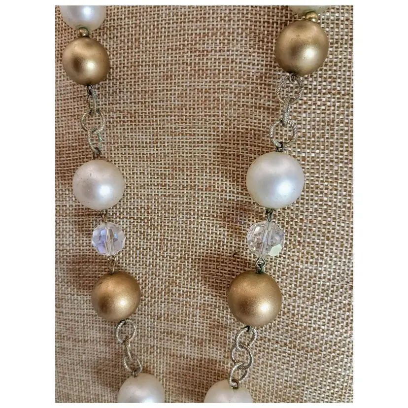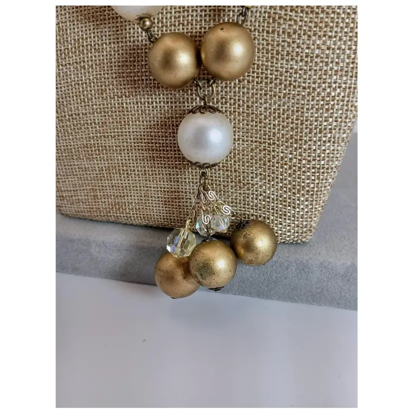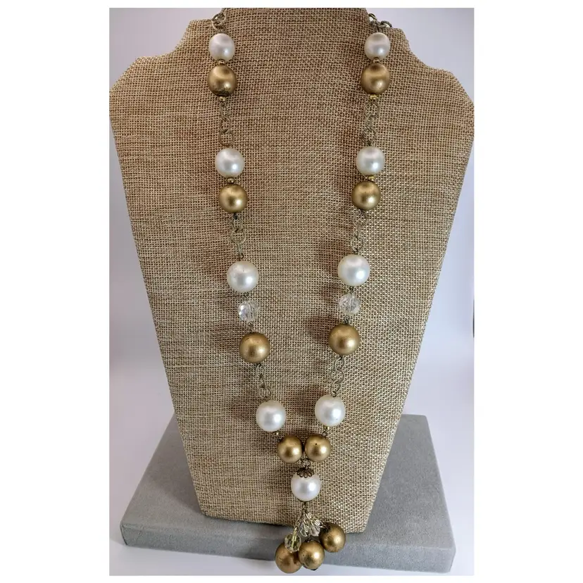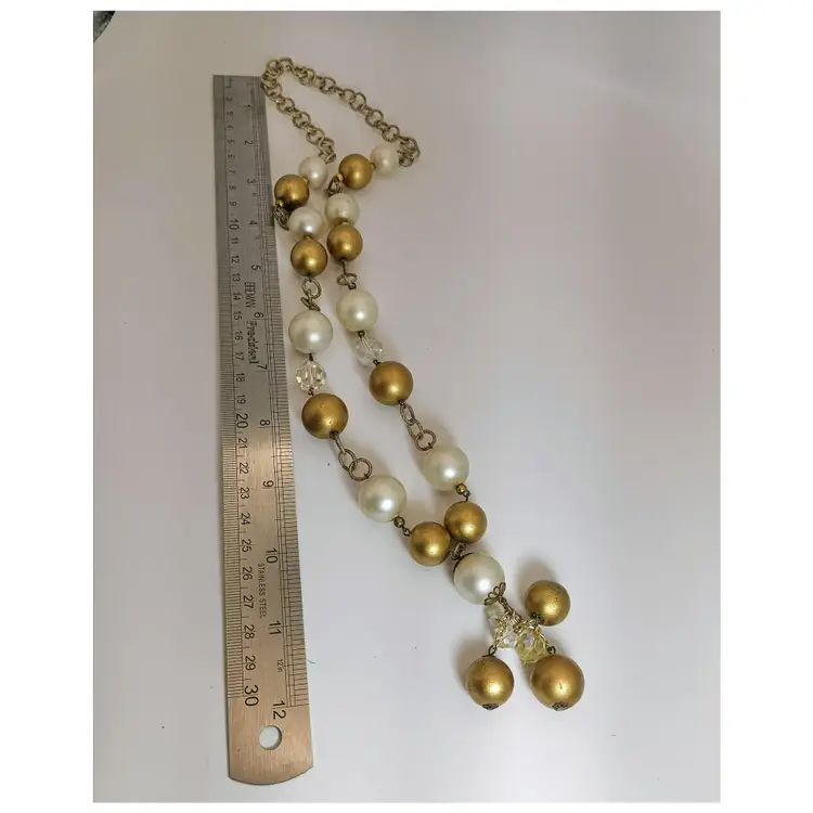 Hi, thanks for looking. You will receive this beautiful vintage crystal and gold and white faux pearl necklace. This necklace is approximately 30 inches in length. It has a spring clasp closure. It has some ware on the silver rings. Overall, in beautiful Vintage condition. Please let me know if you have any questions.