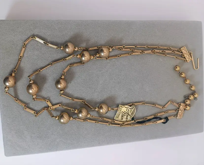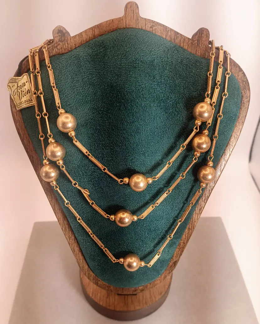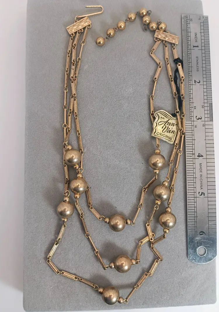 Hello. In this lot you will receive one approximately 16-inch 3 strand brass bead and chain necklace. This necklace has a hook and chain clasp. It can be made longer by adding more chain. This is a super fun vintage necklace that would complement anyone's collection. Let me know if you have any questions.