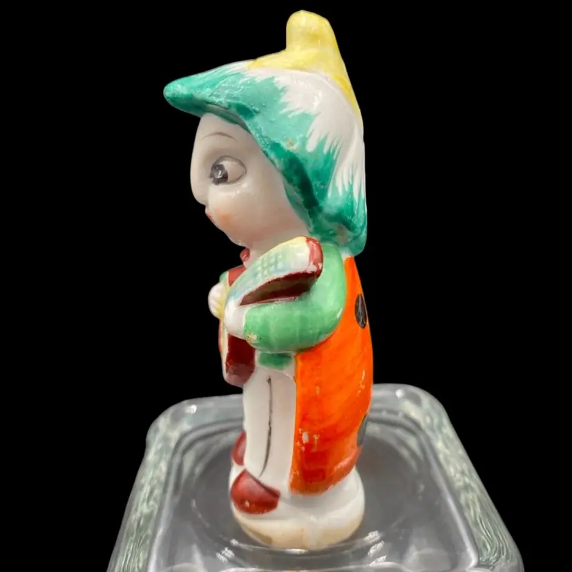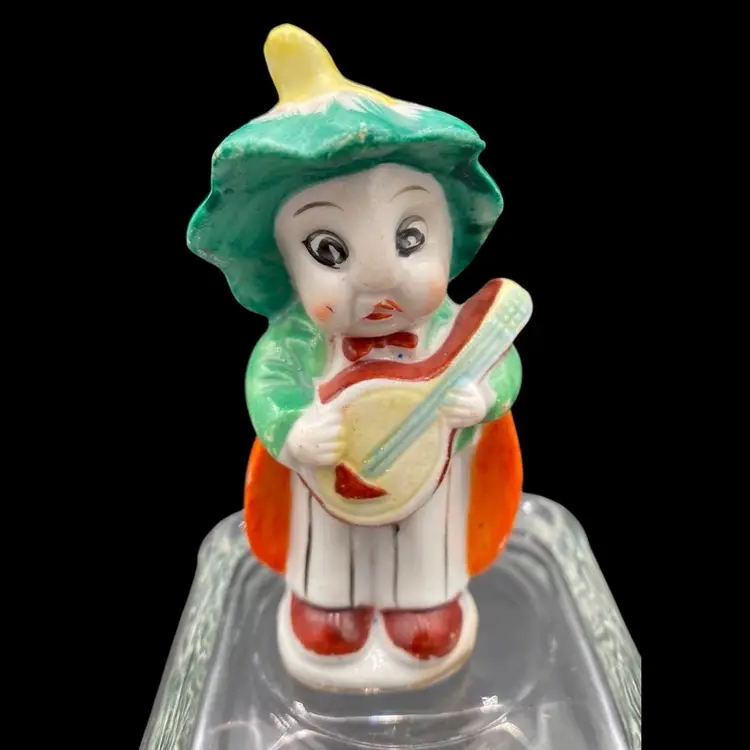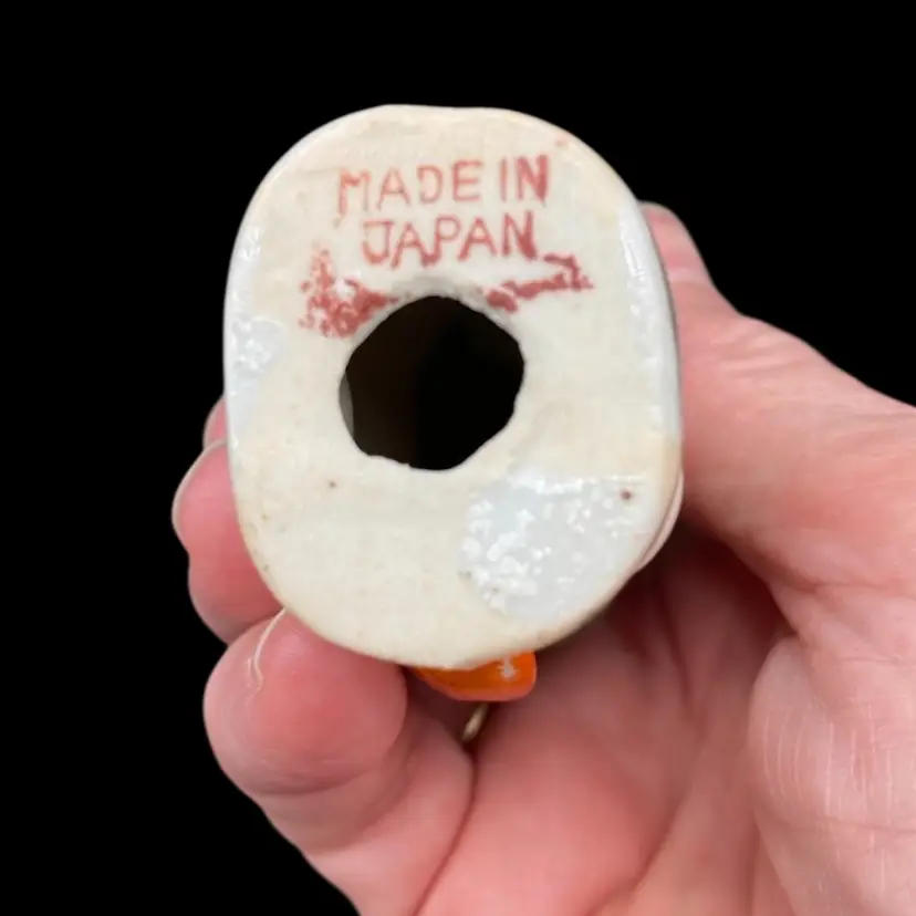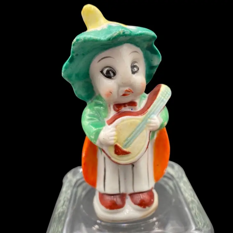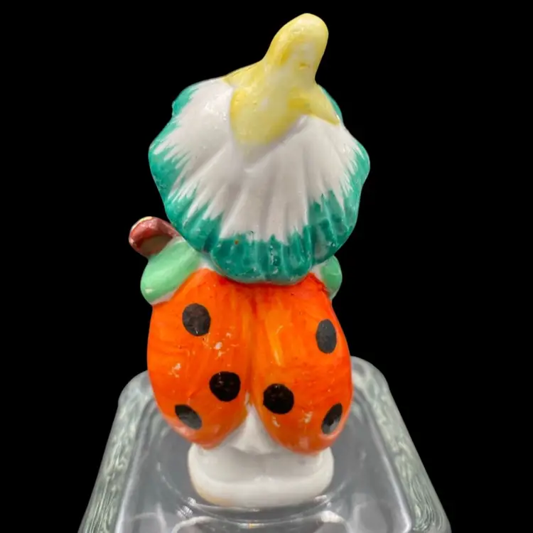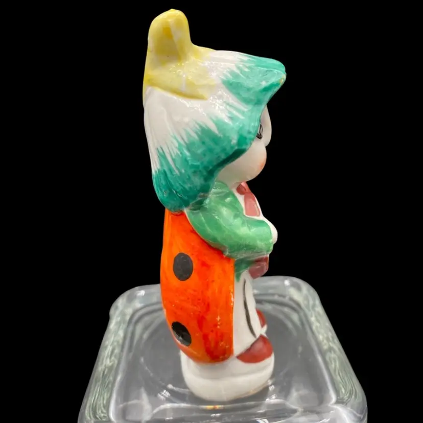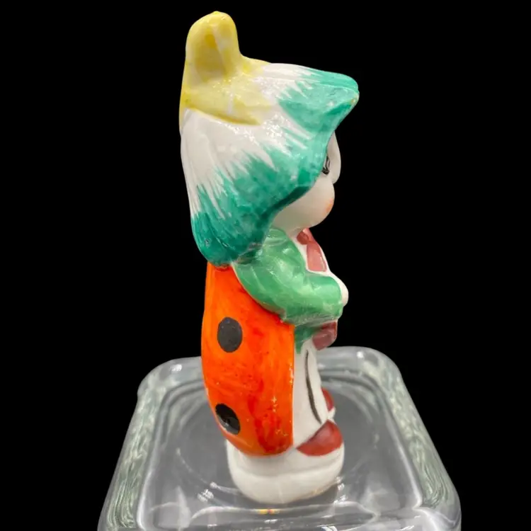 Add a unique touch to your collection with this vintage 1950s ceramic anthropomorphic ladybug figurine playing banjo. Crafted in Japan, this mid-20th century (1941-1969) porcelain figurine weighs 2.4 ounces and measures 4 inches in height and 2 inches in width.