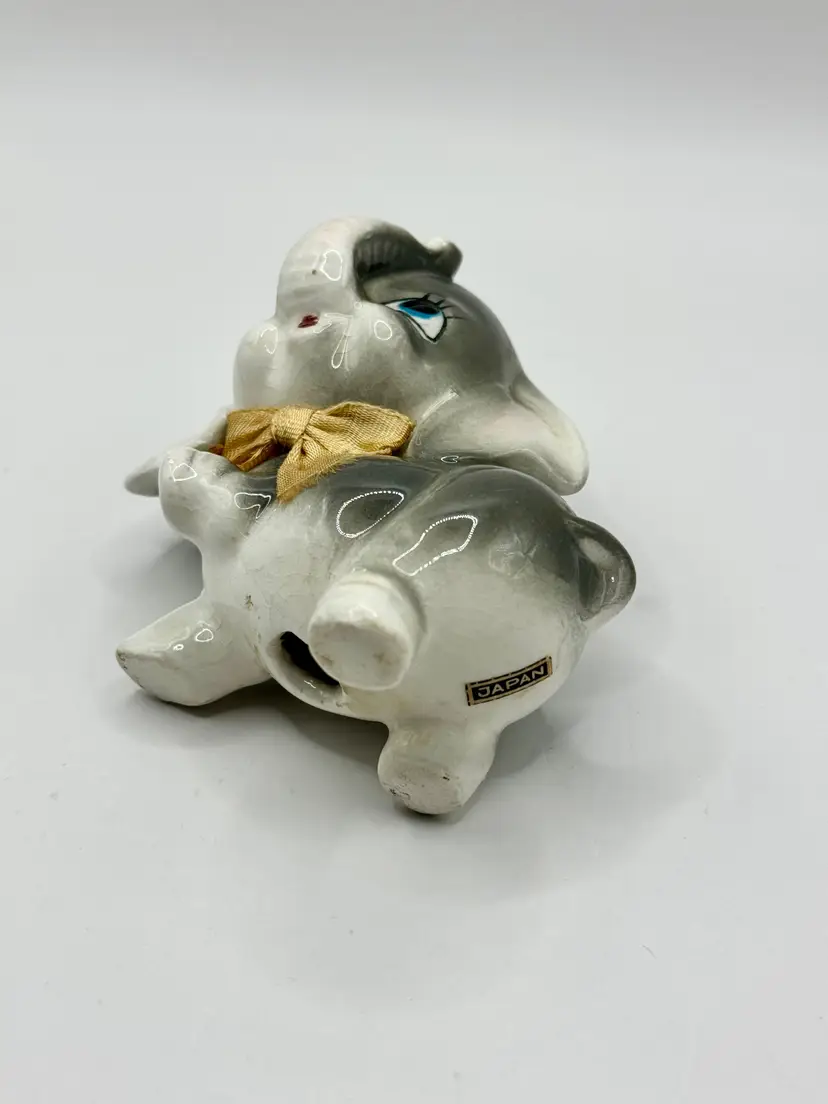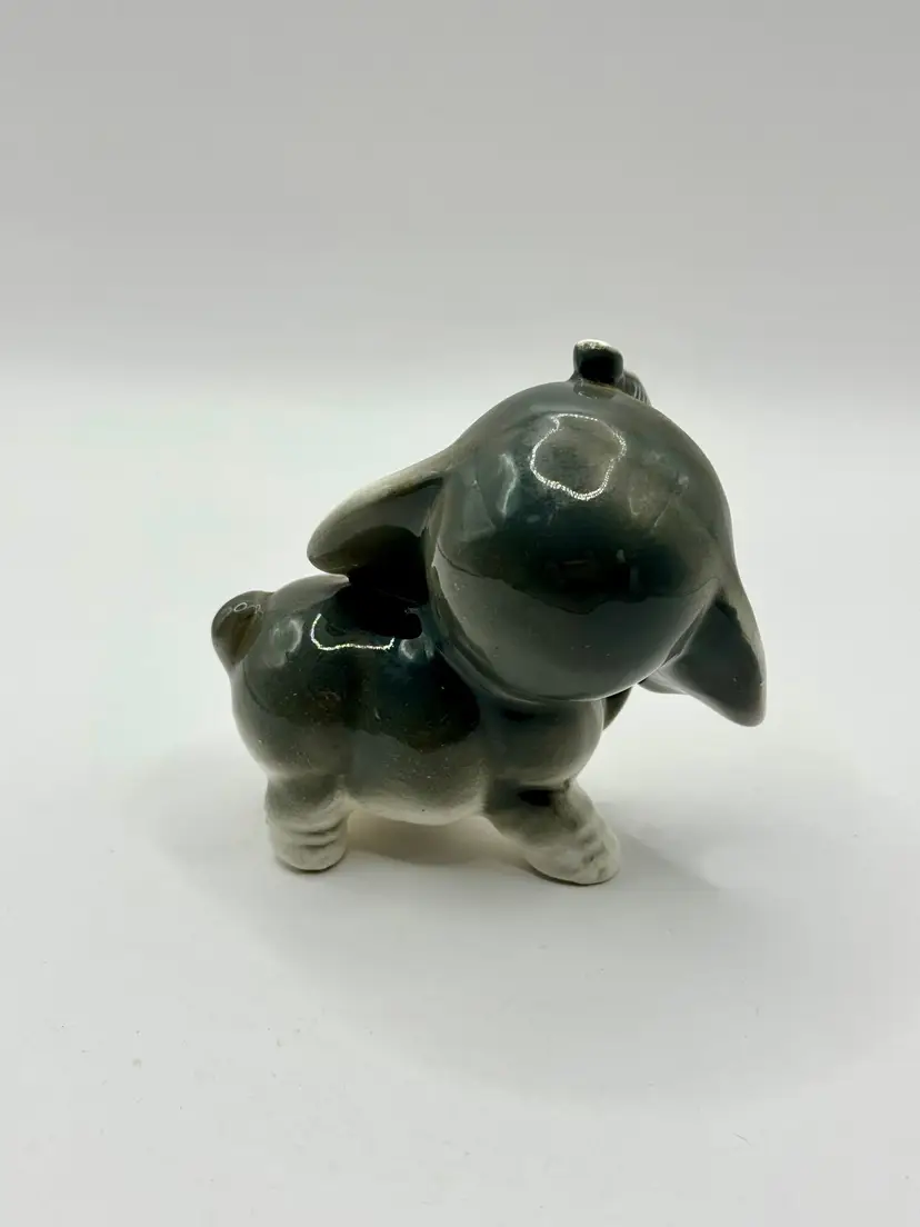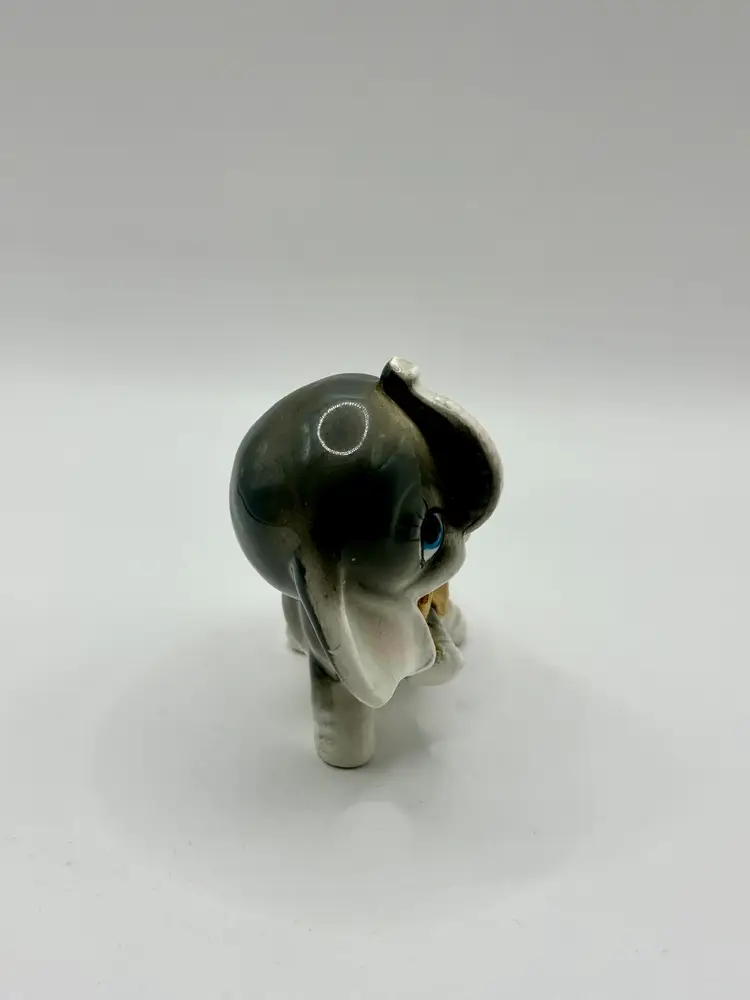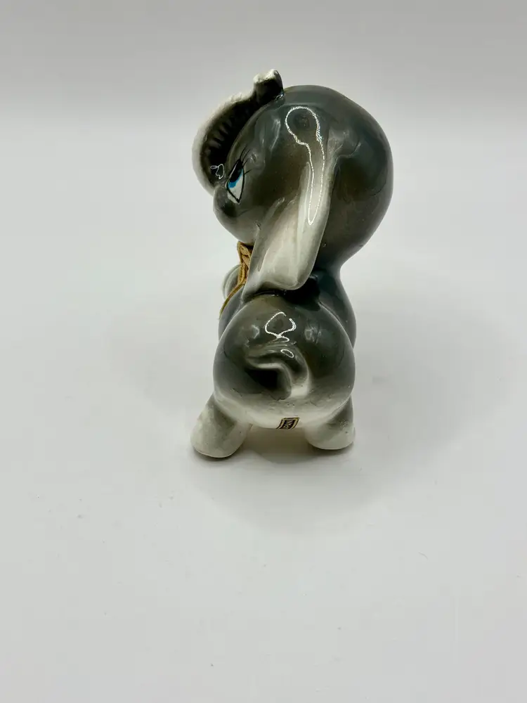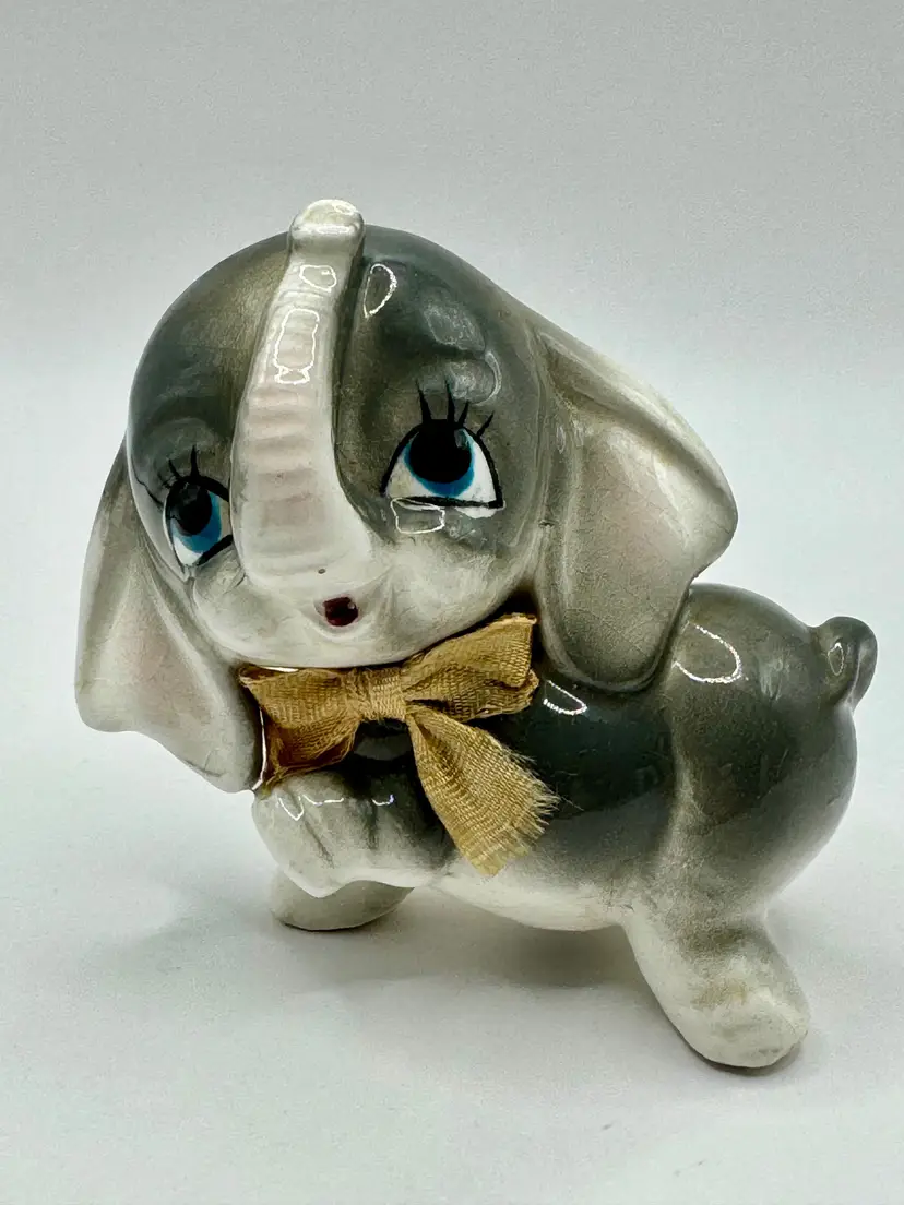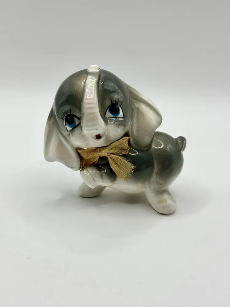Charm your space with this vintage ceramic elephant figurine, featuring a glossy grey finish and an endearing bow tie. Its large, expressive blue eyes are sure to capture hearts. A sweet addition to any figurine collection or as a standalone piece that brings a touch of whimsy to your decor. No visible damage. Measures 4.25x3.5x3.5. Weighs 1lb.