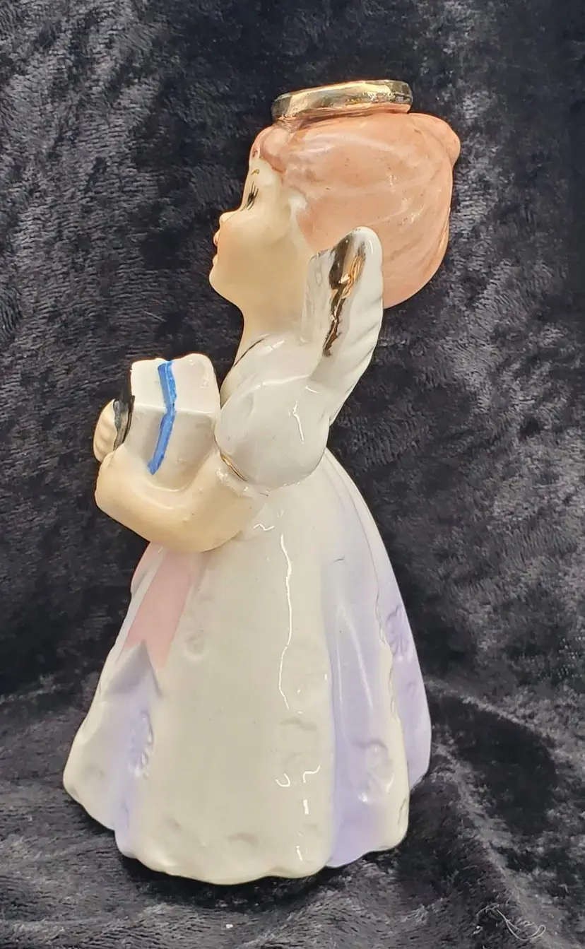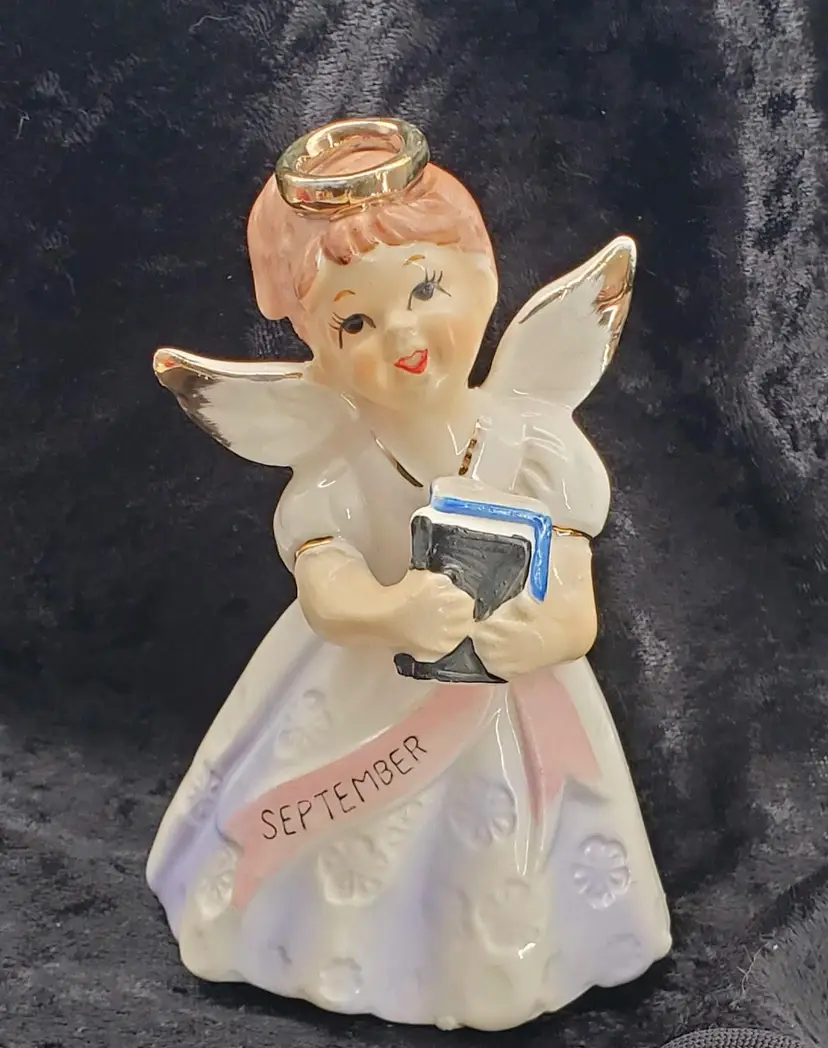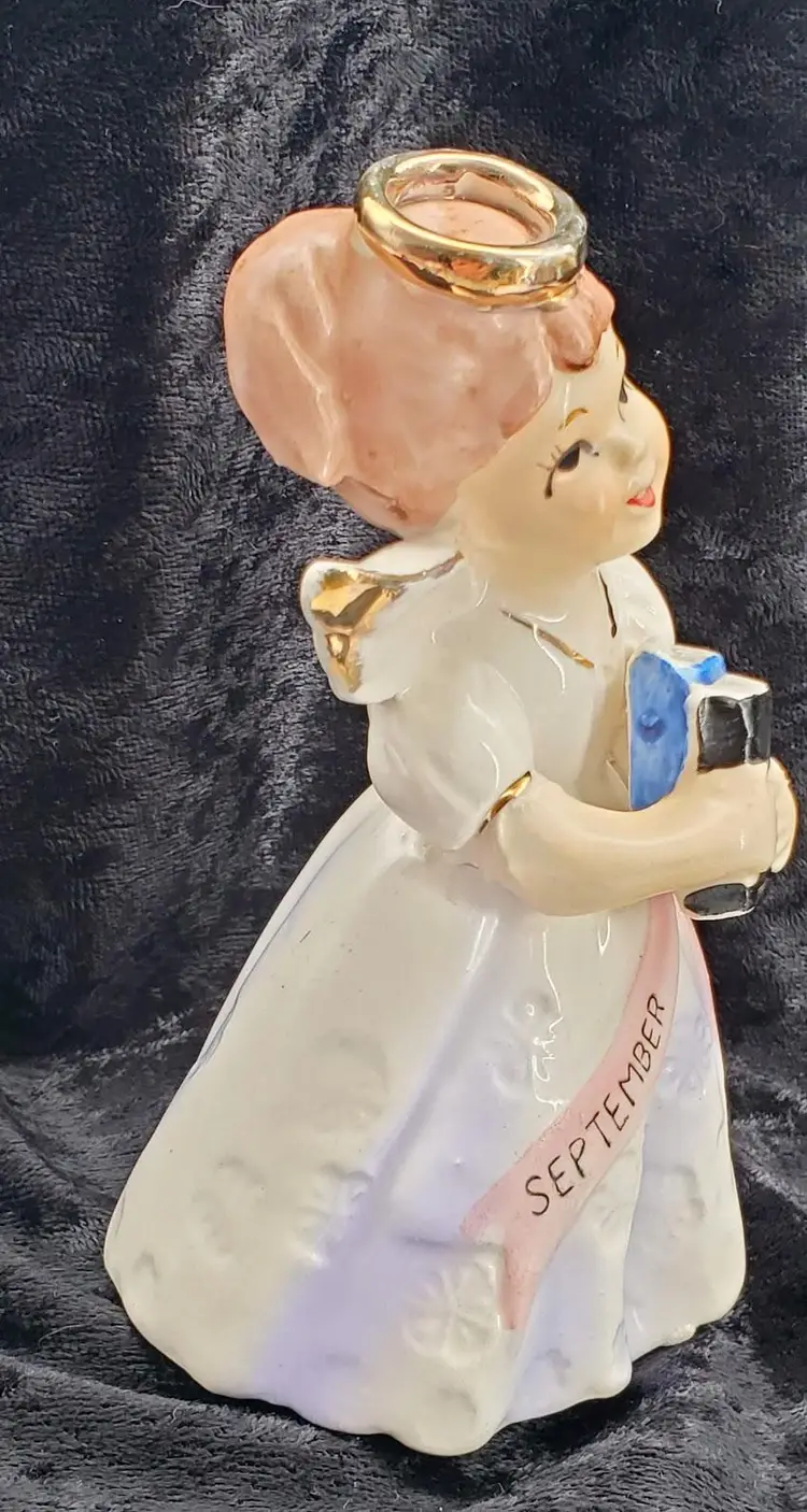 This vintage 1950's ceramic monthly angel figurine from Japan is typical of September birthday angels as she is holding her back-to-school books. She is dressed in her best lilac purple dress that is stamped with little flowers.
