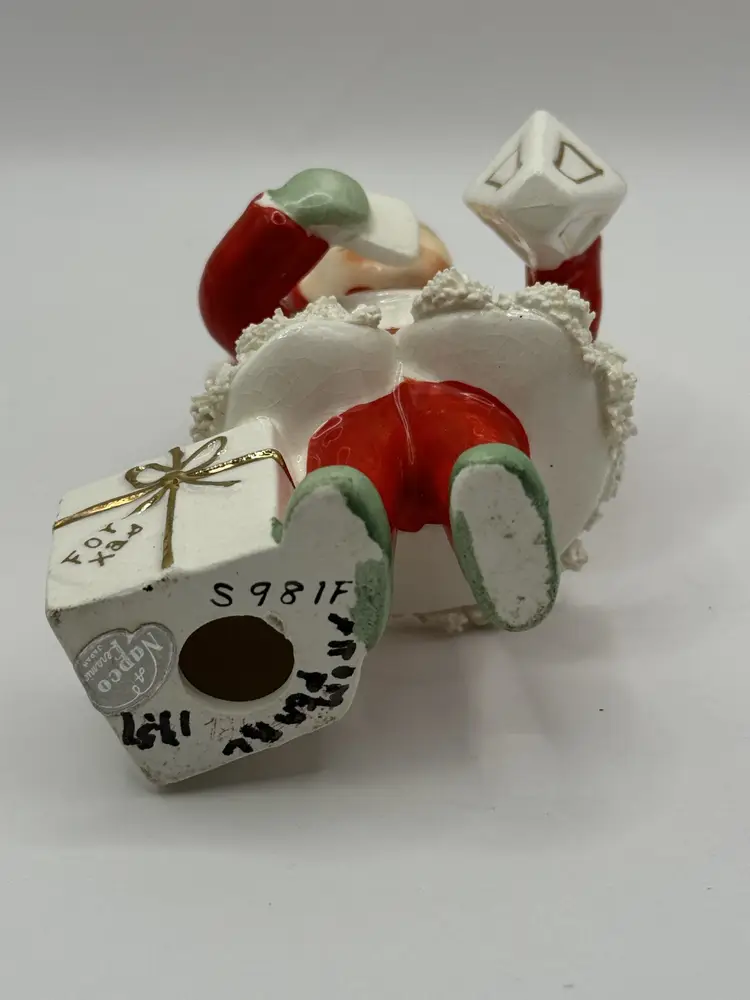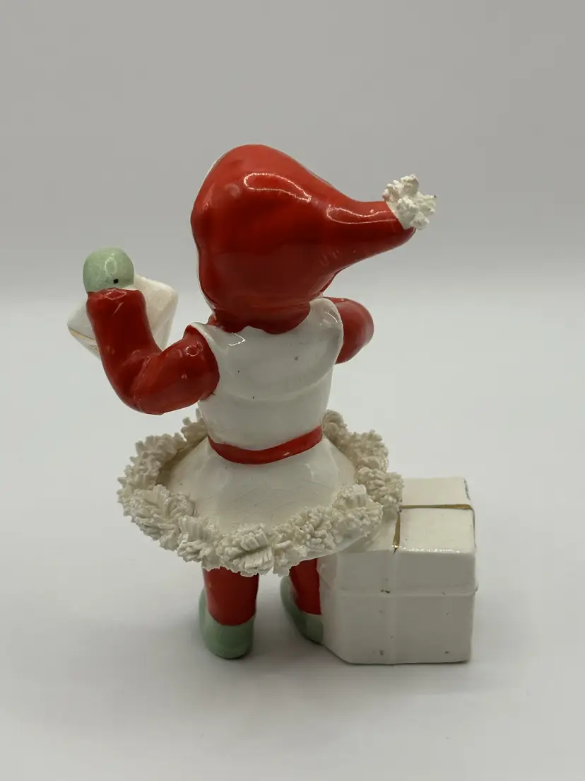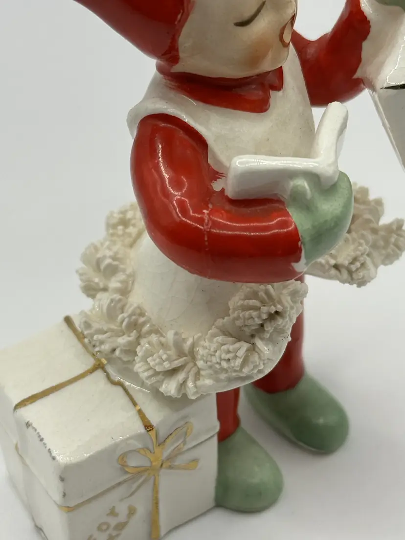 Bring holiday cheer to your home with this charming vintage Christmas spaghetti elf pixie caroler girl with lantern figurine. Hand-painted with delightful details, this ceramic piece features a caroler holding a lantern and a songbook, standing next to a gift box. Perfect for adding a festive touch to your holiday decor. Shows minor signs of age for authentic character. Repair on her right arm, not noticeable. Measures 4” inches. Weighs 2oz.