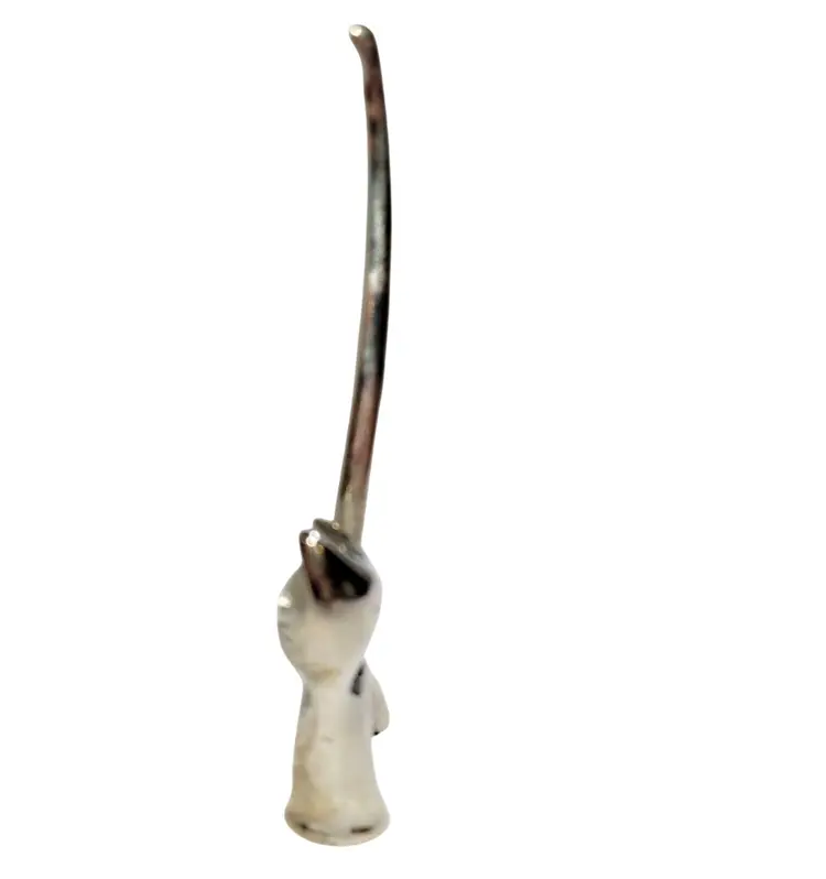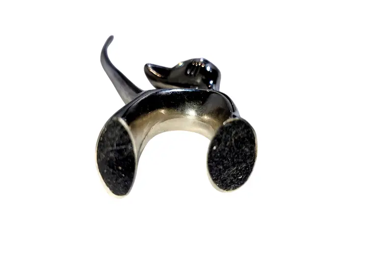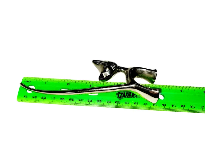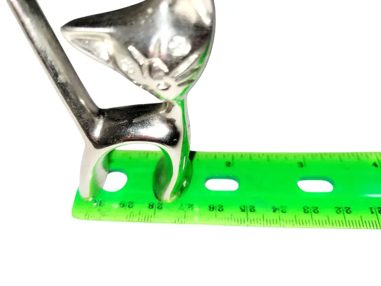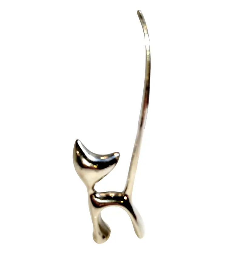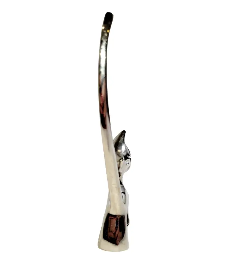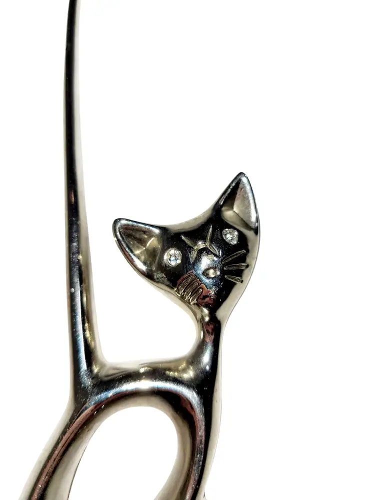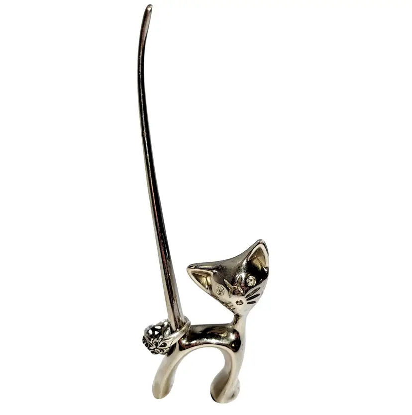 This mid-century chrome cat ring holder captivates with its sleek, elegant design and sparkling jeweled eyes. The long tail doubles as a practical ring storage solution, blending functionality with vintage charm. A timeless piece for collectors or decor enthusiasts.