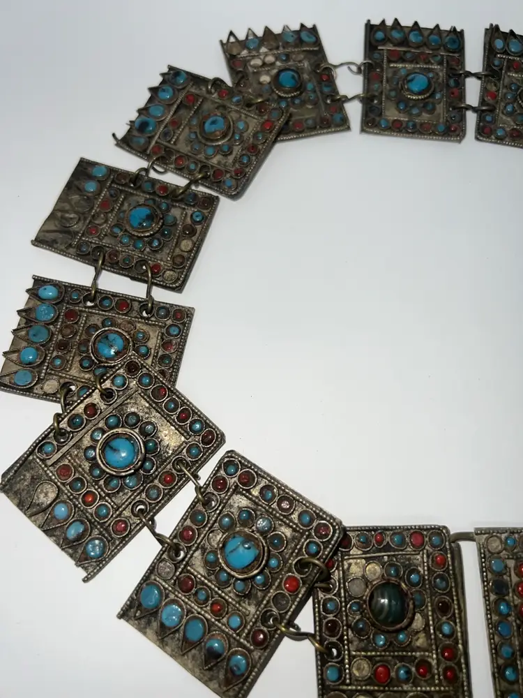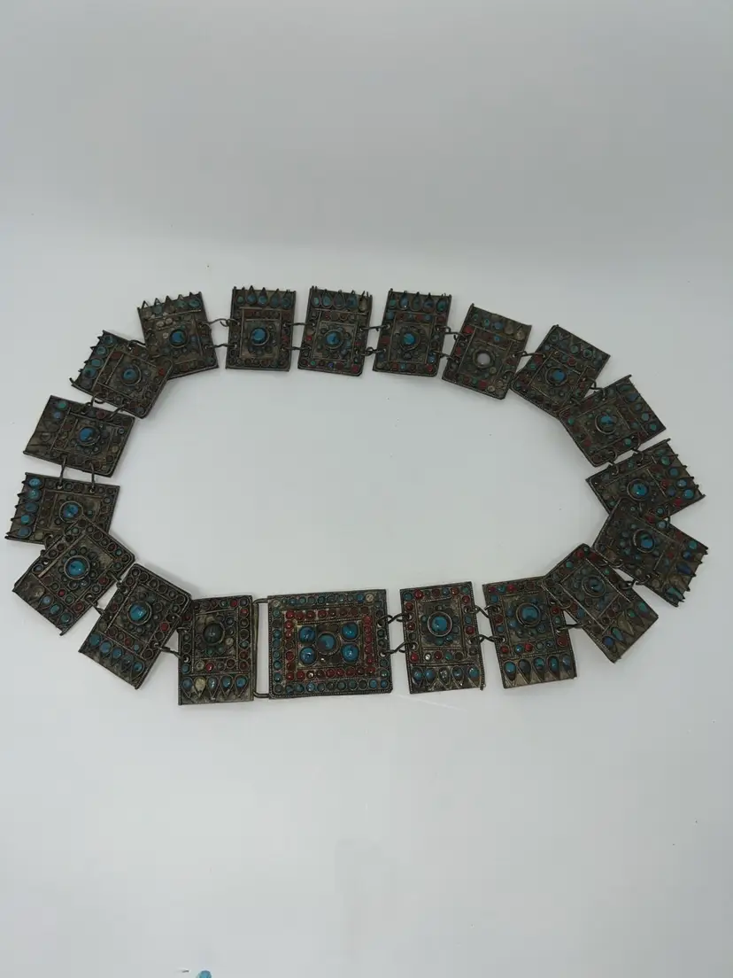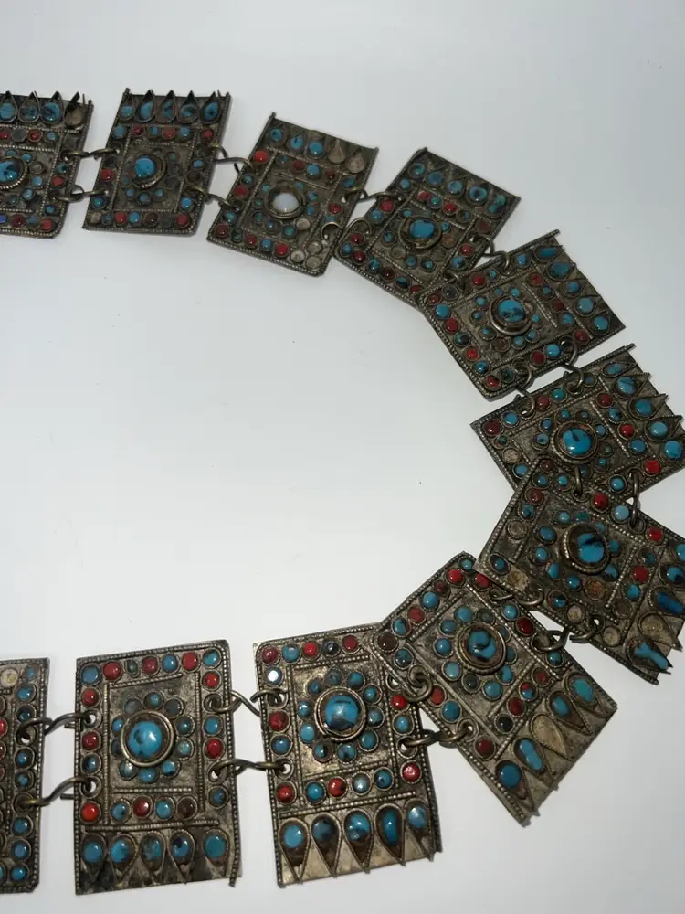 Add a touch of vintage to your wardrobe with this handmade artisanal belt from Nepal. The belt features a beautiful combination of coral and turquoise stones set on hammered metal, giving it a unique and rustic look. The belt is 32 inches in length, perfect for waist sizes between 31-33 inches or can be worn on the hip if you have a smaller waist.