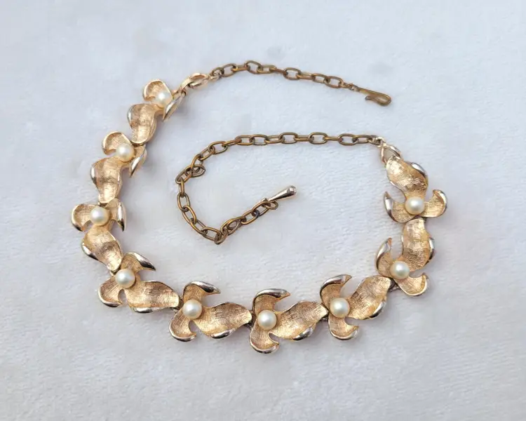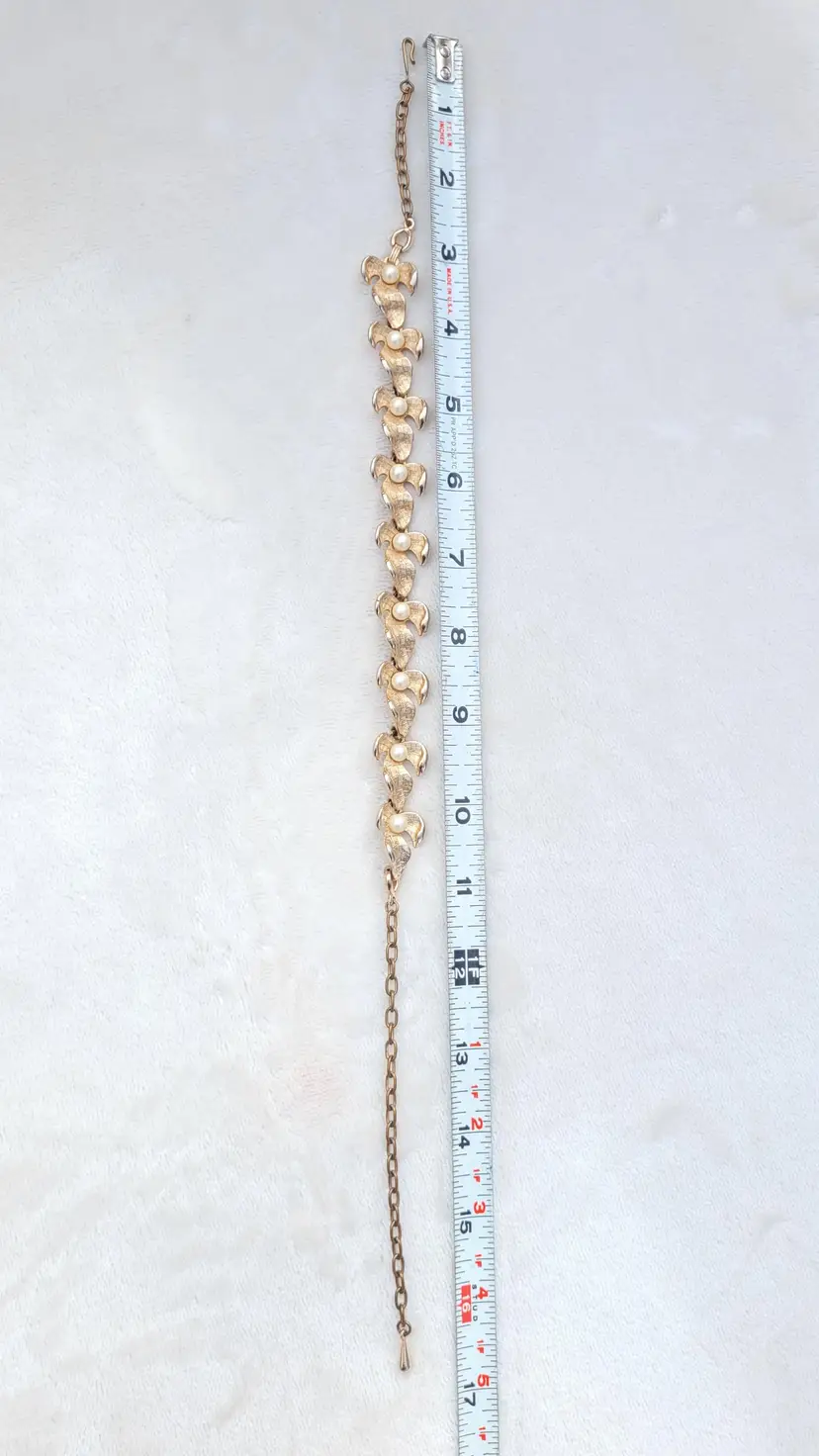 Classic faux pearl necklace! It is 17" laid flat and can be made up to 6" shorter when worn depending upon where you hook the clasp. In good condition, please see pictures for details and measurements.