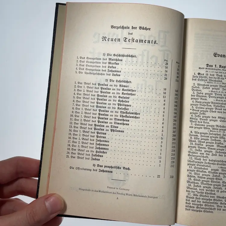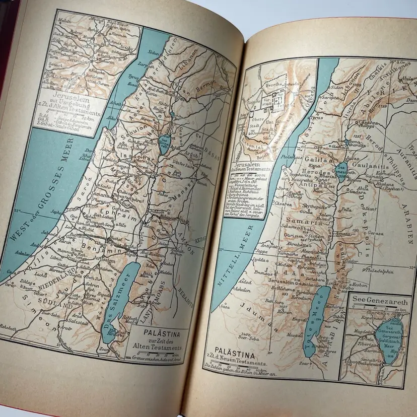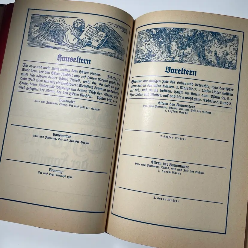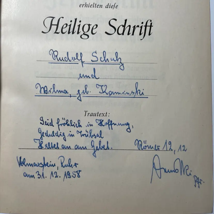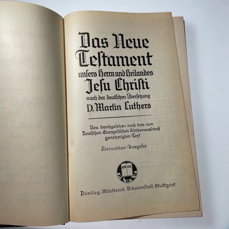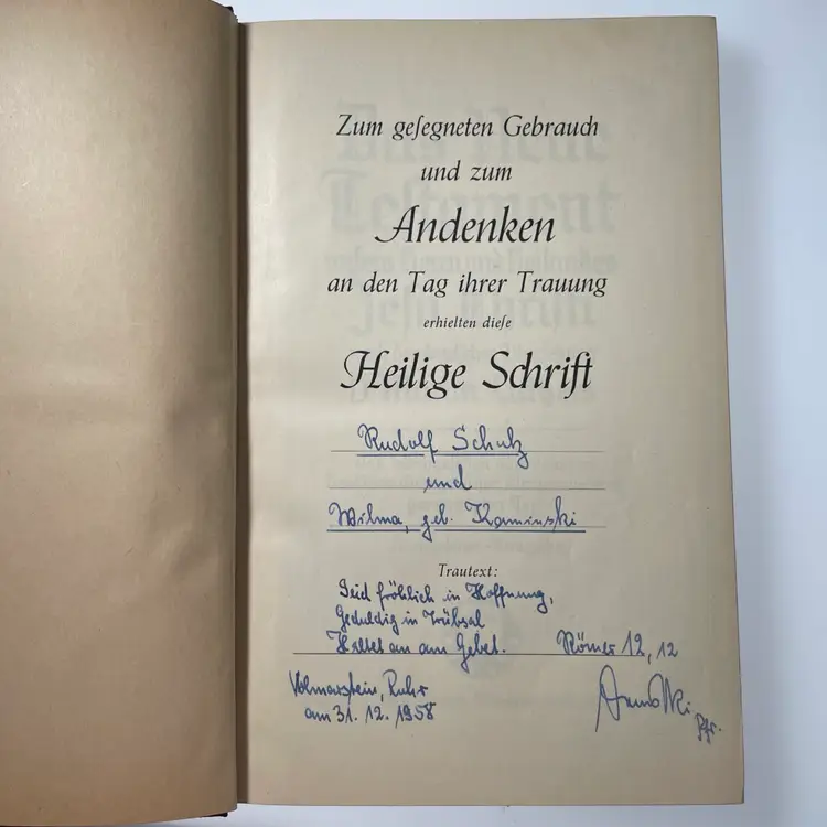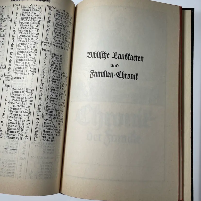 Includes Psalms. Wedding day inscription inside dated 1958. Family chronicle is blank & ready to use if of interest. Maps at the back of the book following the chronicle.