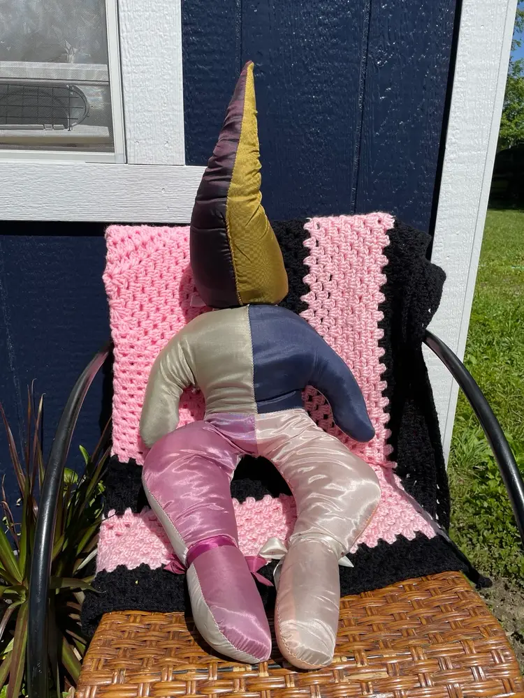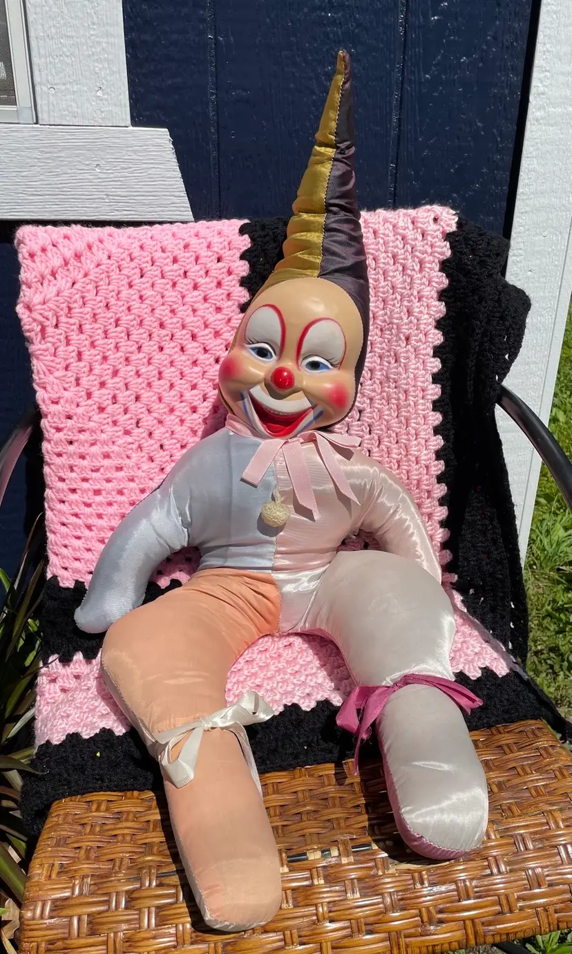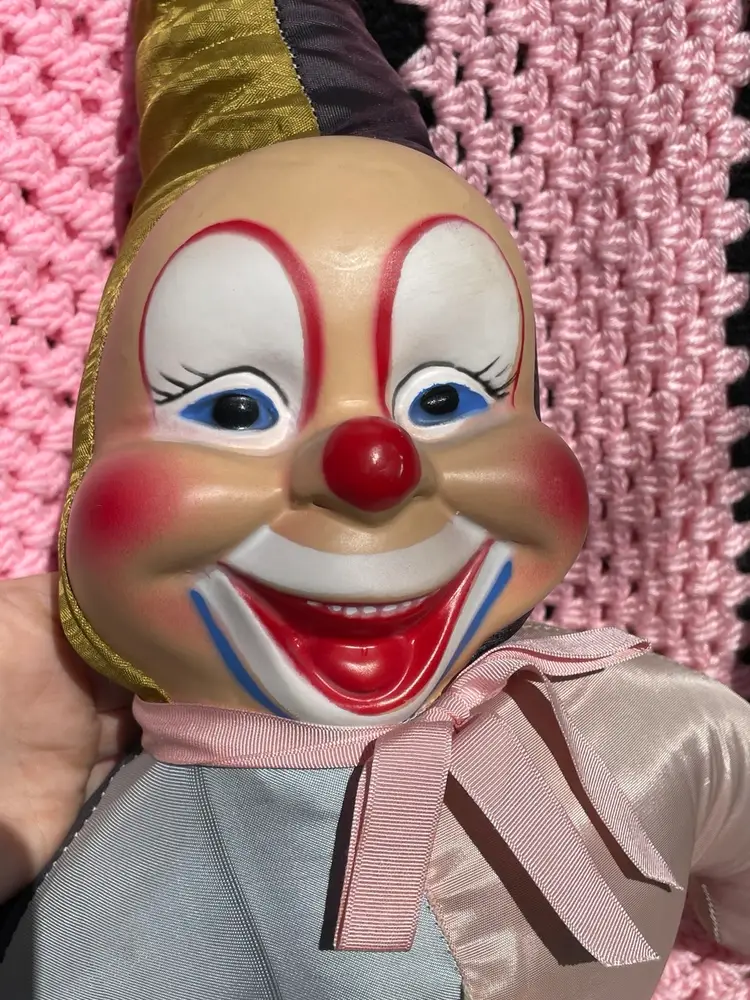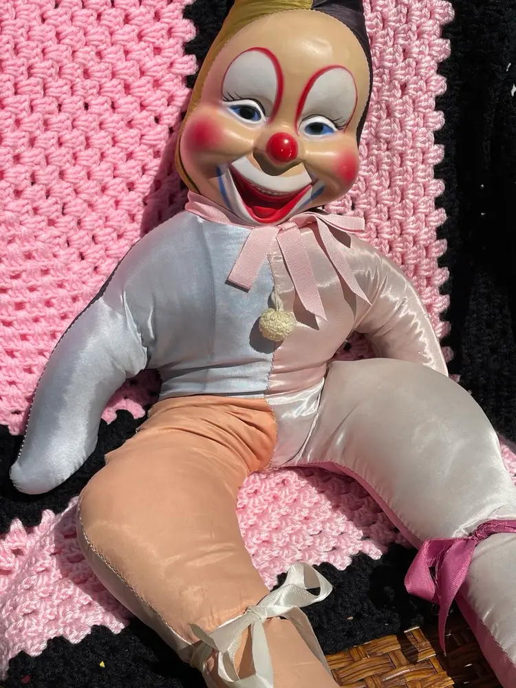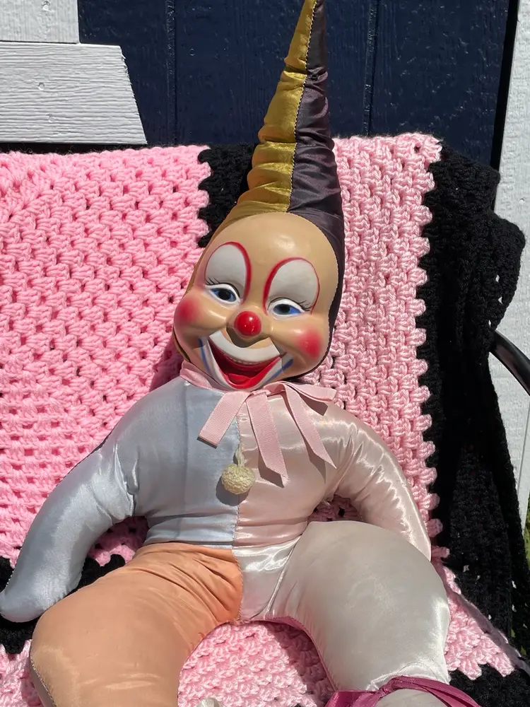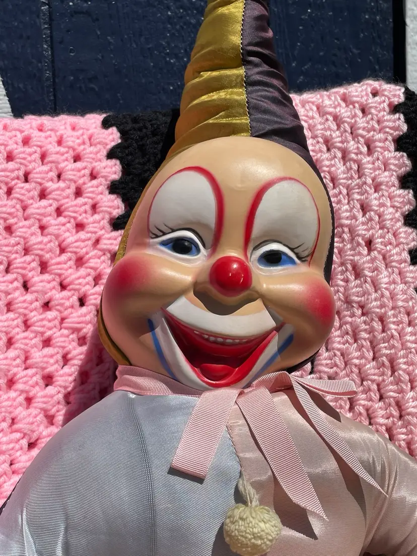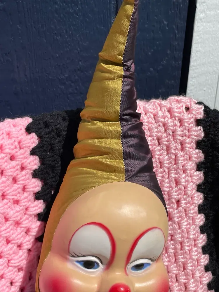 Vintage 1950s Hard Faced Clown Jester Large Plush Doll Retro Colorful Costume