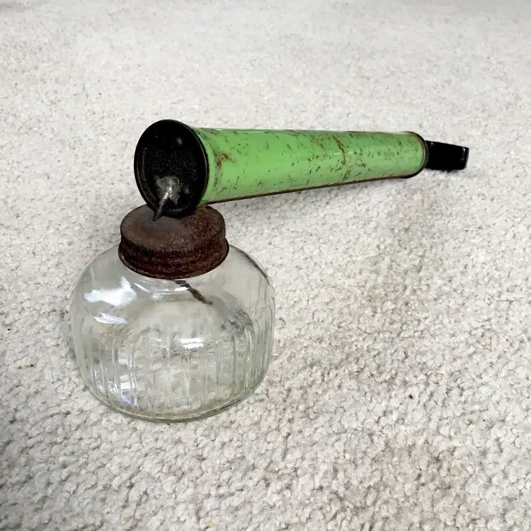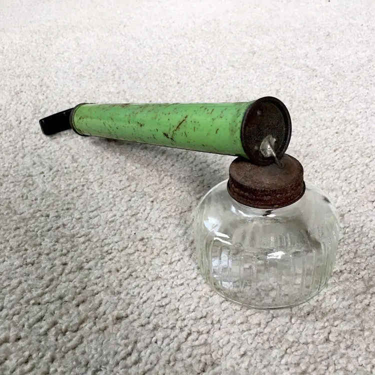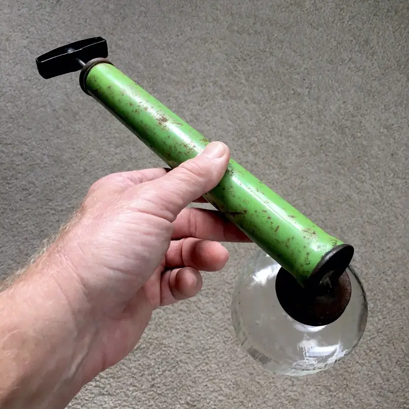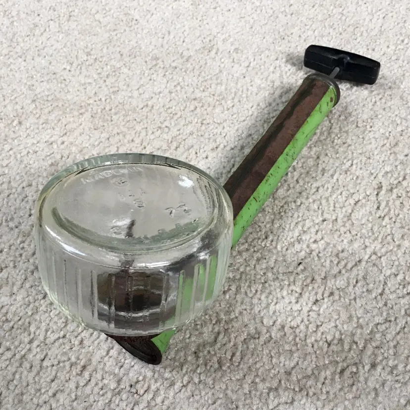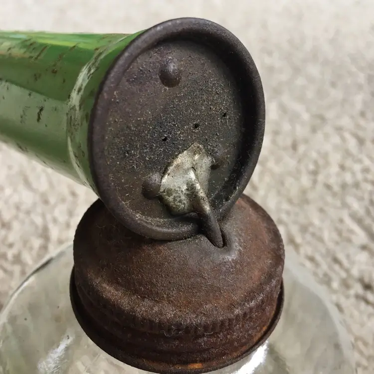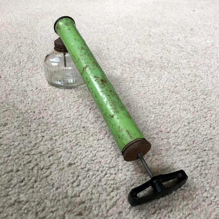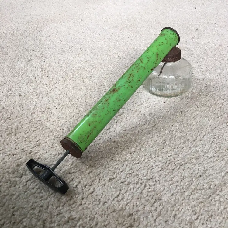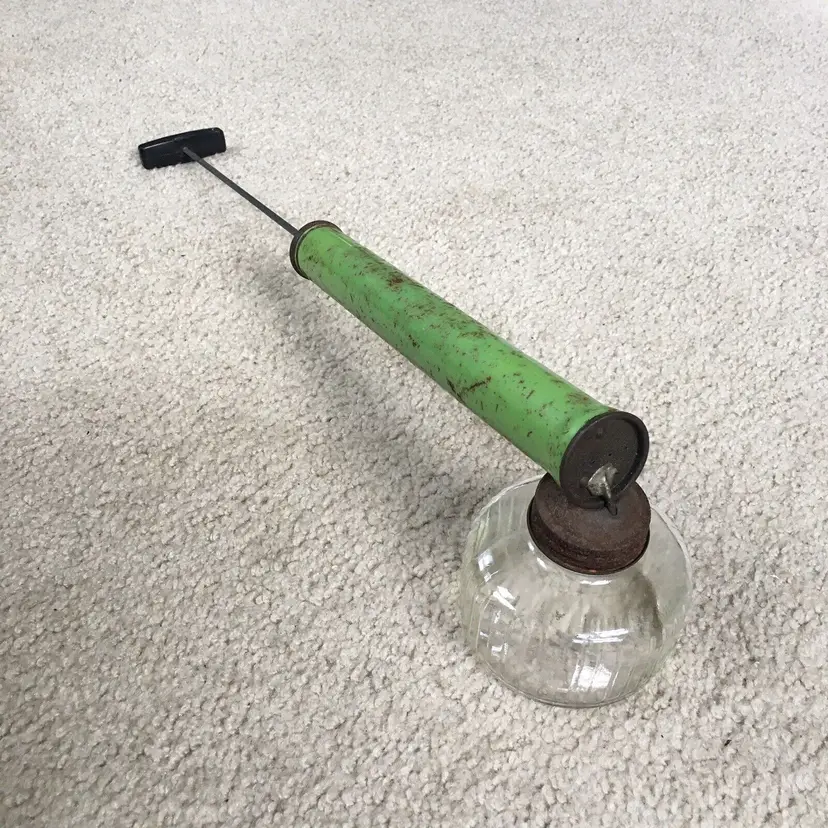 Vintage bug insect metal pump sprayer/duster with clear glass tank jar made by Hudson Manufacturing Co. in Chicago, Illinois. Missing original paper label, but definitely made by Hudson. Dates to about the 1950s. Good overall condition with scratches and wear to the original Old World green paint. Surface rust as shown. Has a great rustic patina and ready for display or actual use!! Untested but pump handle extends as normal and there’s very good compression when pumping. Small streams of air come out the front openings of the sprayer as normal when pumped. Clear glass tank jar unscrews from sprayer as normal. No cracks or chips to the ribbed glass. Minor chemical residue inside jar. Black plastic pump handle with small crack, but still functional. Sprayer measures about 13.25” long with handle in closed position, and 22” long when fully extended. See pics for more details.