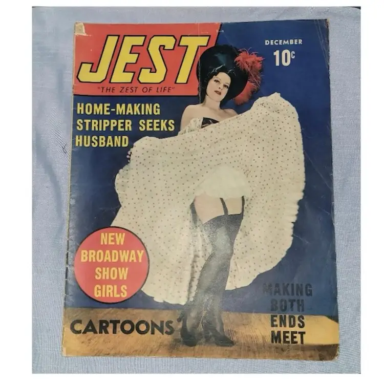 Classic 1950s Jest magazine featuring playful cover art and entertaining articles. A nostalgic piece for collectors of vintage publications. In good condition with some wear on the edges.