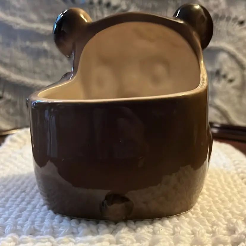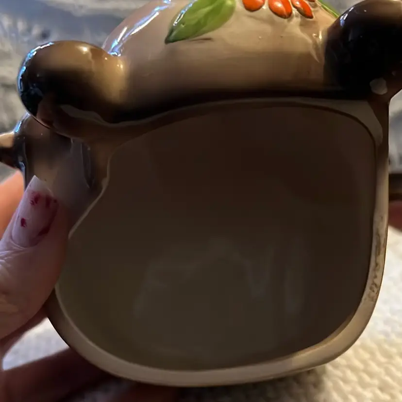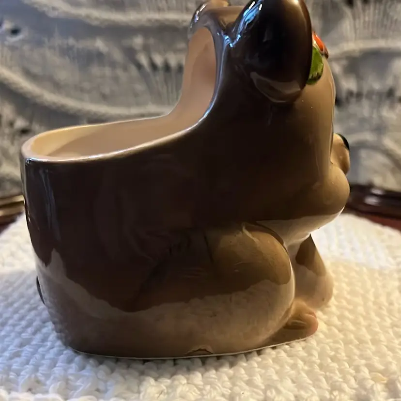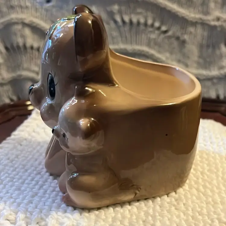 This cute sweet planter was made in Japan by Inarco. It was made in or around the 1950s and is 4.5 inches tall and 4 inches wide. The bears have a brownish white color to them with the mama bear having an orange flower on her head.