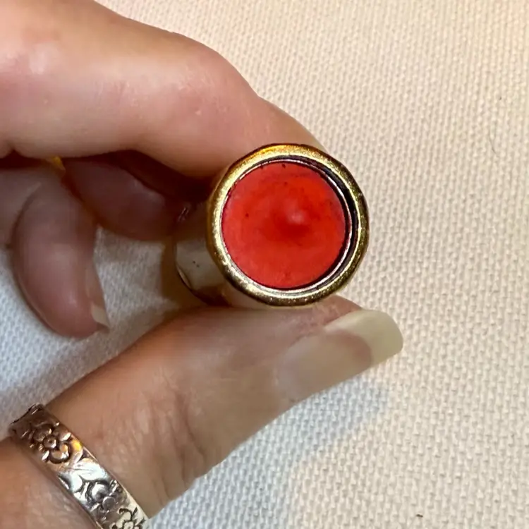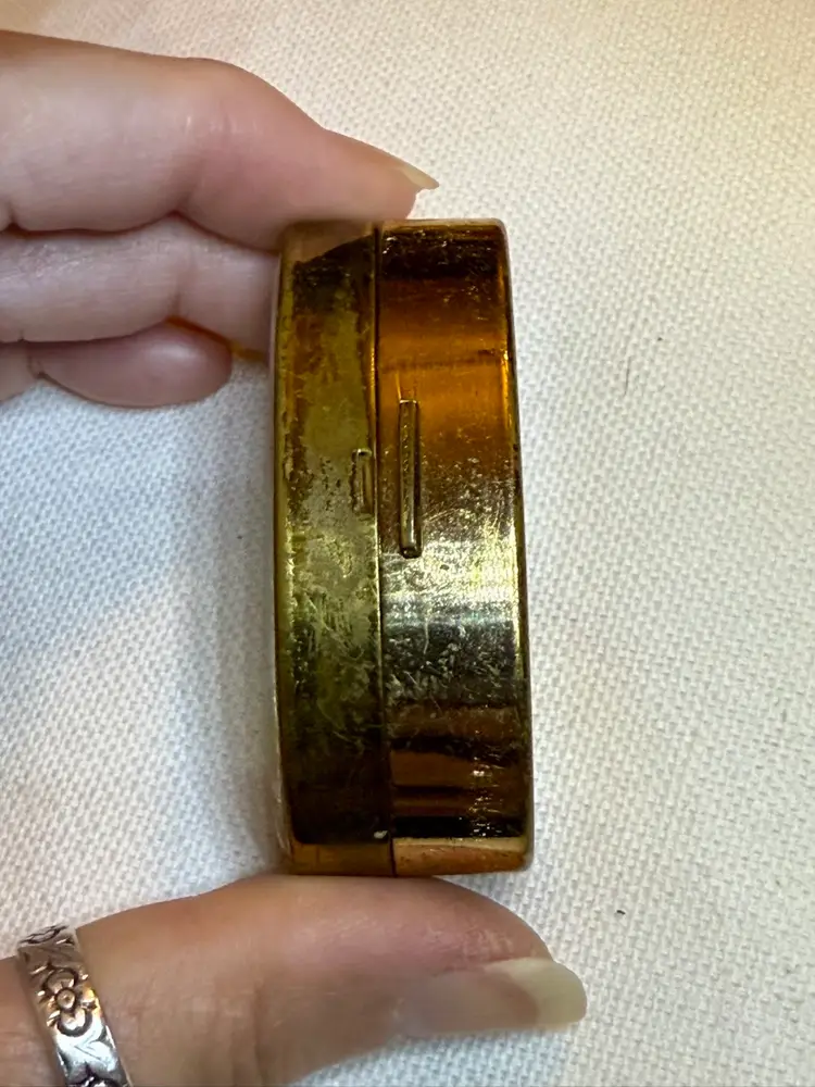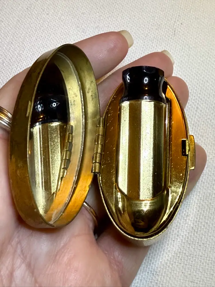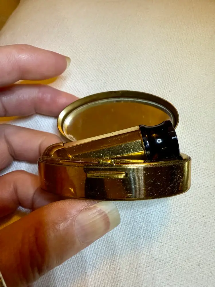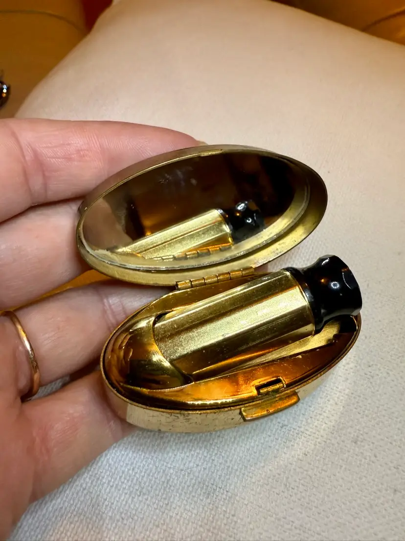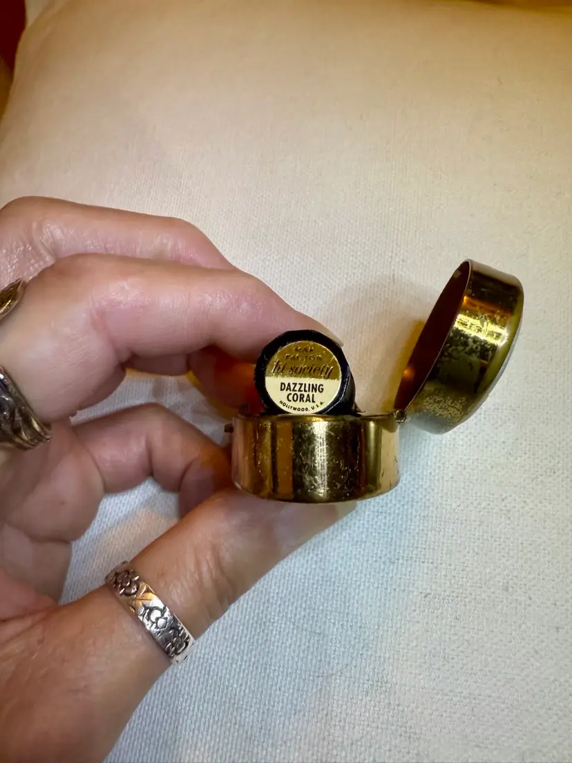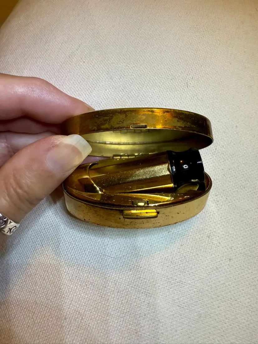 1950’s glamour at its best in this wonderful lipstick case purse compact. Push the button and the hinged mother of pearl lid pops open. It has a spring loaded sheet of metal that pops up and presents your tube of lipstick to you. The original (used) lipstick -- "Danzling Coral" from Max Factor High Society -- is still inside.