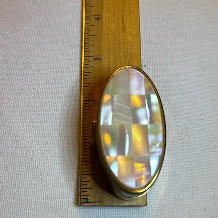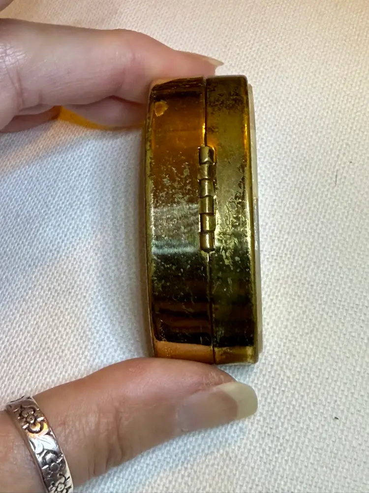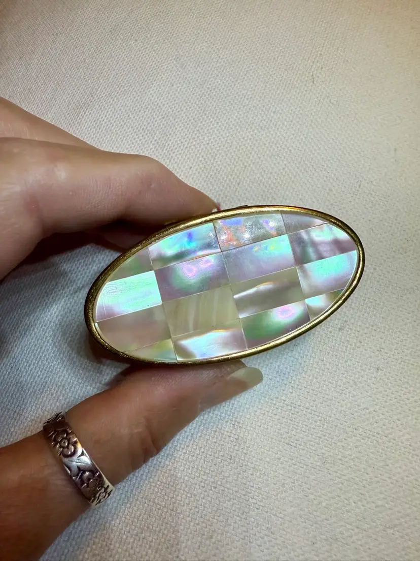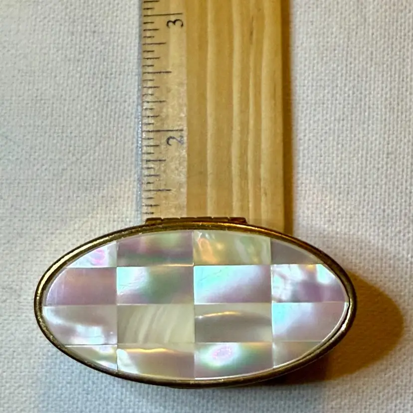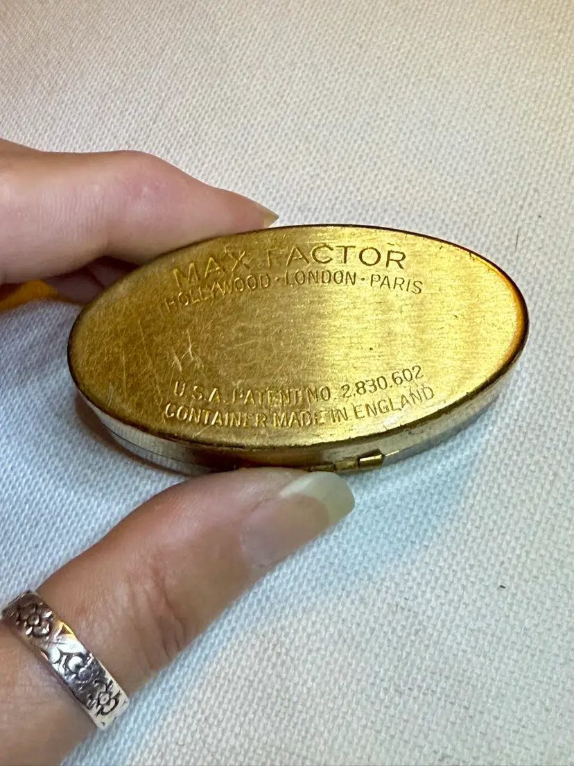 Hallmarked "Max Factor Hollywood • London • Paris USA Patent NO 2,830.602 Container made in England". Lipstick is marked "Container Made in USA." Compact measures 2 1/4" x 1 1/8" x 3/4" high. There is some wear to the gold tone exterior. Lipstick is used only a remnant of the bright coral color remains inside. Mother of pearl inlay is in great condition and this is just a treasure to behold.