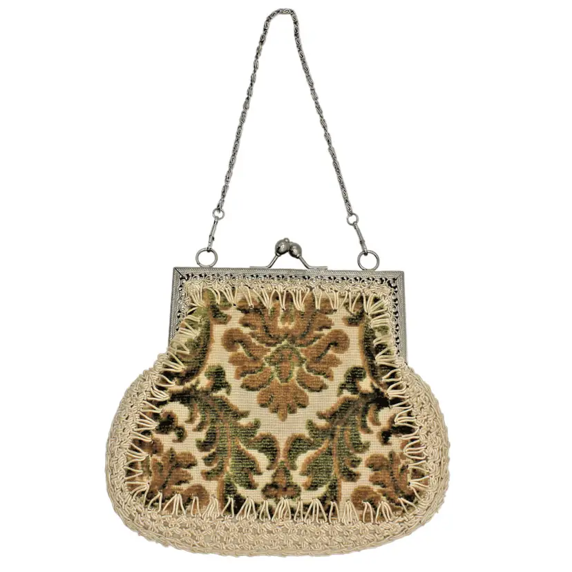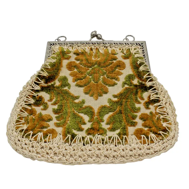 Handmade in Italy Color is ivory with sage and gold Macramé border Purse is trimmed with silver alloy Chain is silver alloy Original label: Mister Simon Ernest Made in Italy