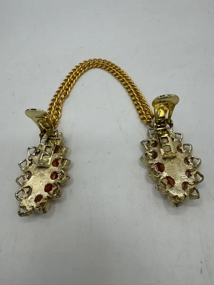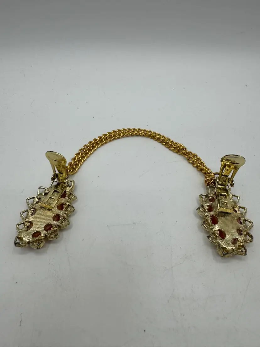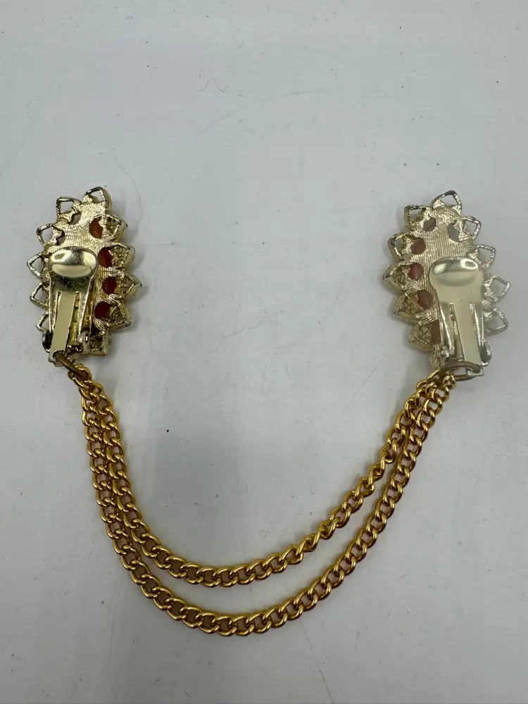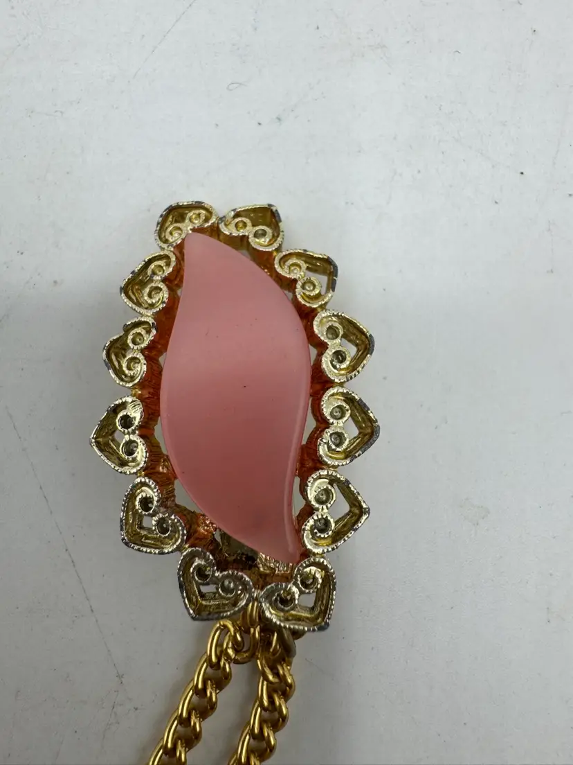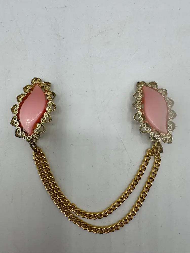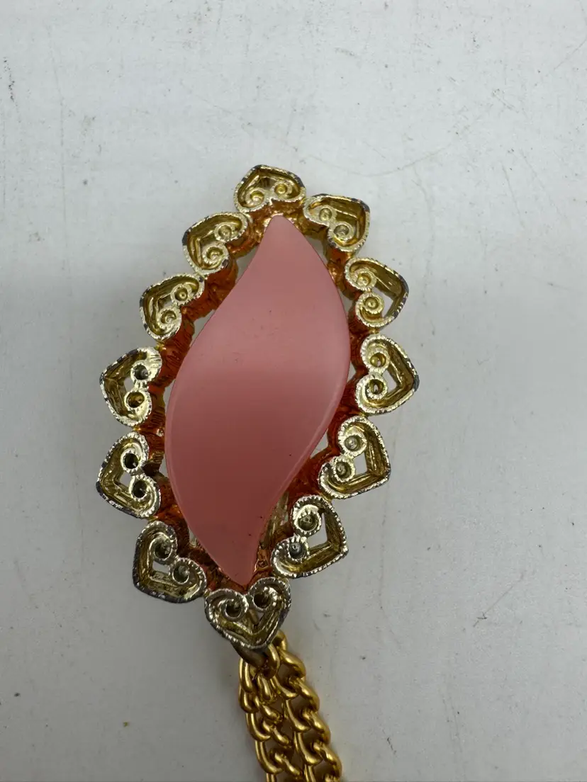 This beautiful Vintage 1950’s Pink Thermoset Sweater Guard is a charming piece of jewelry that adds a touch of retro flair to any outfit. Made from durable Thermoset material, this sweater guard features a vibrant pink color that stands out effortlessly. Perfect for vintage jewelry collectors or those looking to add a unique accessory to their wardrobe, this piece exudes a timeless elegance that is sure to make a statement. Good condition. Has a bit of gold loss around hearts. Please see photos. Measures 8”