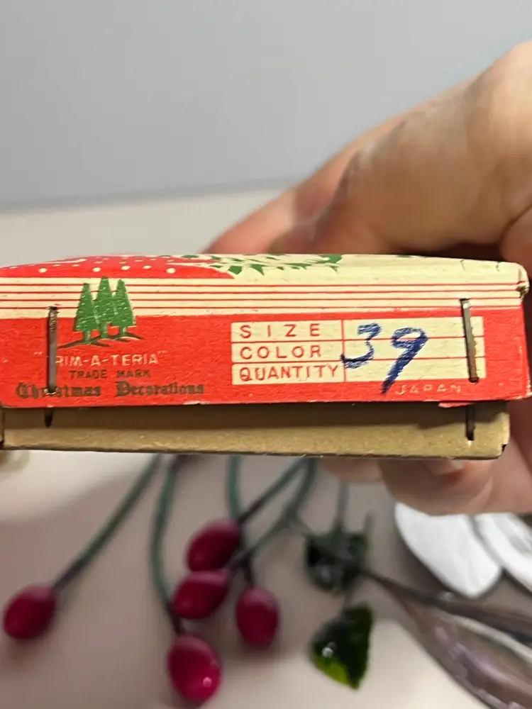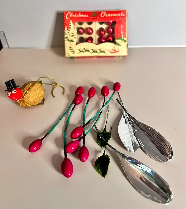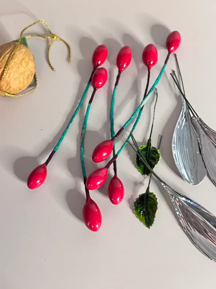 Vintage floral pins. Red berries, silver leaves, green leaves