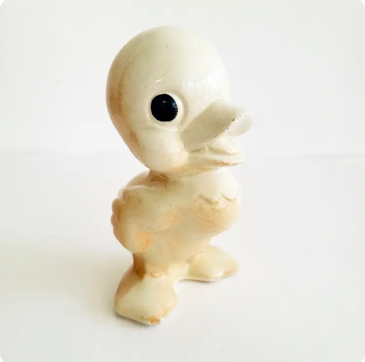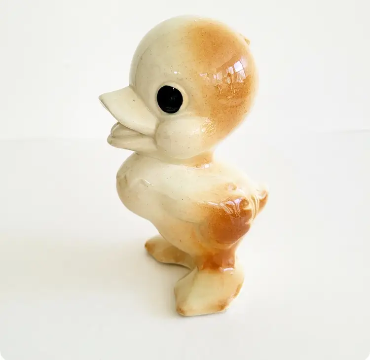 Vintage 1950s Rempel Diamond Pottery Squawky The Duck. Designed by Ruth Rempel, the pottery was molded from her famous squeak toy design. No chips to the pottery, some crazing present. Measures 5 in x 3 in.