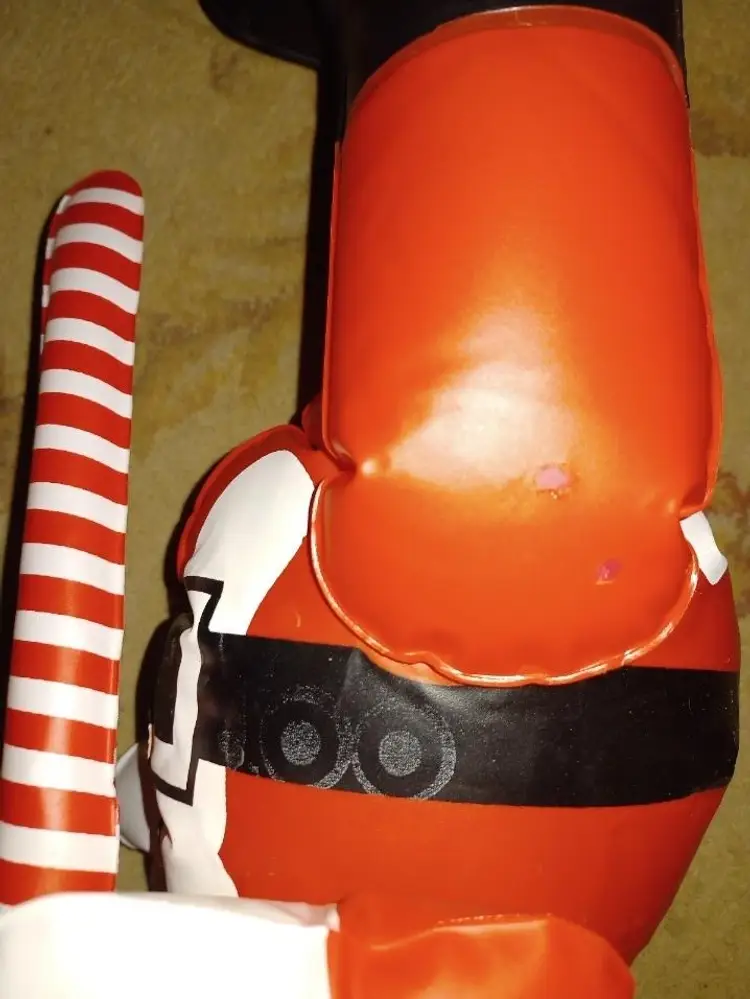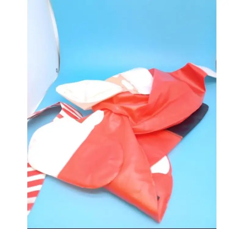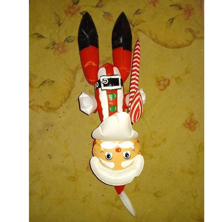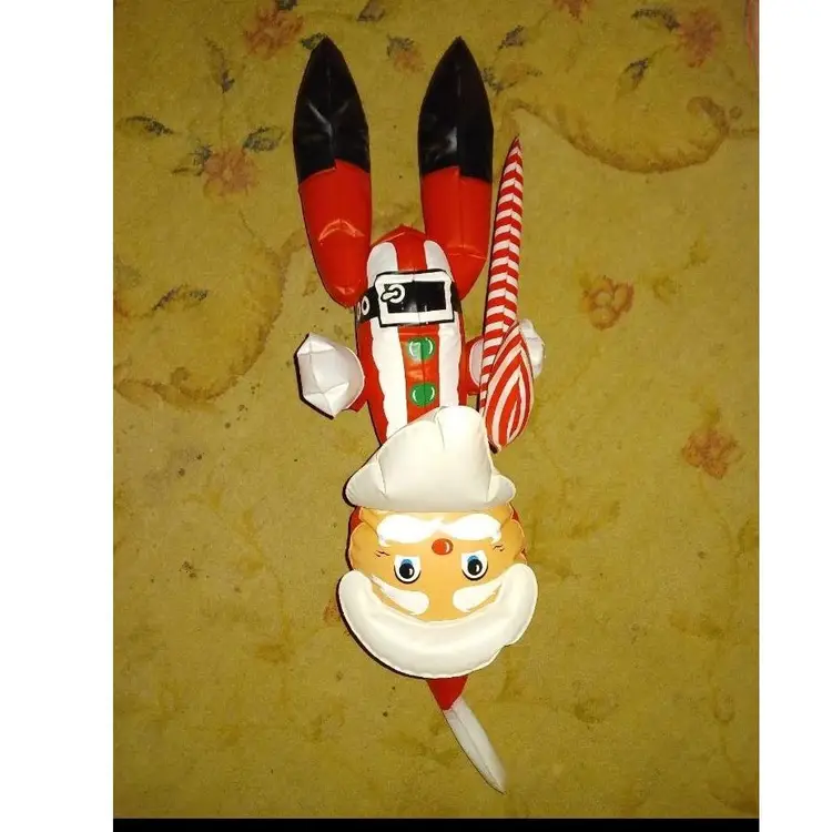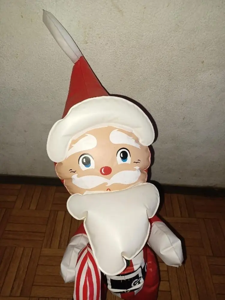 Vintage 1950s Santa blow up measures 26 in tall New Old Stock it was completely flat this is the only time that has been blown up for pictures. Holds air great. Does have a few spots on the plastic from packaging glue?? It did scratch off but did leave a little bit of color did try to picture it's on the leg does squeak when you squeeze him it is the old style blow hole that the air rushes out when you try to put the stopper in. Please see all pictures as they're the best description all items from a smoke-free home with pets experienced shipper