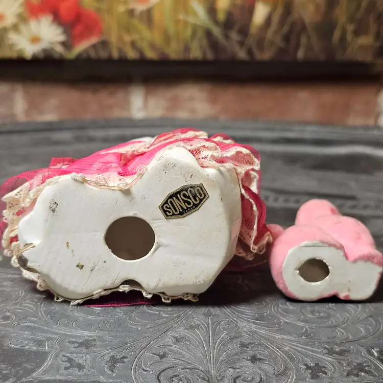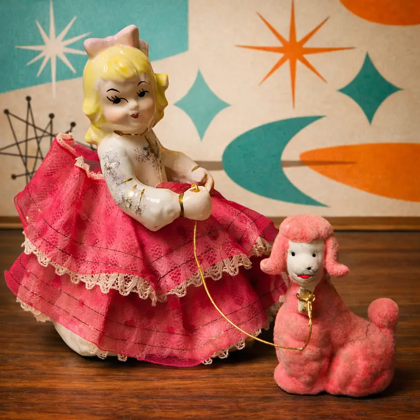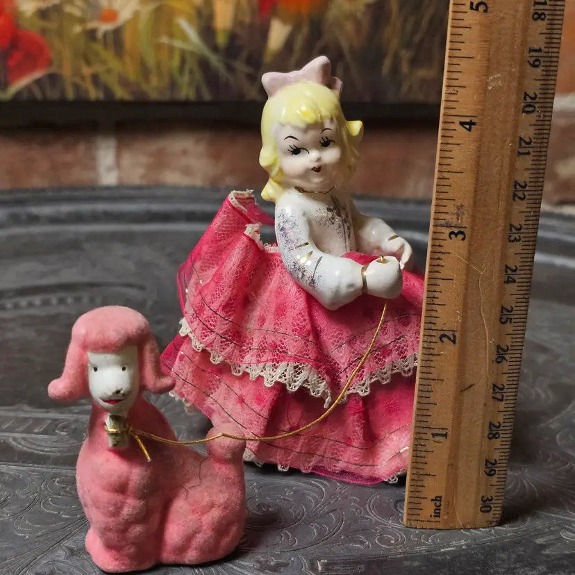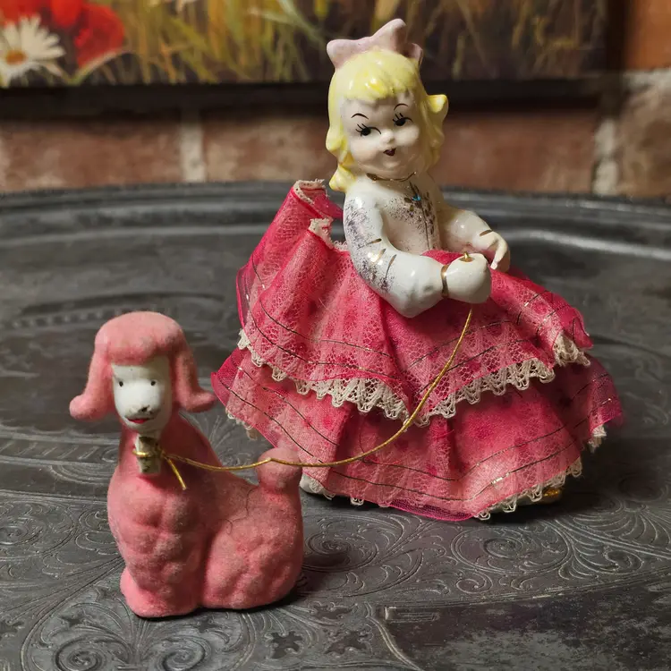 Condition: Good vintage condition with age-appropriate wear. The girl shows light crazing, some paint wear, and fabric aging; the flocked poodle shows some flock loss/discoloration (typical for age). Overall displays beautifully. Please see photos for full details.