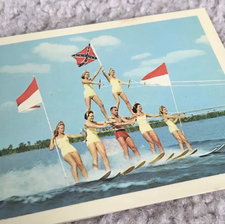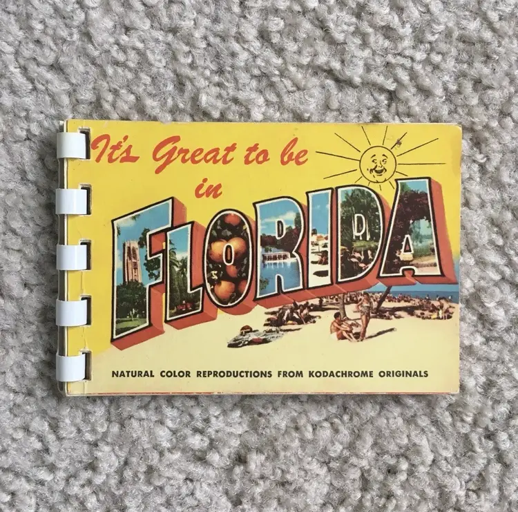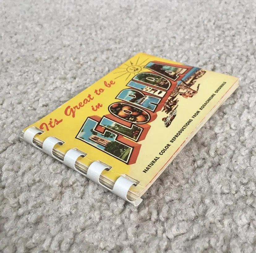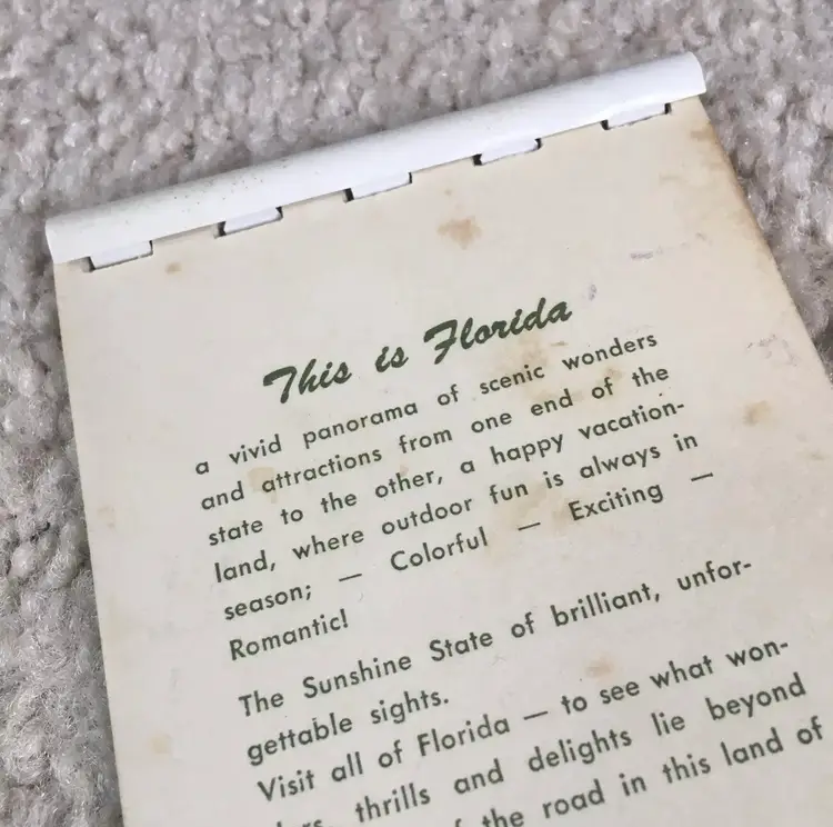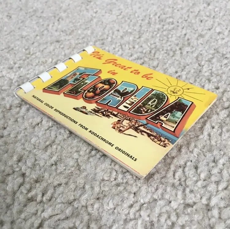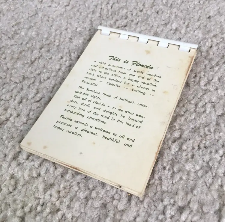 Vintage souvenir booklet of 10 color photos from original Kodachrome slides featuring various points of interest in Florida. Estimate this dates to the 1950s. Especially interesting is the waterskiing photo showing two women holding the Confederate flag of the south. Each photo has a corresponding description on the adjoining page. Item may be rare as I’ve not found another listed as available. Very good condition with some age spot foxing as shown. Measures about 4 1/8” x 2 3/4”. See pics for more details.