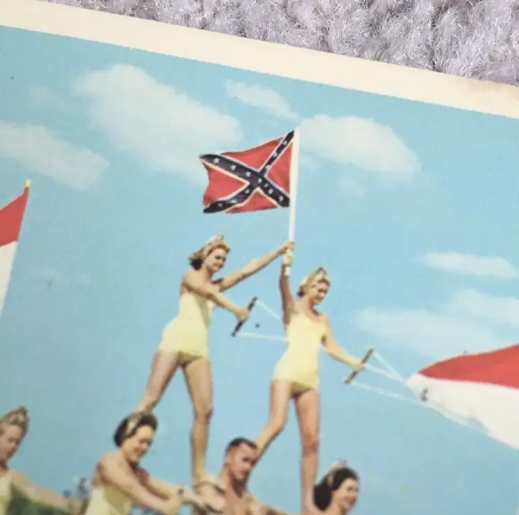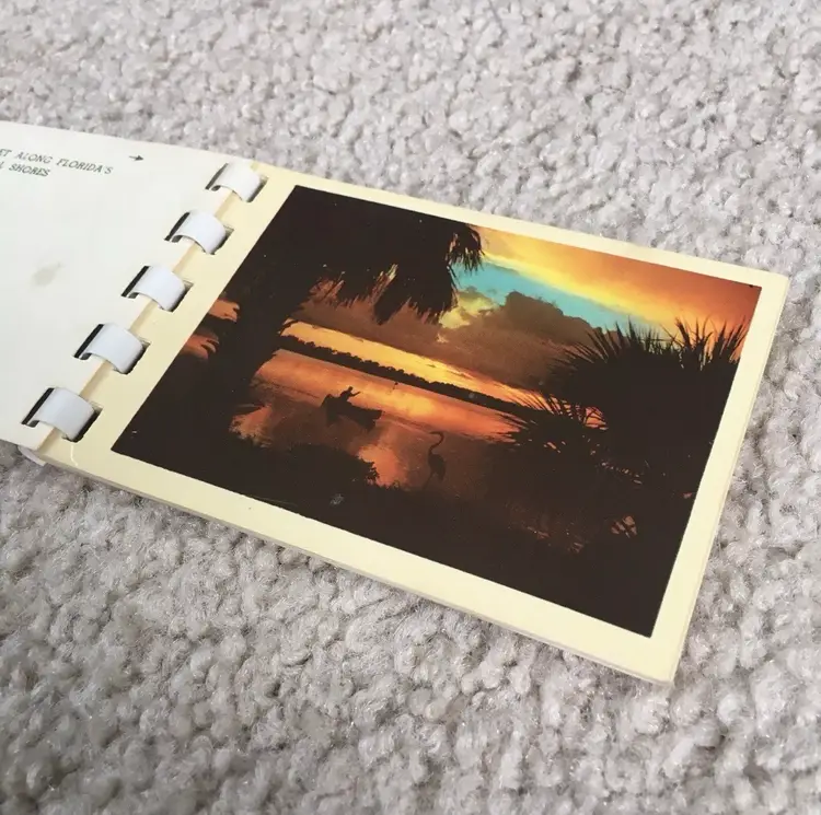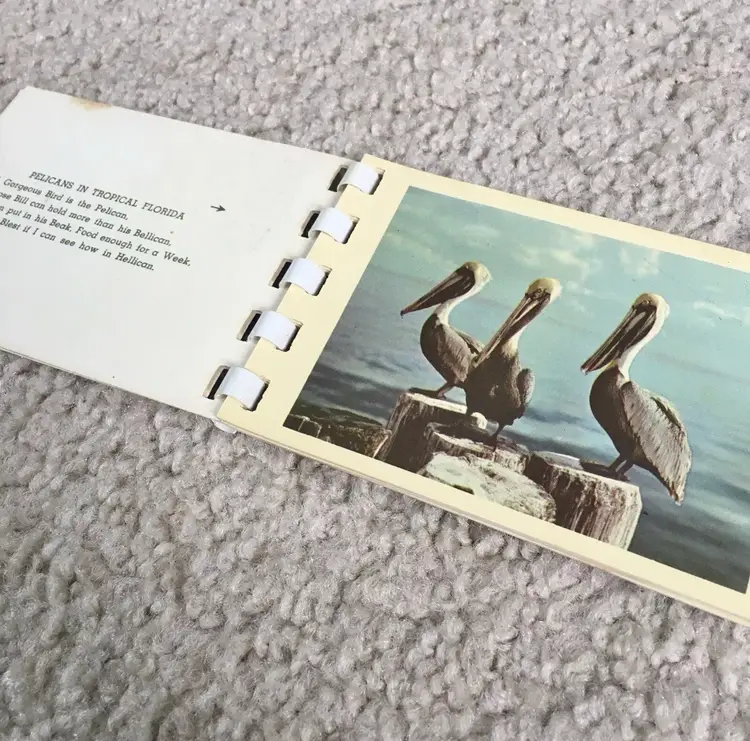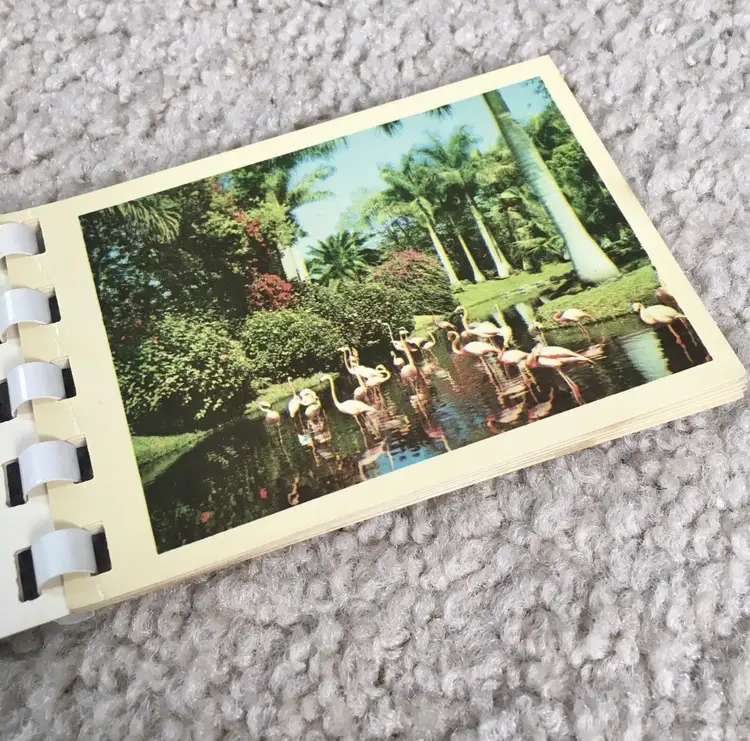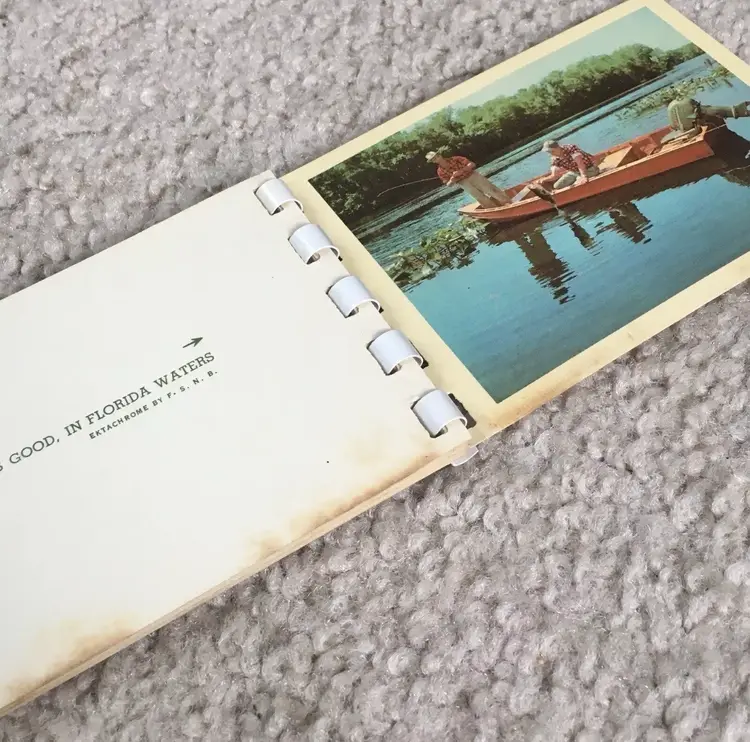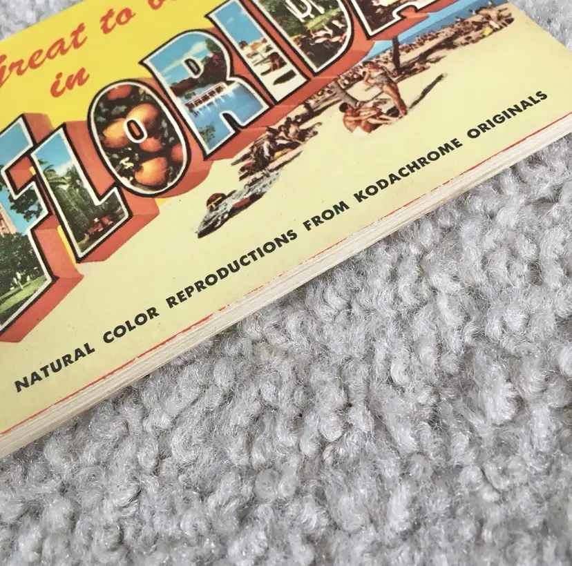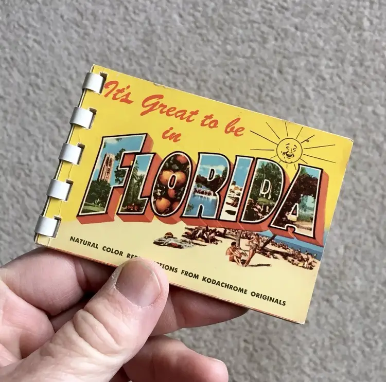 Vintage souvenir booklet of 10 color photos from original Kodachrome slides featuring various points of interest in Florida. Estimate this dates to the 1950s. Especially interesting is the waterskiing photo showing two women holding the Confederate flag of the south. Each photo has a corresponding description on the adjoining page. Item may be rare as I’ve not found another listed as available. Very good condition with some age spot foxing as shown. Measures about 4 1/8” x 2 3/4”. See pics for more details.