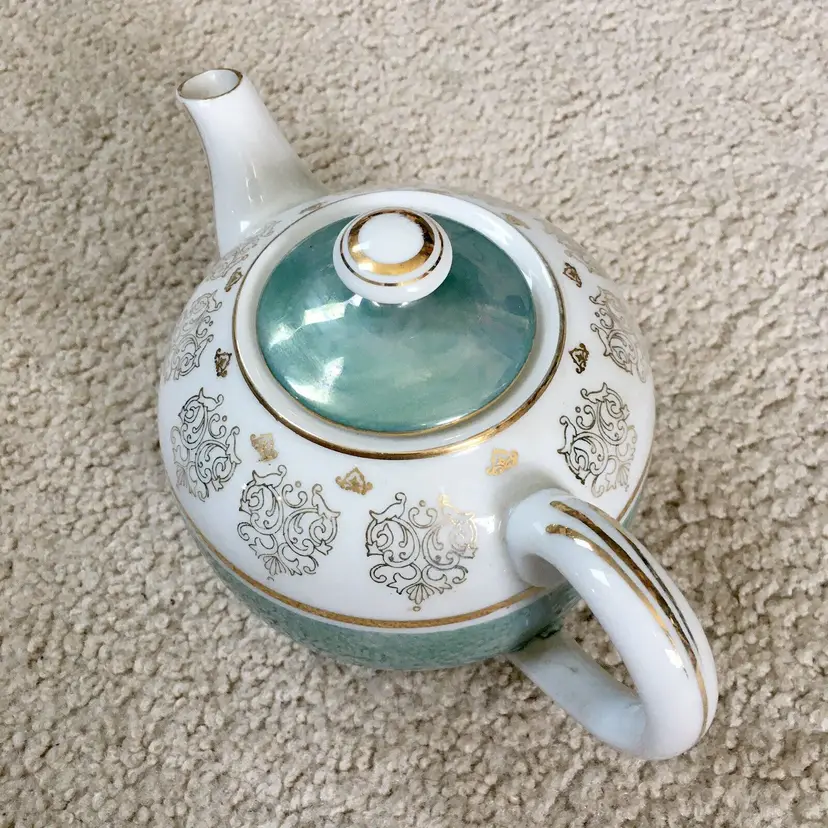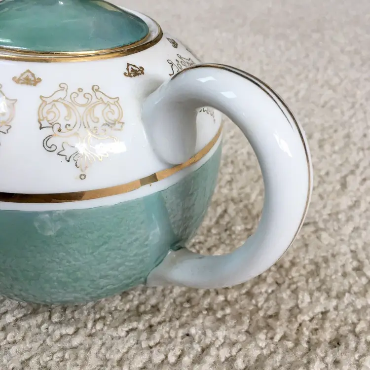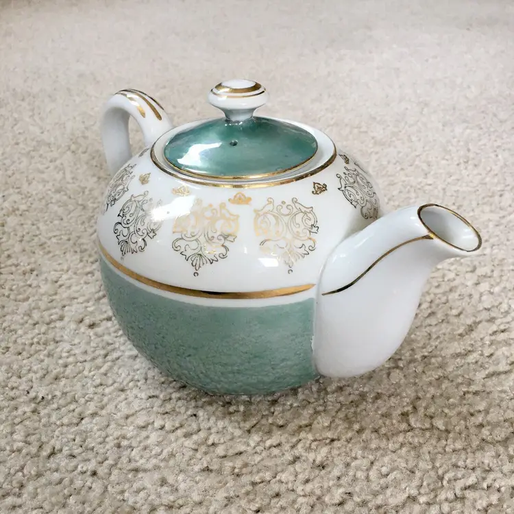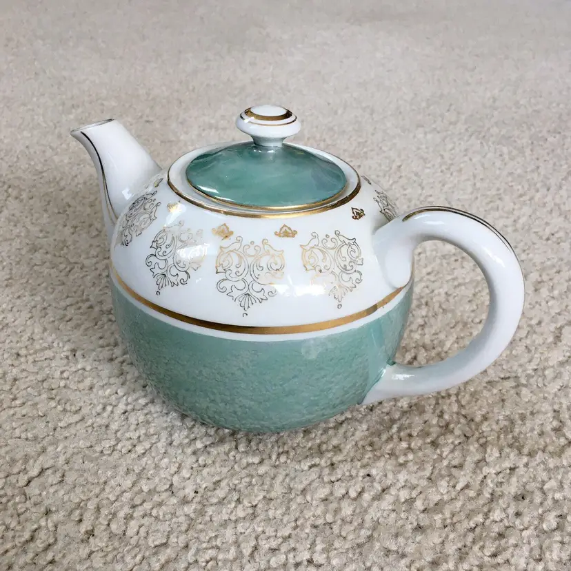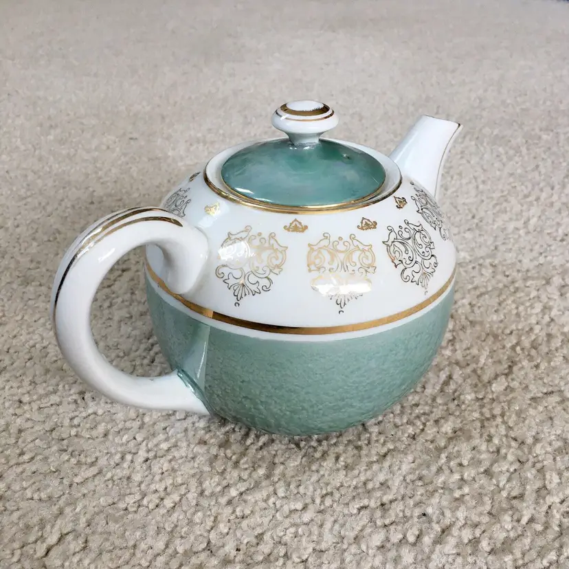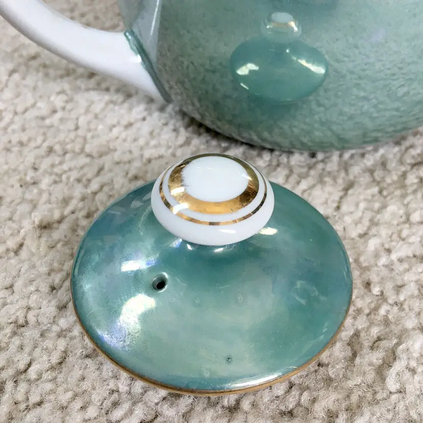 Vintage porcelain teapot made by UCAGCO CHINA in Japan. UCAGCO (United China and Glass Company) was based in New Orleans and New York, and was a creator and distributor of dinnerware and glassware. They also imported many Japanese china items during the 1950s. This teapot is hand painted in a beautiful teal blue-green color with gold trim and decoration. Very good condition with no chips, cracks or crazing to the porcelain. Displays Beautifully!! Some small color inflections from when originally hand painted. Diameter measures about 5” not including the handle or spout. See pics for more details and zoom in for closeups.